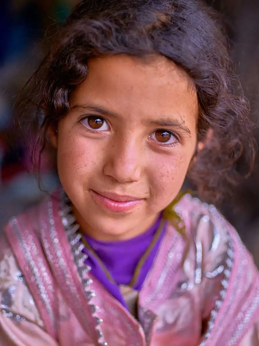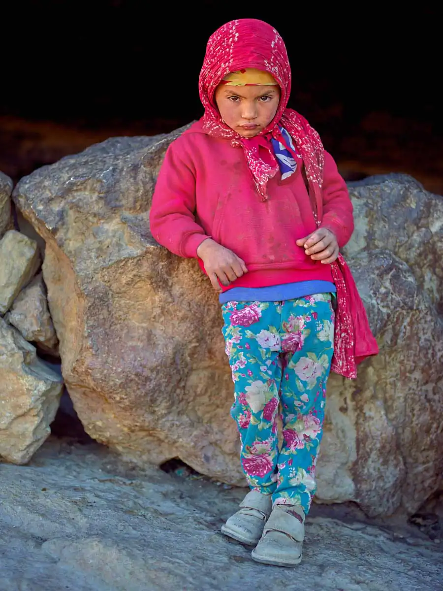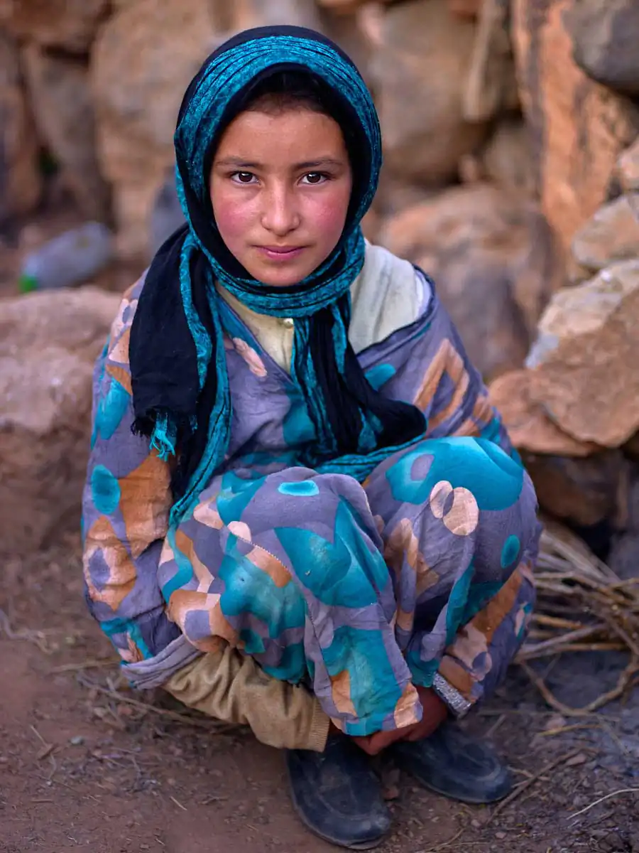 During the past year I’ve made several trips into the High Atlas region to locate families and photograph them. Women and girls have been the focus of my project. Sometimes it’s easy to find them, more often it’s a long off road drive and hike and then only through luck. Like any kind of portraiture, it’s about a connection and for a few brief minutes developing trust. For this reason I preferred women and girls for my project. The dynamic of flattery and humour sits more comfortably for both parties. There’s also the beauty of course. Women’s and girl’s eyes, make-up and clothing are hard to photographically resist. I tried to include as much context as possible without diminishing the power of the close-up. I chose to keep it simple and that for me in portrait terms is the subject before me acknowledging the camera.