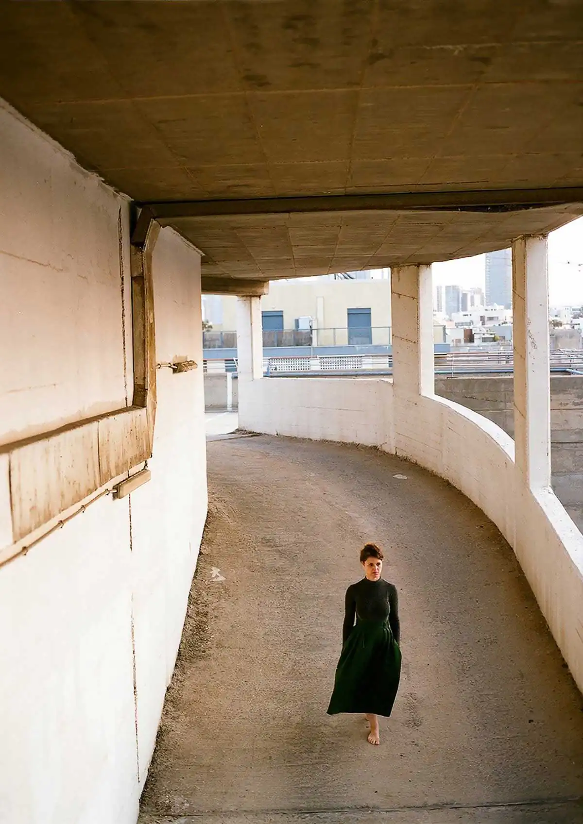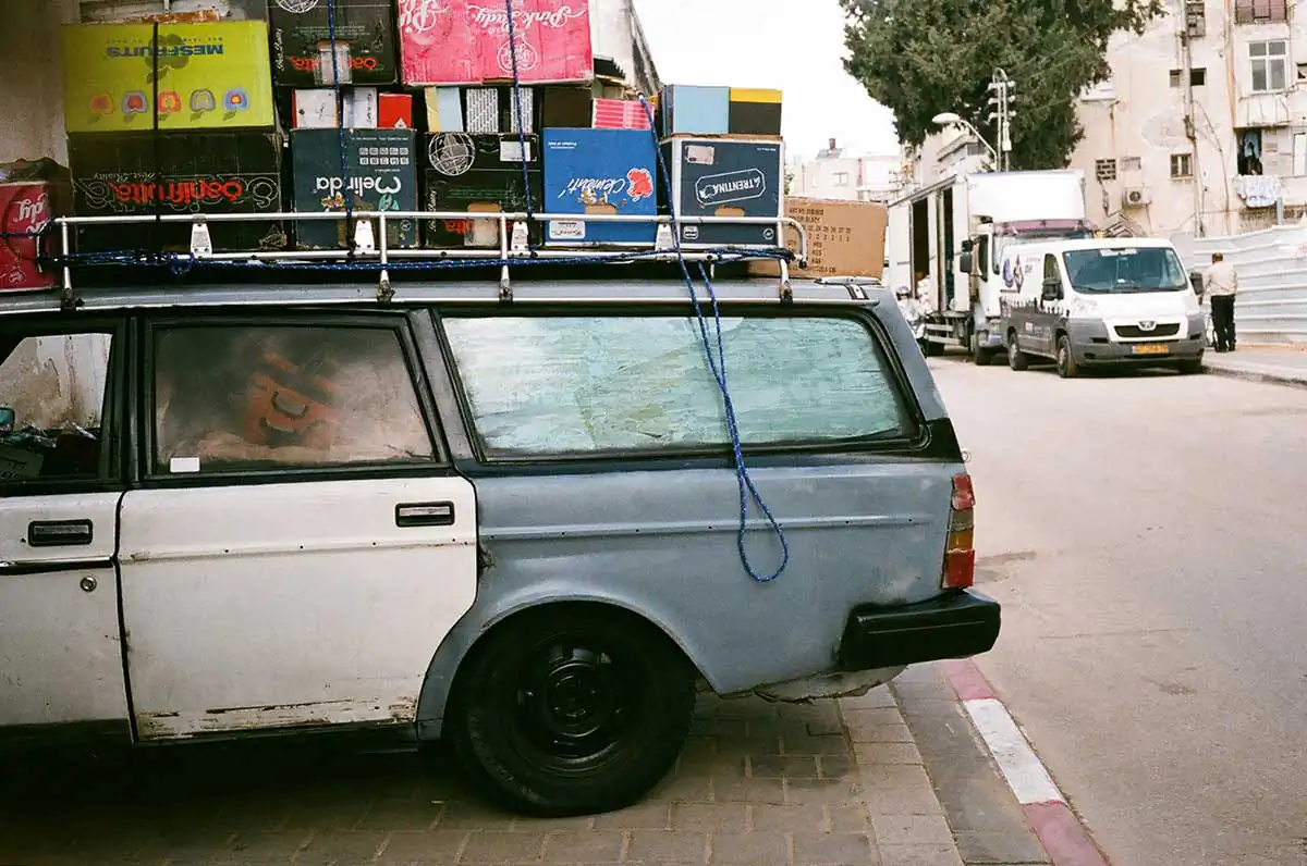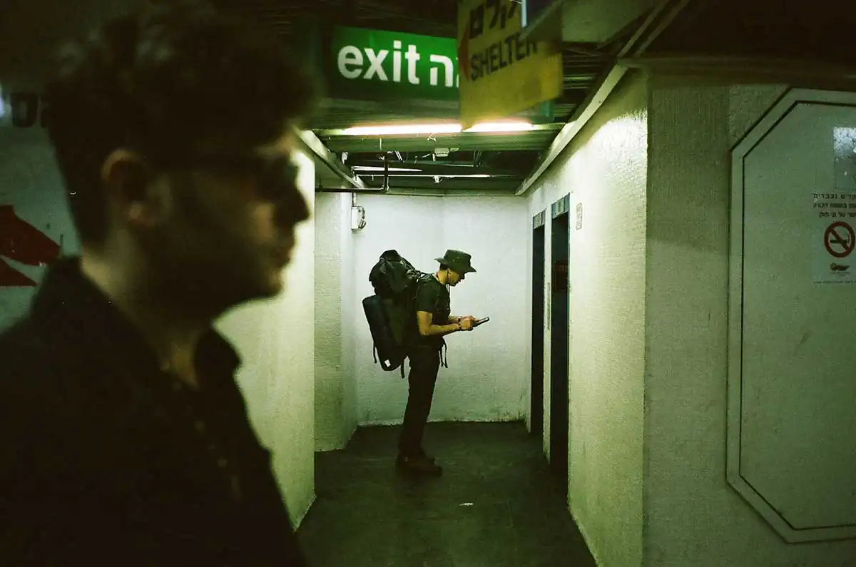 The picture of artist Dafna walking in the public parking, lot is part of a series of pictures related to our joint project.Another picture takes a moment of three friends sitting and laughing together, this is a moment before everyone flies to another place in the world, I really like the photographed situation.