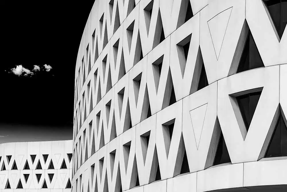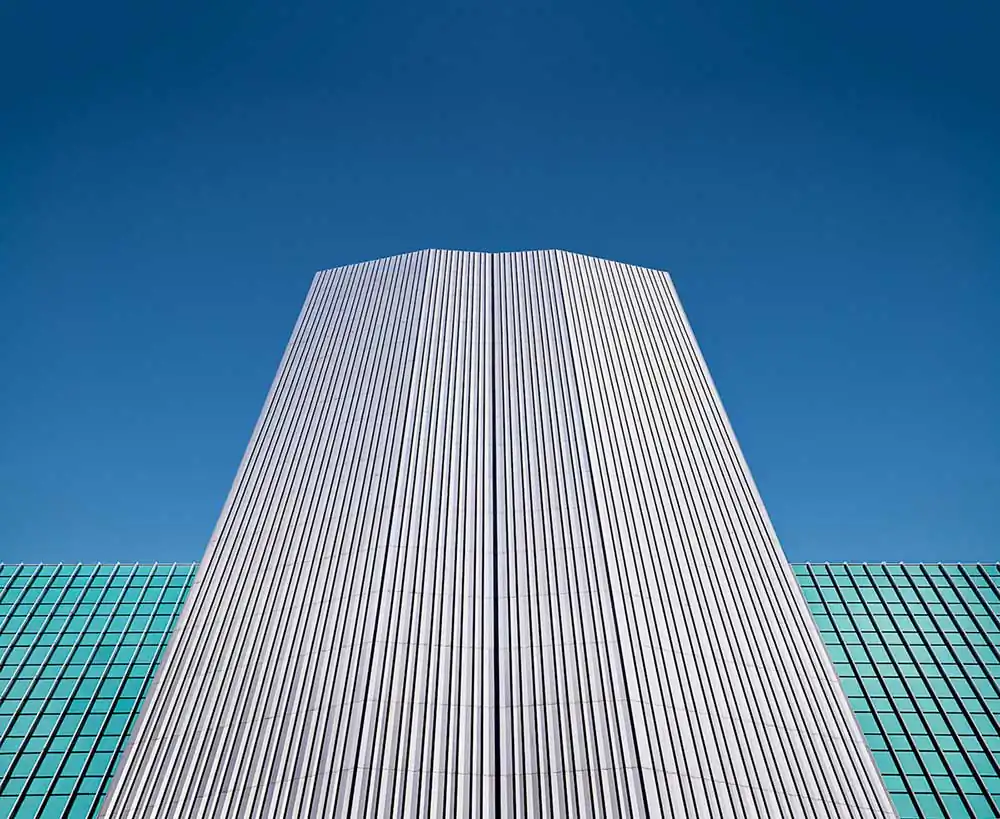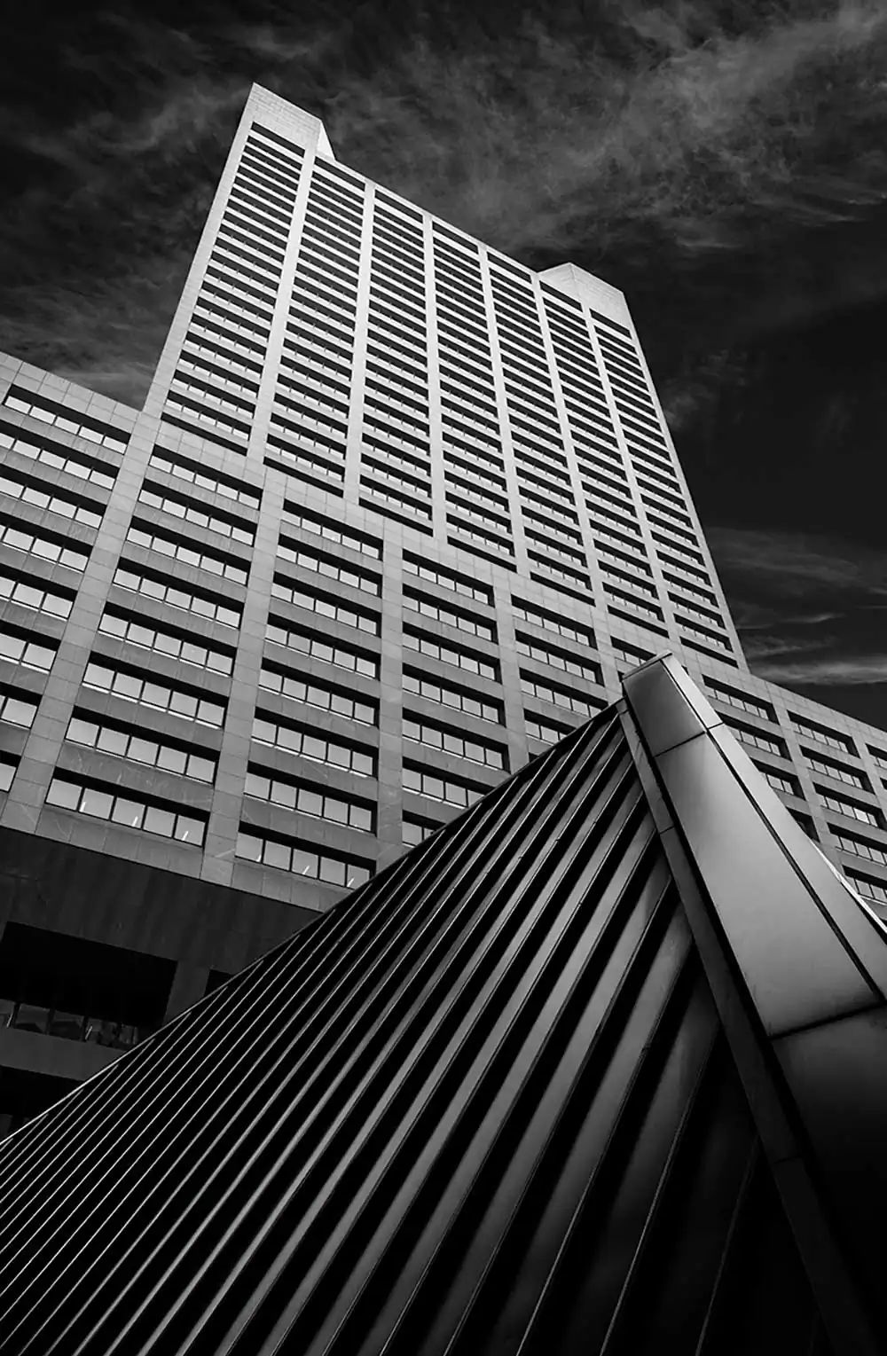 My interest and my eye have always been drawn to architecture; the clean lines and graphic elements of modernist and post-modernist, in particular. My process begins with the close examination of the subject, seeking interesting compositions of line, light, and texture. The scale ranges from vignettes of small aspects of a structure, to the entire edifice. Utilizing digital capture, the images are then meticulously reworked in Photoshop to emphasize the compositional elements and remove distractions, while leaving intact the original composition. The end result is to reveal to the viewer the often overlooked beauty of the built environment that permeates our lives.