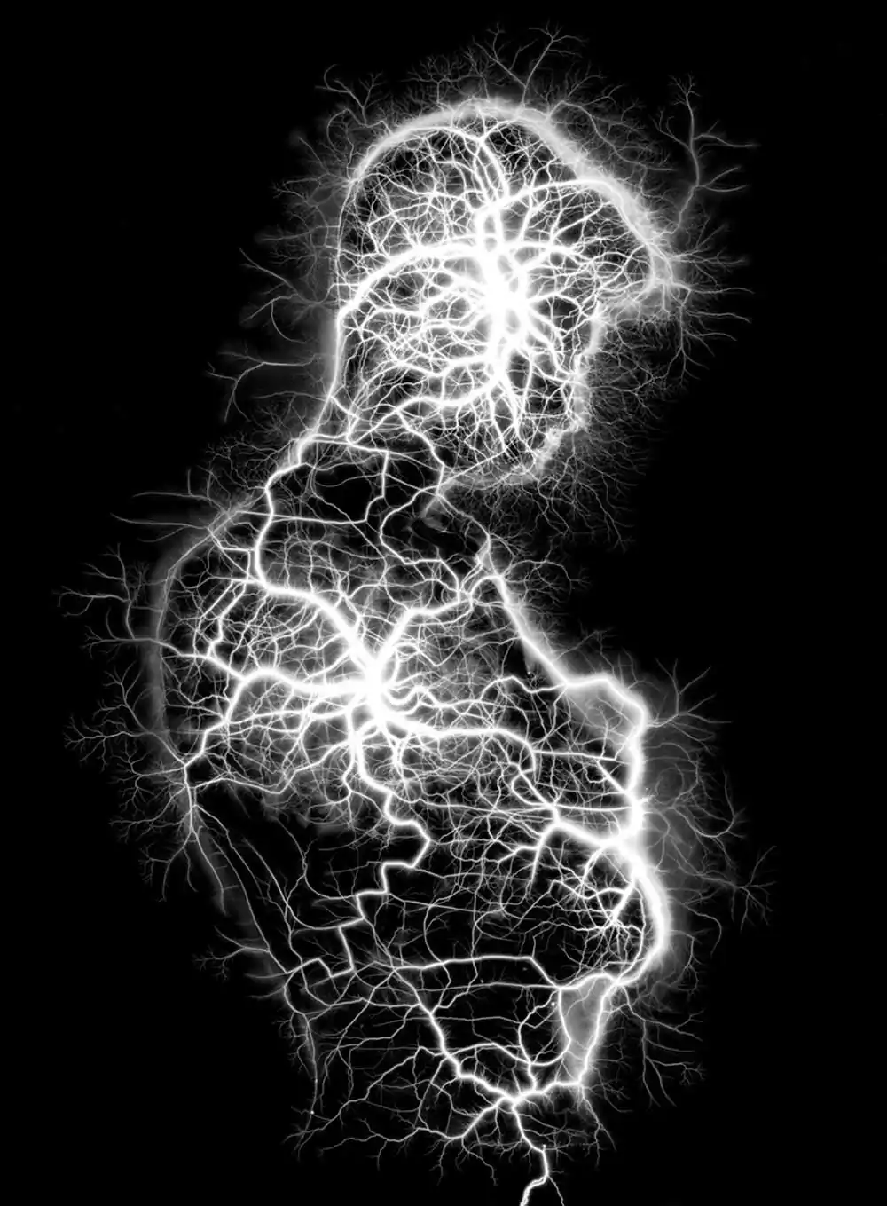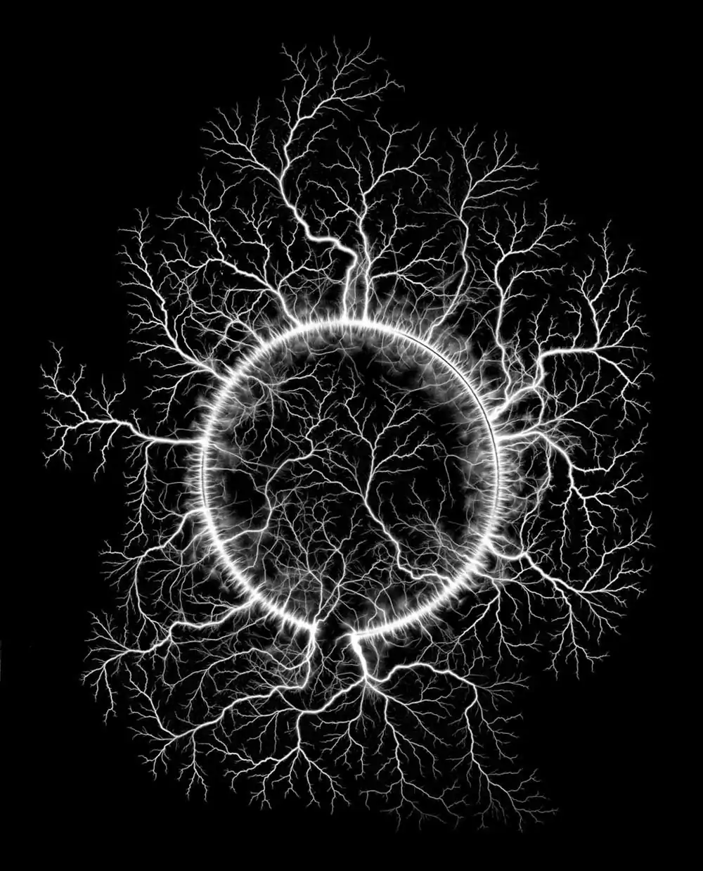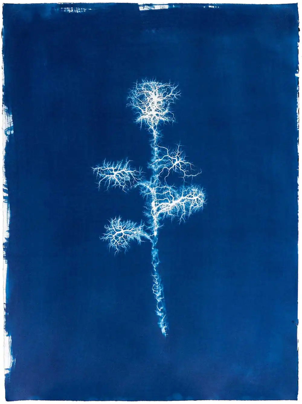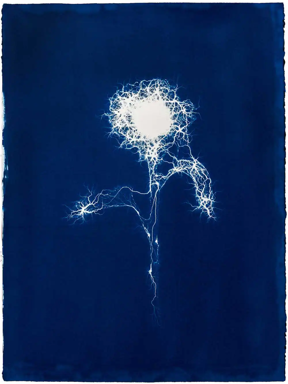 These photographs are the result of a research process initiated in 2005. The images were created by applying a high voltage current directly on the photosensitive material to be later positivized on baryta paper or by contact on cyanotype. Consequently, the process is completely analog. Each representation thus obtained is a unique and unrepeatable fractal image that I control to create portraits of people and flowers; a metaphor of the functioning of the real in the different levels of its existence, from the greatest to the smallest. The term Melothesia that titles the series designates in Greek the affective relation by affinity between all things, terrestrial and celestial, that populate the universe.