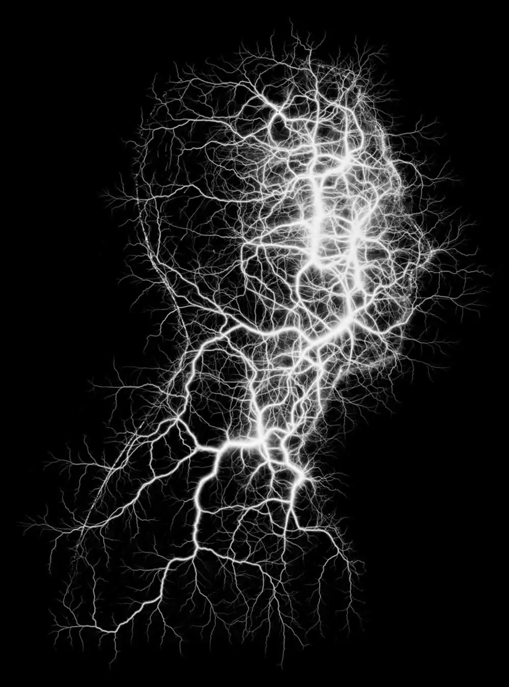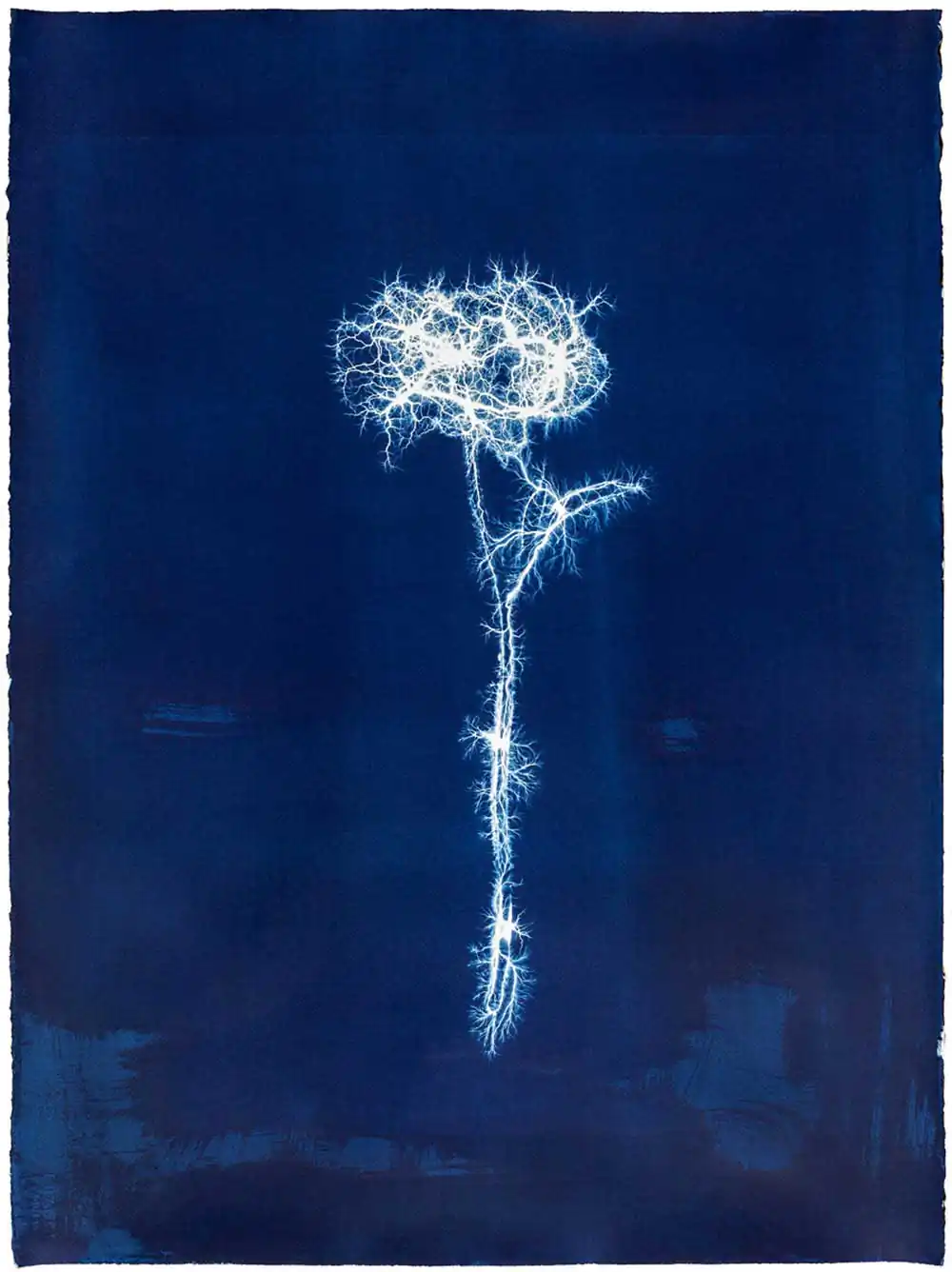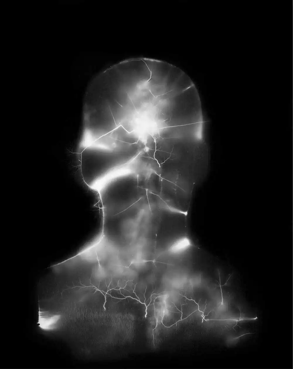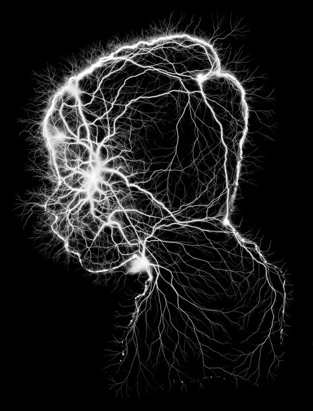 These photographs are the result of a research process initiated in 2005. The images were created by applying a high voltage current directly on the photosensitive material to be later positivized on baryta paper or by contact on cyanotype. Consequently, the process is completely analog. Each representation thus obtained is a unique and unrepeatable fractal image that I control to create portraits of people and flowers; a metaphor of the functioning of the real in the different levels of its existence, from the greatest to the smallest. The term Melothesia that titles the series designates in Greek the affective relation by affinity between all things, terrestrial and celestial, that populate the universe.