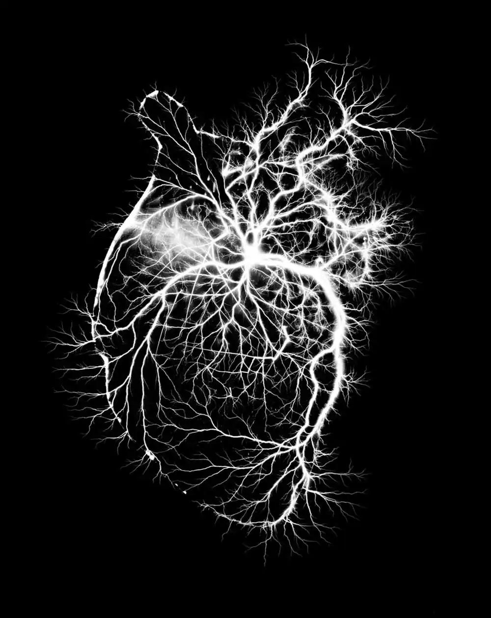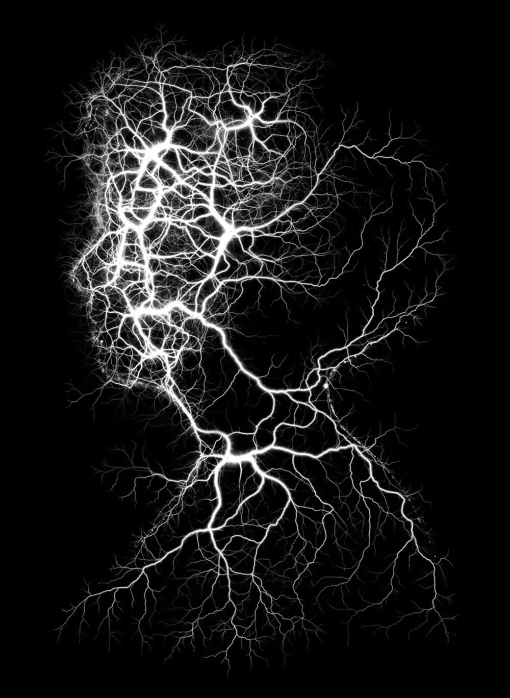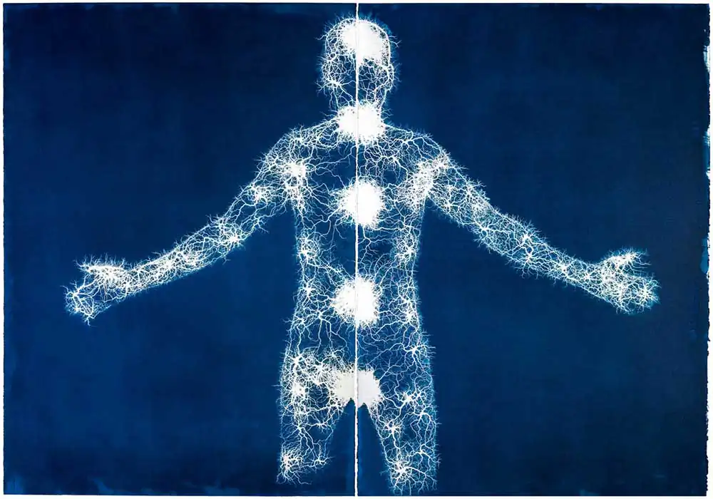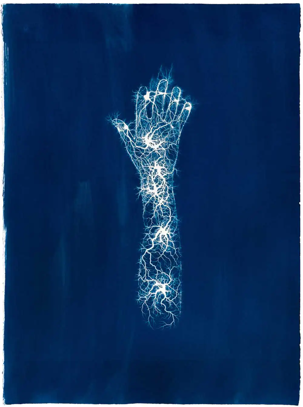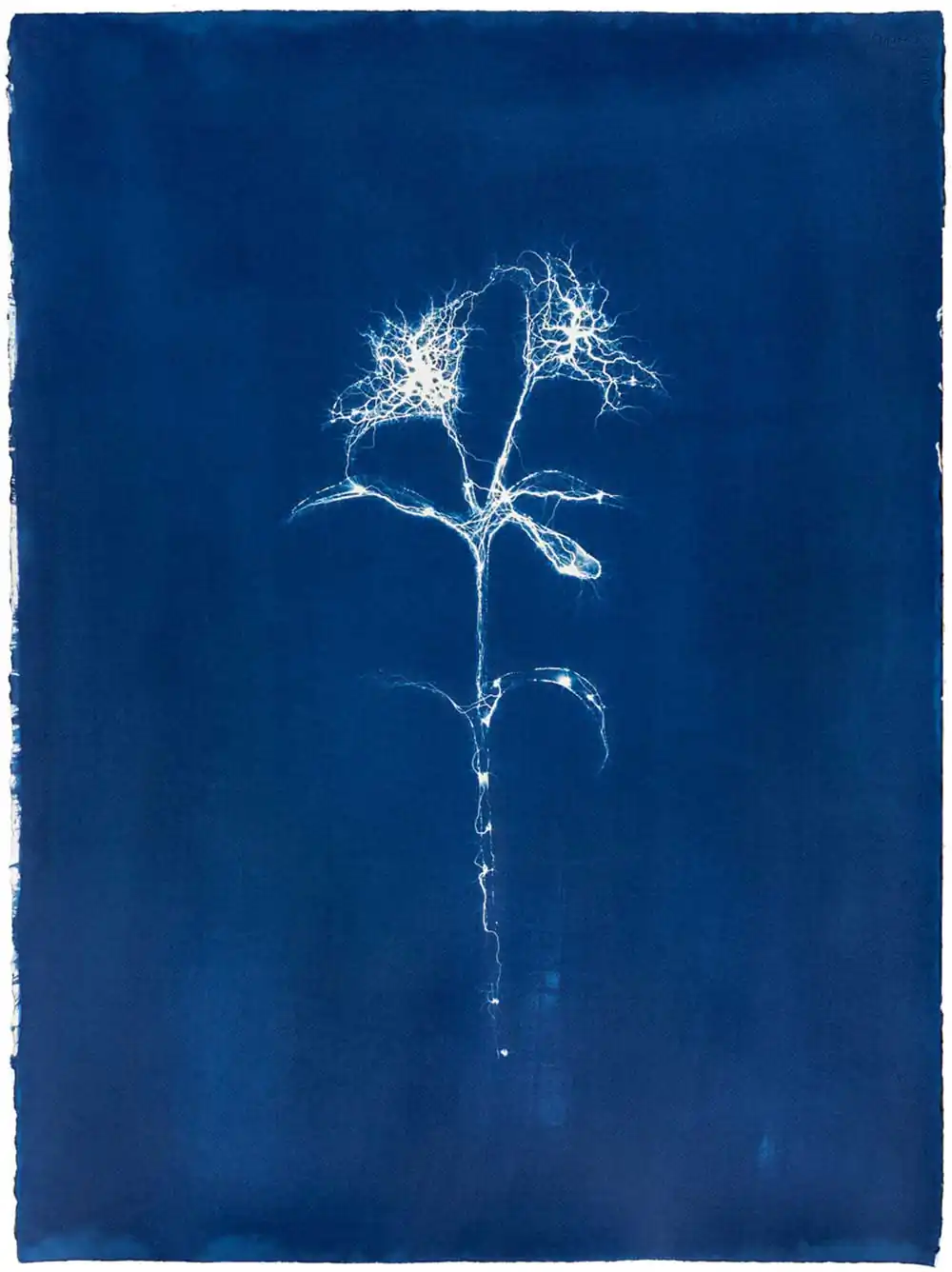 These photographs are the result of a research process initiated in 2005. The images were created by applying a high voltage current directly on the photosensitive material to be later positivized on baryta paper or by contact on cyanotype. Consequently, the process is completely analog. Each representation thus obtained is a unique and unrepeatable fractal image that I control to create portraits of people and flowers; a metaphor of the functioning of the real in the different levels of its existence, from the greatest to the smallest. The term Melothesia that titles the series designates in Greek the affective relation by affinity between all things, terrestrial and celestial, that populate the universe.