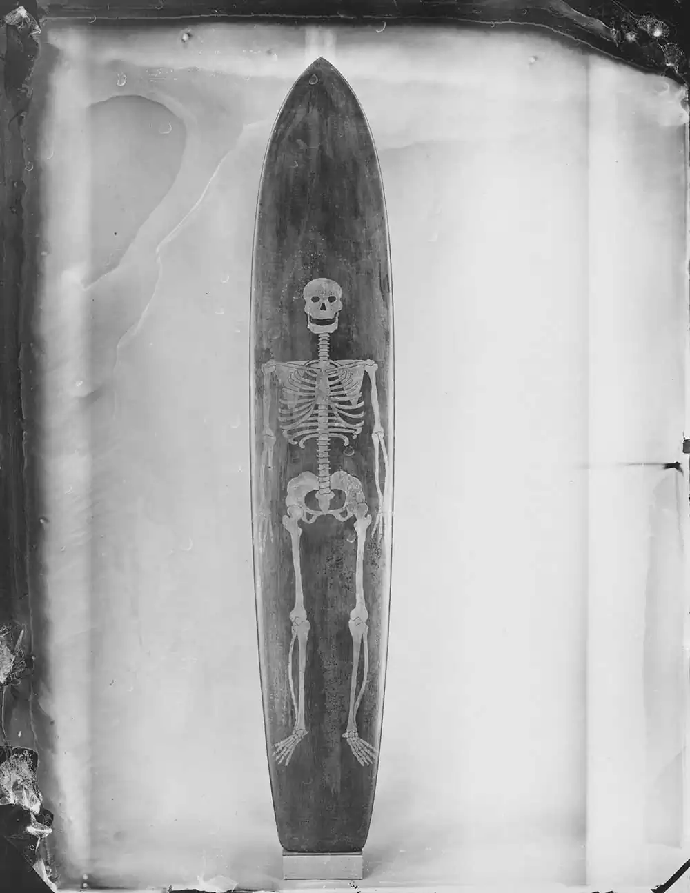 An altogether different type of portrait is presented by Joni Sternbach. For her series Surfboards, the photographer plucks surfboards out of their beachside context, and photographs them completely isolated and centered on plinths, in a space reminiscent of a portrait studio. Here, Sternbach utilizes the wet-plate collodion process to good effect, visually teasing out nuances of form, material and embellishment. The human experience is very present though, with the photographer describing the boards as bearing “the imprint, a scar of the person who rode them.” Contact-printed onto silver gelatin paper, the photographs are intimate and quiet.