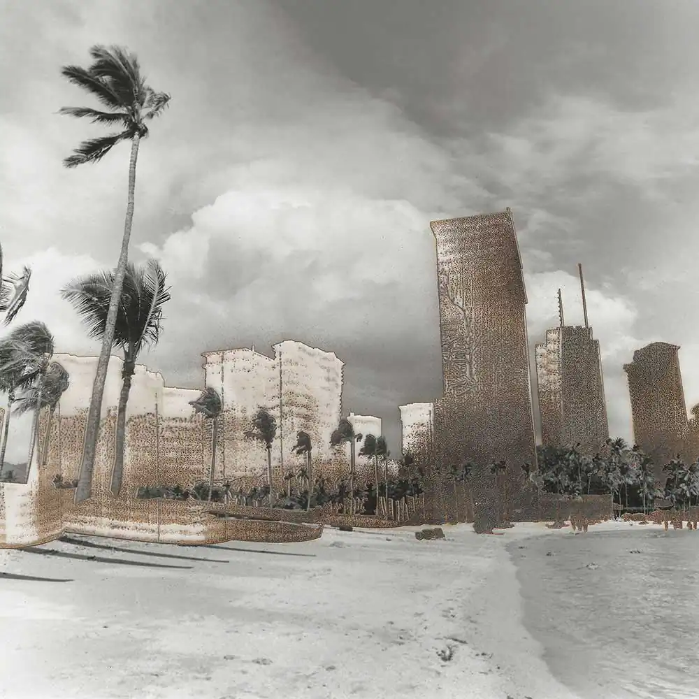 There is a certain level of quietness in the work of Leah Schretenthaler as well; despite the combative title of the series—The Invasive Species of the Built Environment. The photographer presents a contrary view of Hawaii’s palm tree-lined beaches, focusing upon the effects of the built environment on the landscape. She does this by laser-cutting those structures out of black and white photographs of them. The small-scale silver gelatin prints are desecrated in the same way that the landscape is, leaving behind a cut-out scar in the paper, further marked with a sepia-like discoloration.