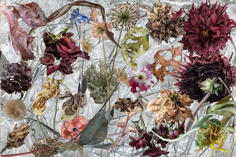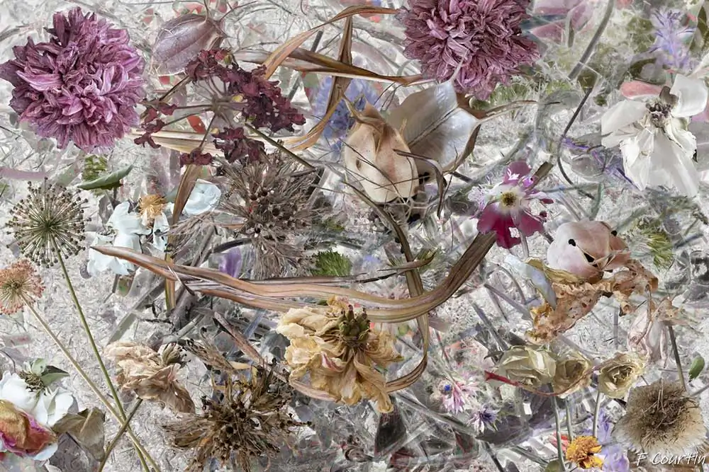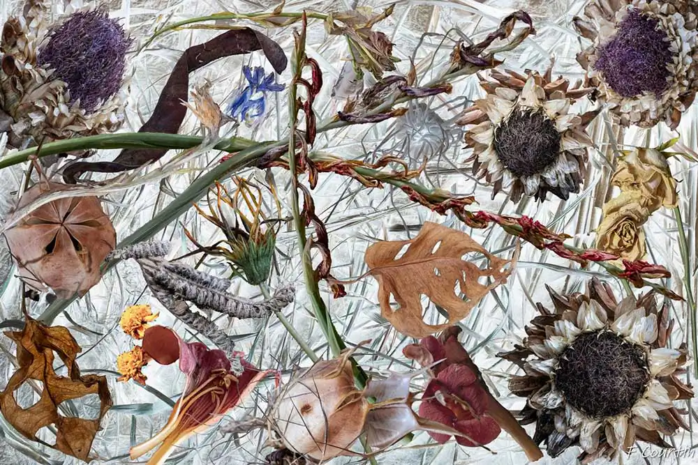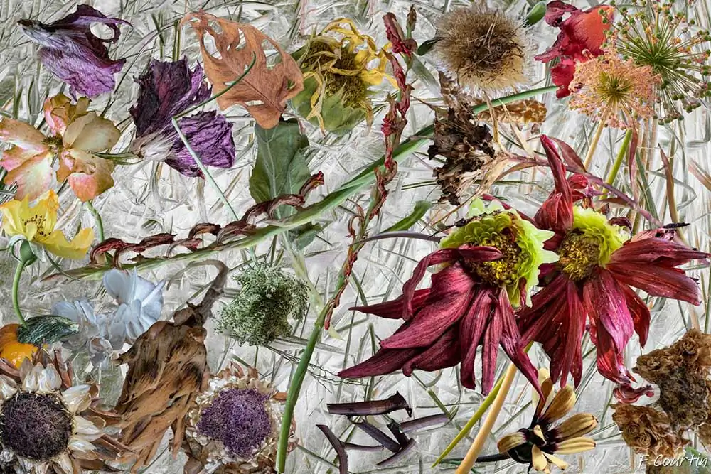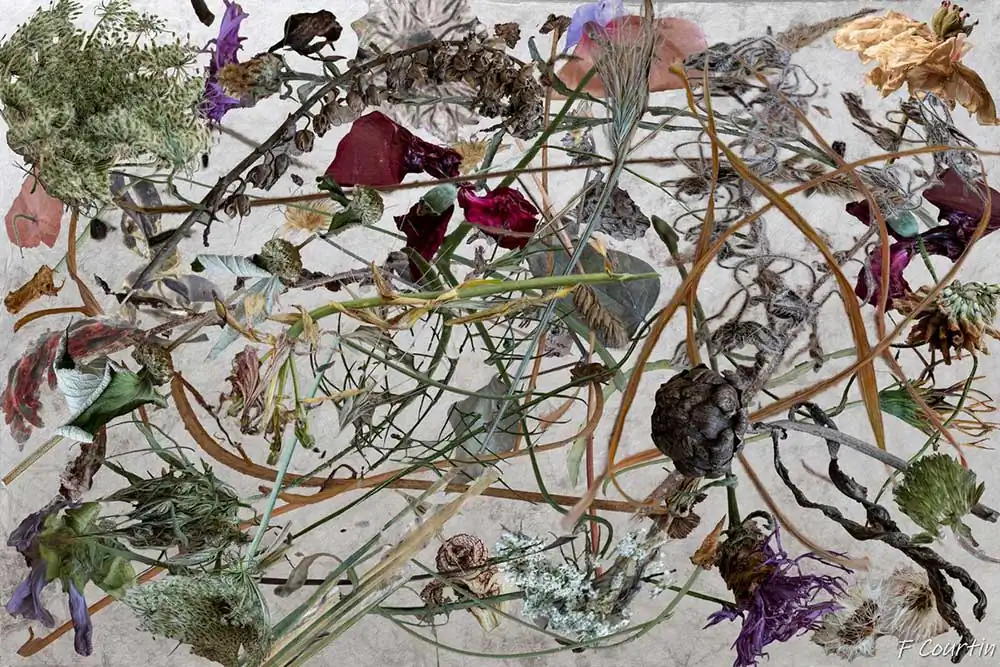 In 2023, while working on an exhibition project on the theme of “ruins,” Courtin came up with the idea of using faded plants as subjects, aiming to immortalize them before composting. Over several months, he created a photographic collection of dozens of flowers, leaves, and other plants, all faded or dried, and also crafted backgrounds with twigs and small pieces of wood. Most of the photographed flowers came from his garden, friends’ gardens, or the surrounding countryside. Using Photoshop, he then assembled his “plant tableaux” according to his imagination, adding elements one by one until achieving a harmonious overall vision.
