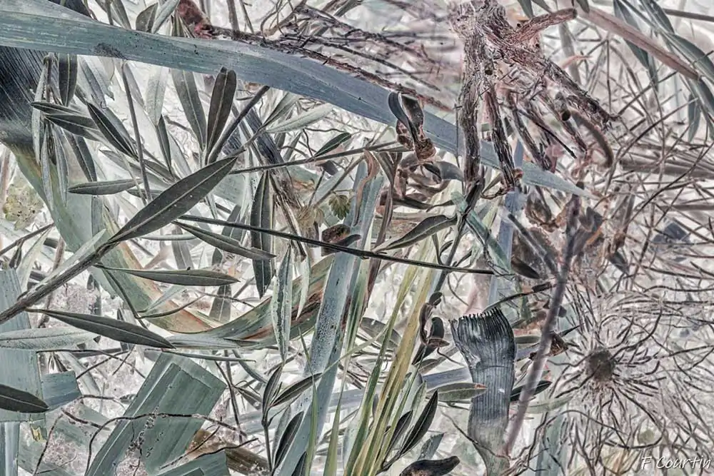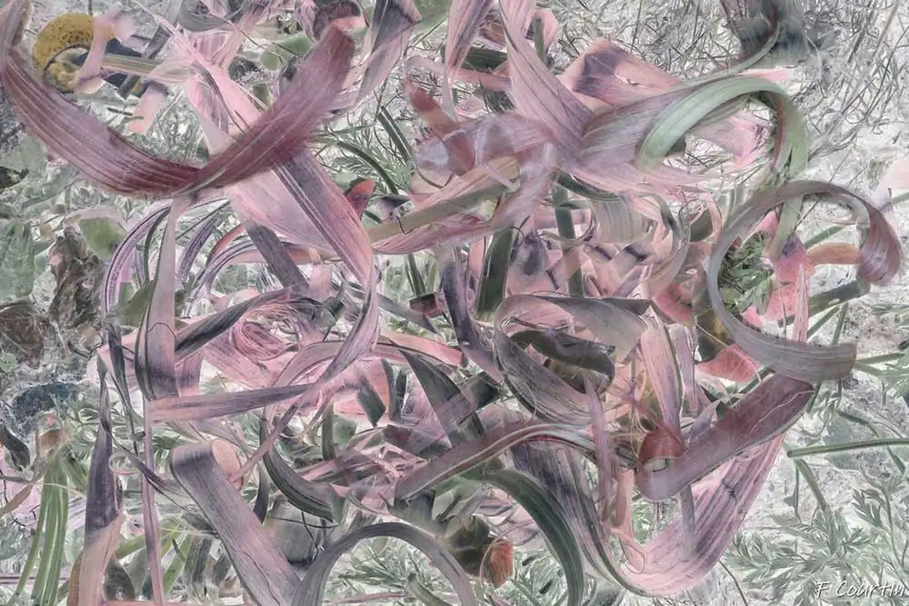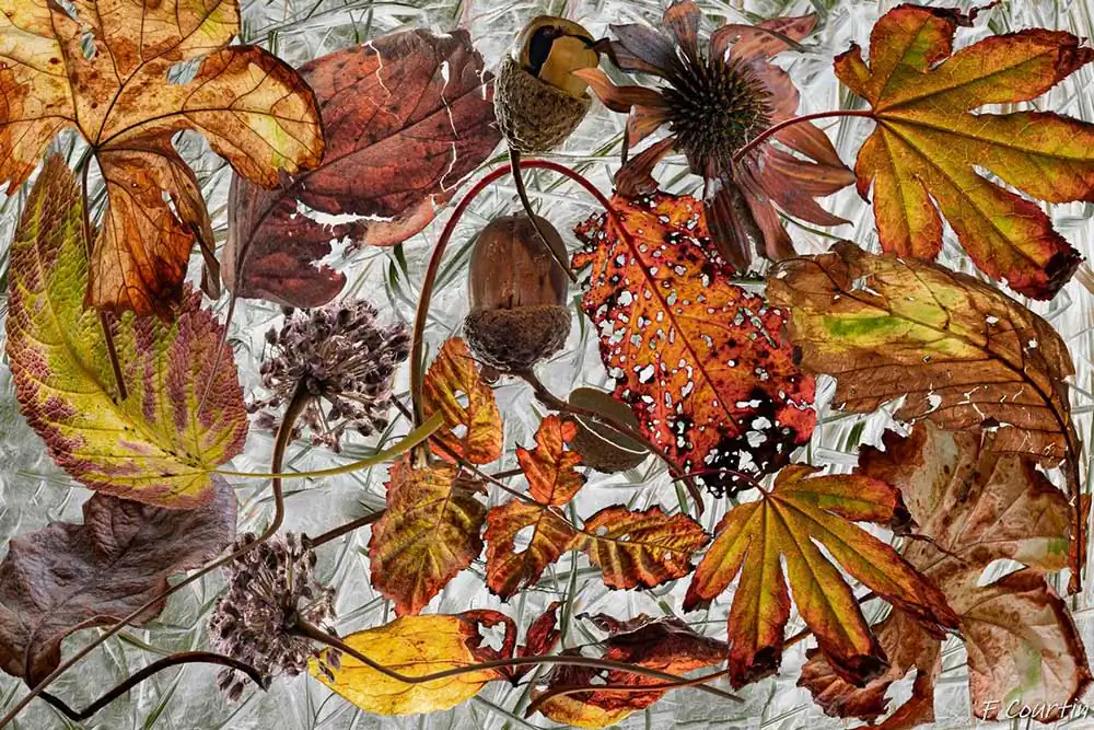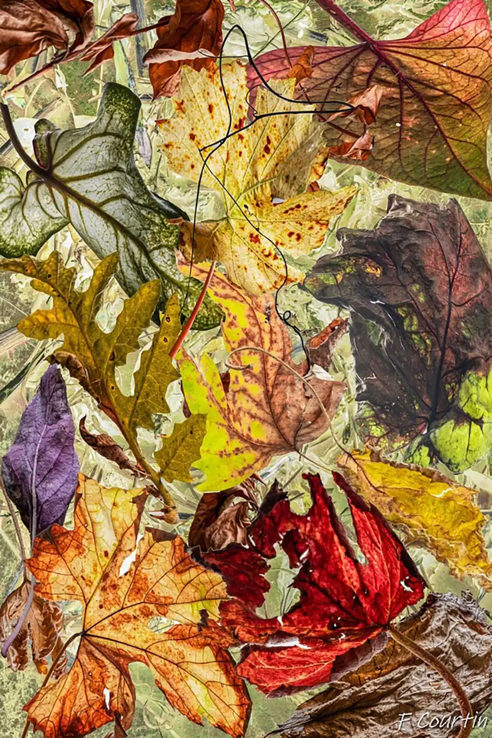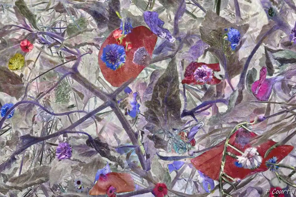 In 2023, while working on an exhibition project on the theme of “ruins,” Courtin came up with the idea of using faded plants as subjects, aiming to immortalize them before composting. Over several months, he created a photographic collection of dozens of flowers, leaves, and other plants, all faded or dried, and also crafted backgrounds with twigs and small pieces of wood. Most of the photographed flowers came from his garden, friends’ gardens, or the surrounding countryside. Using Photoshop, he then assembled his “plant tableaux” according to his imagination, adding elements one by one until achieving a harmonious overall vision.
