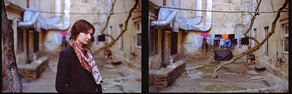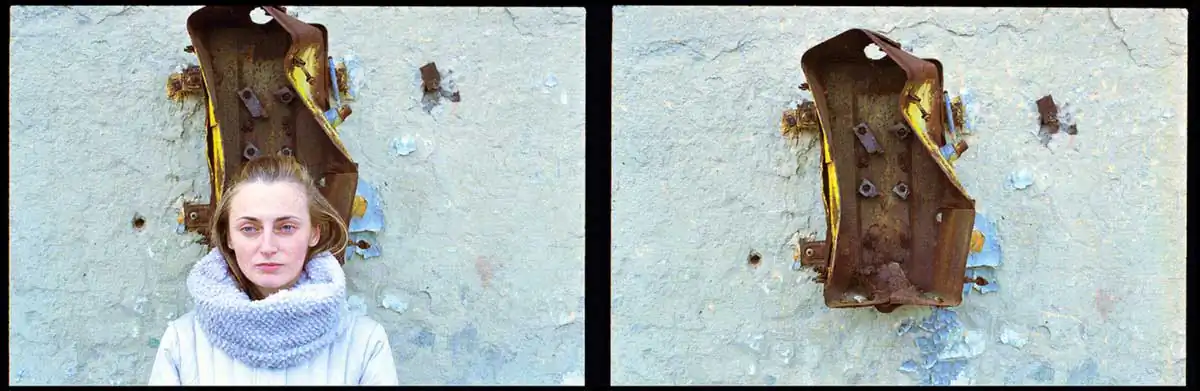 From the other hand, one can say that I photograph no person, but the space around it and this is not interesting for portrayed. C’est La Vie, but it is my personal style. Thus, I begun to investigate the proportion between individual and common, in other words, the object of my investigation was the interaction between human and environment. I used analog photography partly because it more convenient for me, and partly because it offers me the unexpected result. Also it offers the opportunity not to change the result during the process of making picture and thus I guess, the result is more vivificated, in other words, it more truly. Also such method restricted the opportunity to change the obtained result after photo-session. Formally, the body of my work consists of two pictures — one is portrait of the person and other — is the portrait of its environment and these two frames are placed side by side on one film. On the one hand, it is completely staged photography, because it performed in the genre of staged portrait of friends or strangers stopped on the street, and on the other – it is unpredictable as any photography. In fact, each single scan is diptych with two neighbor frames from one film one of which is portrait of person in the environment, and the second – the environment without the person. This is my humble attempt to study man’s place in the world around him, man’s place with him or without. What is differing in location depending of human presence, what changes happen in a person? Here are the questions of interaction of living and nonliving, human and space, which I try to give an answer.[Official Website]
