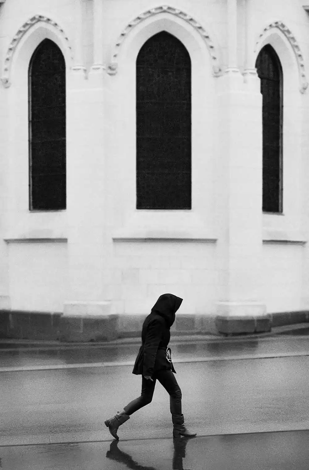 Often I spot the place first and position myself. It happened to me having spotted a precise frame then to remain the viewfinder glued to the eye several minutes, waiting for an “event”. This is how I captured this monastic silhouette moving in long strides under the ogival windows of a chapel. Or I pass a passer-by who inspires me, and I follow him for a few moments while watching for a favourable context. In spite of everything I usually come back empty-handed from my walks, it is not very important. I always take a lot of pleasure in walking on the wet cobblestones of my city with my eye on the lookout and a camera in my pocket, and that is the main thing.