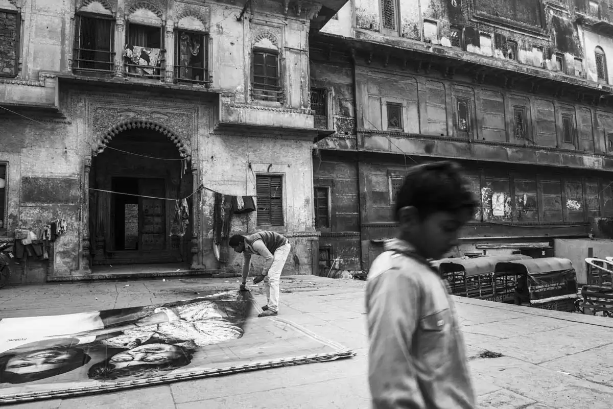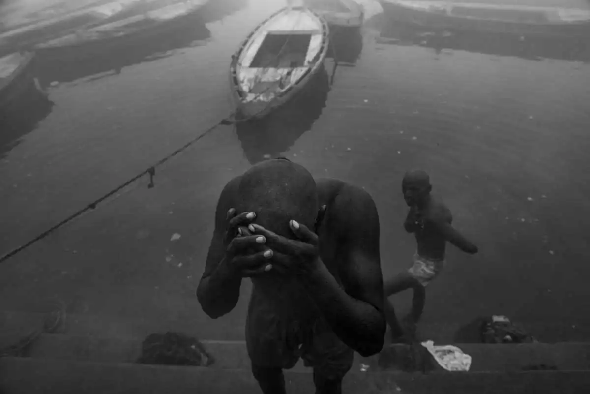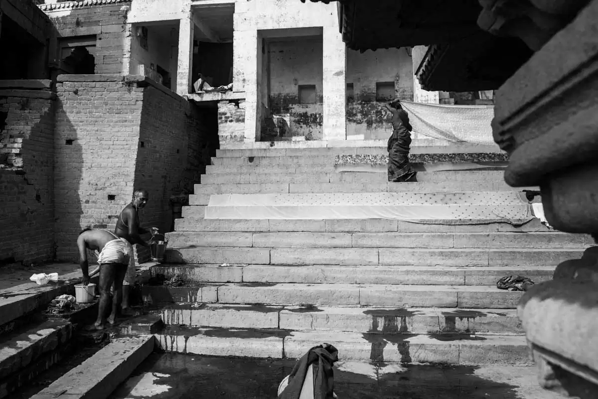 Men are preparing to attend the funeral ceremony at a ghat in Varanasi, Uttar Pradesh, India.