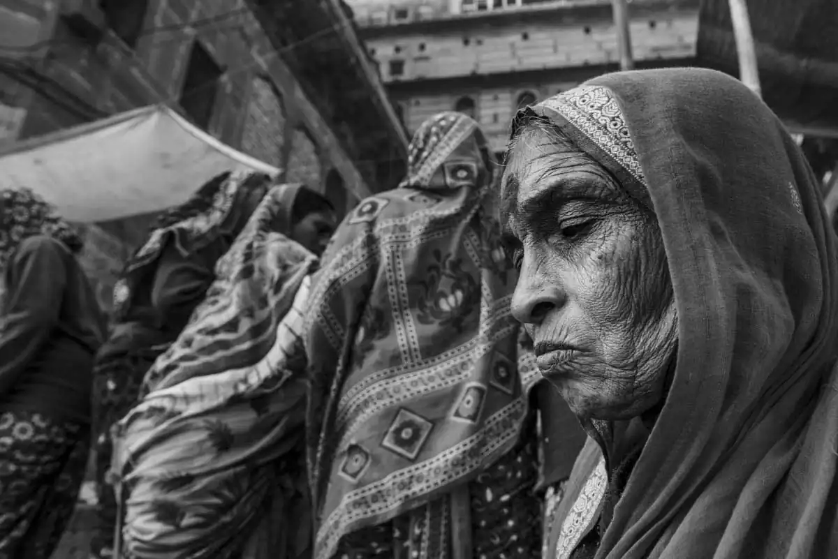 Woman who arrived to Varanasi for cremation of her loved one. On the ghats in Varanasi, Uttar Pradesh, India
