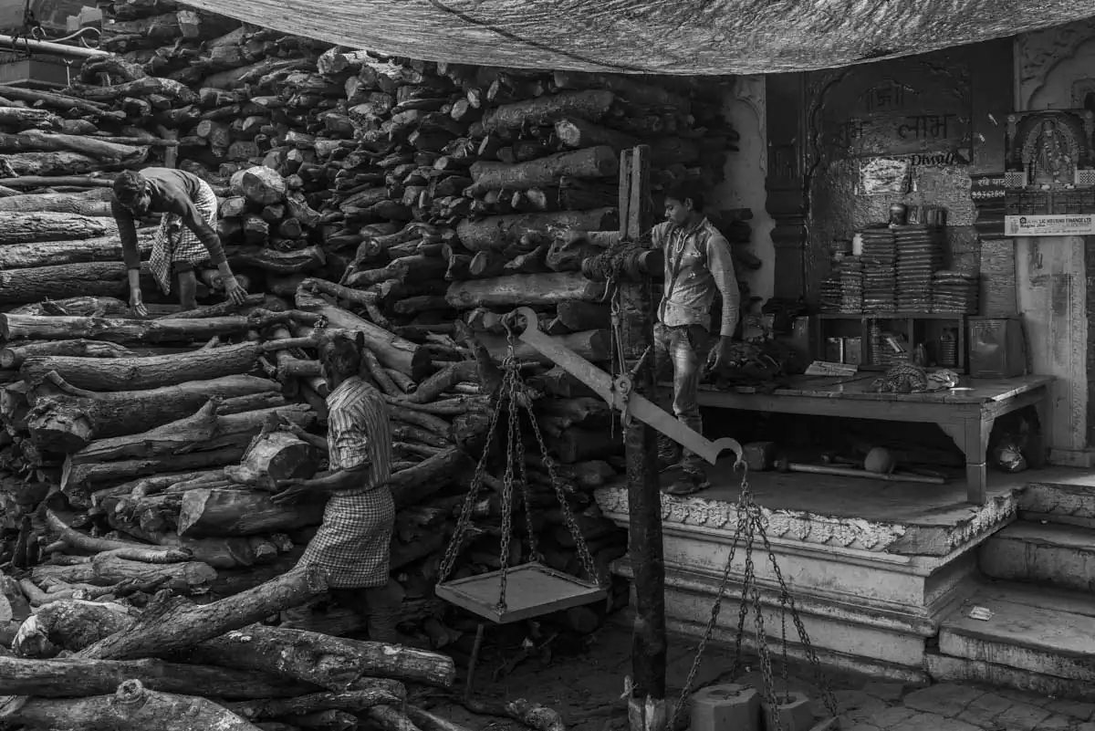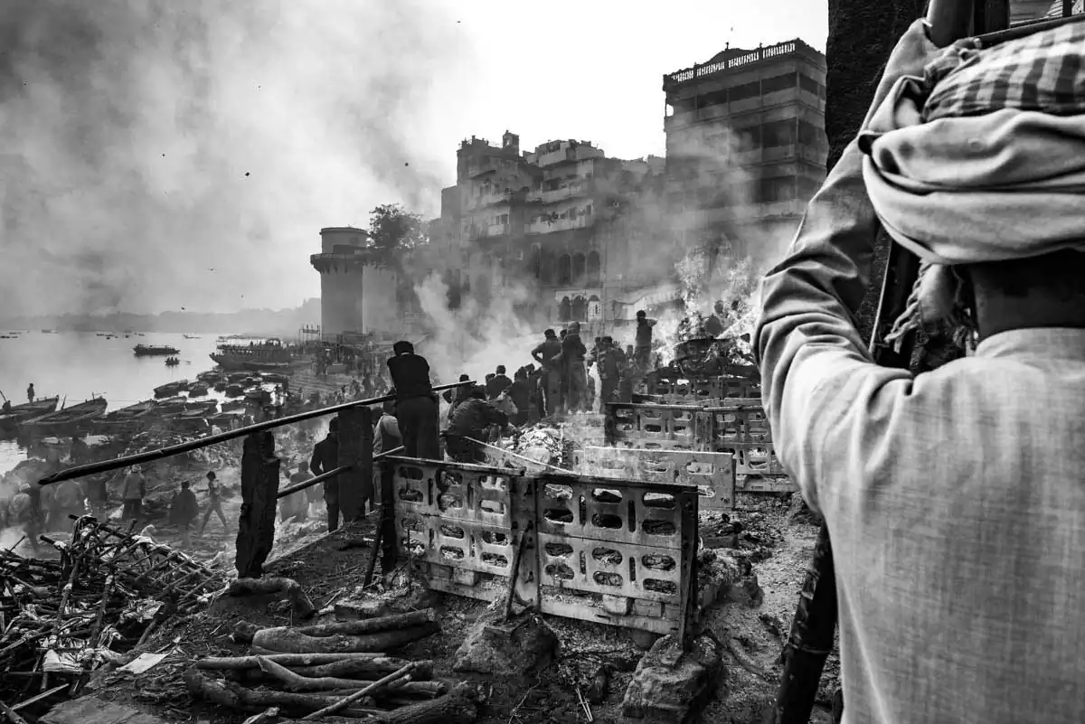 On the crenation Ghats, burning ceremonies (Antyeshti/ Antim Sanskar) take place 24 hours a day throughout the whole year. Over 300 bodies are subjected to cremation every day, wrapped in materials which come from the most distant parts of India. Corpses are appropriately anointed and prepared. The color of the shroud determines the gender and age of the deceased. Big toes are tied by a piece of string. Hands and both thumbs are tied together on the chest as if they are doing the namaskar (a traditional greeting from India or a gesture of respect). The whole procedure must be performed without movement or tears. Because of this woman don’t take part in the rituals as anxiety and hysteria disturb the souls from departing.