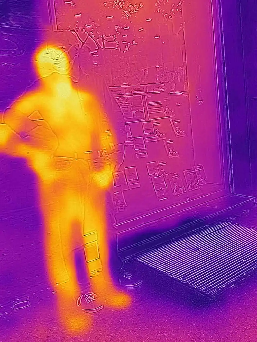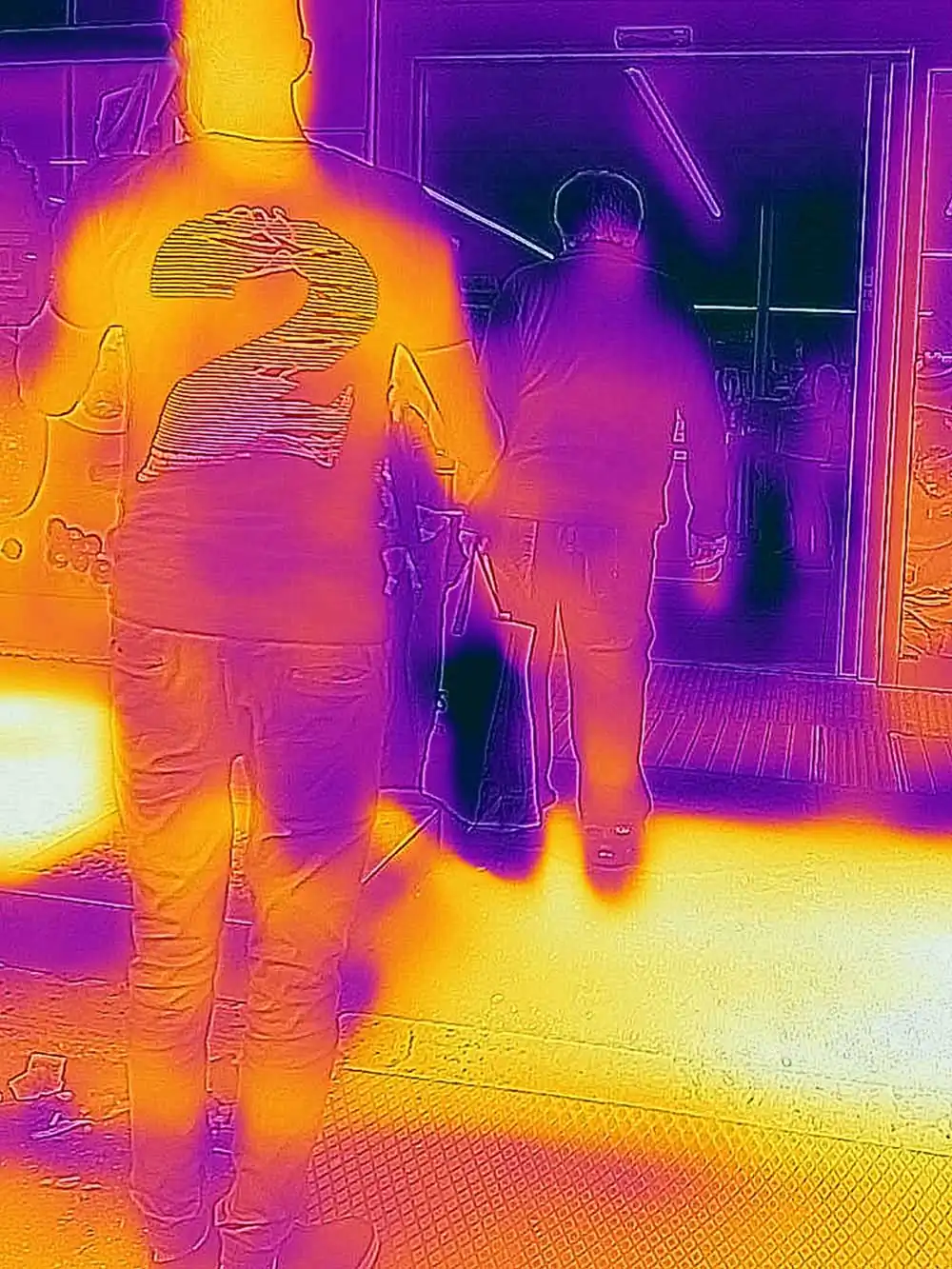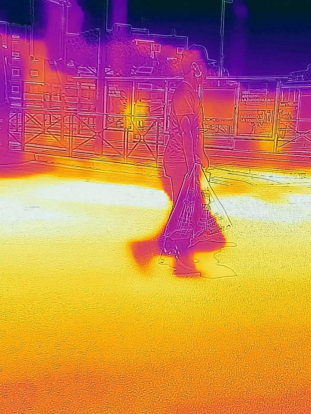 At 37.5 ° you enter the anti-Covid-19 control field (you cannot enter the workplace and in all those places where the temperature control at the entrance is in force). This is our life in these strange days and looking at the world with new eyes seems to be an obligatory path, to be taken with decision, not so much as a defense from the invisible (for that there are norms and common sense), but for understand our time. Staging a new kind of view is one of the possible paths: no longer (or not only) a world of light but a world of body temperatures, phosphorescent yellows, deep reds, intense violet. Giving a new contour to things by replacing light with temperature. Giving color to fear from a new point of view, to be able to look at it. The spectrum of human sight aligns with other frequencies, those of the virus. Suddenly we can see our souls. Notes: – The photographs were taken during the quarantine, and subsequent “phase 2” of the Covid-19 pandemic in 2020 in Rome, with a thermal camera, which combines the thermal spectrum with the visible image with a dual camera. – No digital post production has been performed. – There are a total of 20 images, 3 of which are exhibited as a “diptych” (see file No. 07-13-20).