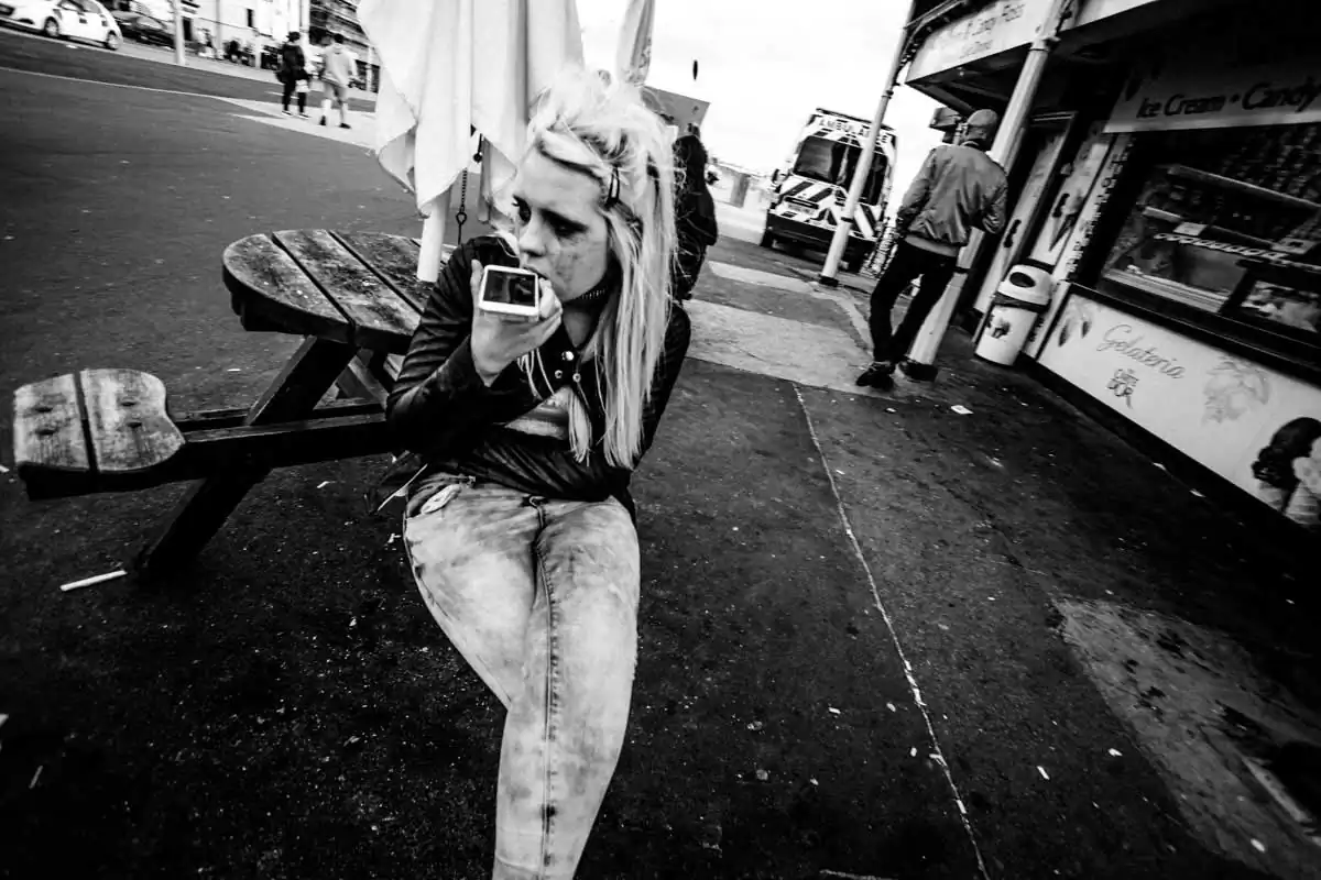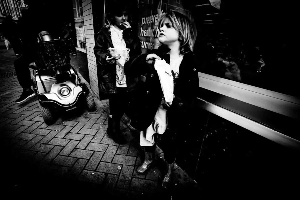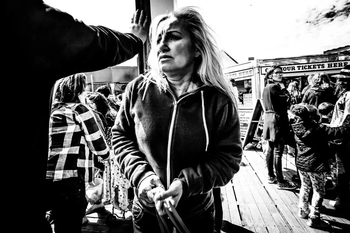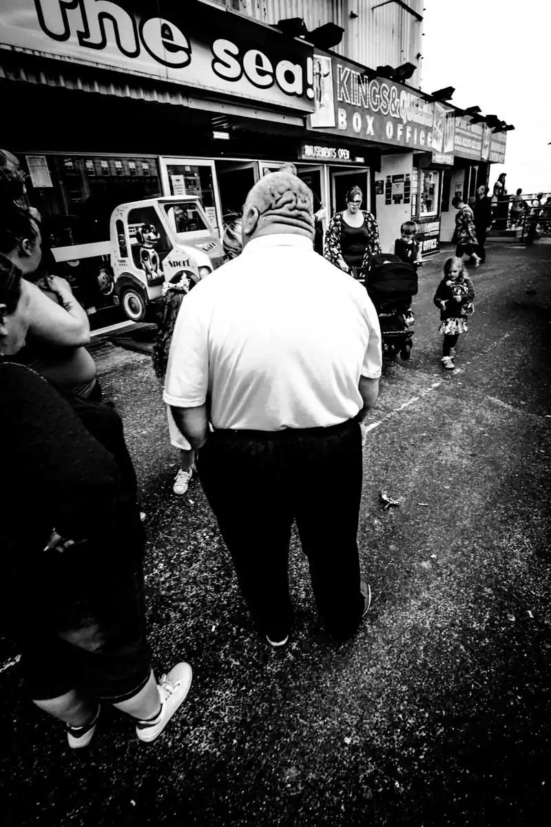 I am not interested in pure documentation or sensation. In this resort town, where crime and poverty rates make it a point of convergence for the cheerful and the destitute, I am not looking for emptiness, distress, or alienation. But to my surprise I seem to find it almost everywhere, in almost everyone I see. And I see this intensity of human gesture and expression more in the day than I do at night, when children are still up and about and their parents are still more or less sober. I discover that the dark side of Blackpool is better revealed in the light of day. I do not shy from confrontation. But building intimacy is not what I am after. I do not regard the streets as a space for intimacy but for immediacy. I meet my subjects head on. I spot them fast and photograph them even faster. Depending on their size and my proximity, I sometimes frame and shoot at waist level, which results in drastic and occasionally unforgiving angles. Life is unforgiving and the street has its own pace, which I intuitively follow. It is not a soft-hearted method but it isn’t callous either.