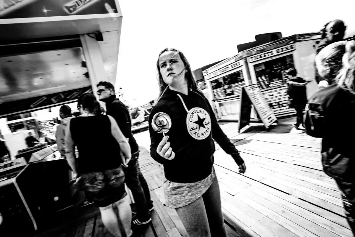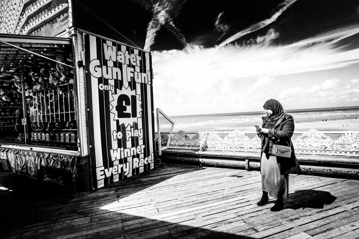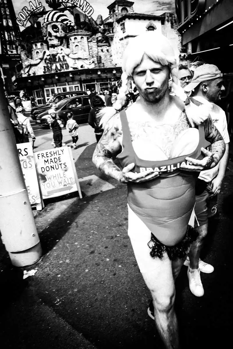 I take the plane to Manchester, the train to Blackpool. Rain is predicted, so I decide that photographing the storm at sea will be my consolation; little do I know that the sea will only seldom appear in my pictures. I had seen “The Last Resort” by Martin Parr but the work does not cross my mind as I set off on my journey to this whimsical hybrid of Coney Island and Las Vegas, where Elvis Presley is still alive and a miniature version of the Eiffel Tower soars above the Irish Sea. I have no expectations of Blackpool and no preconceptions. It is a place as anonymous to me as I am to it; a makeshift wonderland where the insatiable craving for wonder far exceeds the wonder itself. On this terra incognita, I sketch a path of meridians and parallels through wandering flocks of young and old caught in consumption frenzy, eager to fit as many thrills as possible into the smallest window of time. Blackpool is after all a weekend getaway; a traditional destination for no-holds-barred stag and hen parties and wacky characters. It is also a playground for kids with painted faces wearing candy-colored tops, gangsta hoodies, and fake tattoos, fervidly dragging their moms and pops (and vice versa) in and out, to and fro amusement parks, bingo halls, arcades, and restaurants. “Kids eat free!” A sense of self-perpetuating urgency and appetite pervades the air, accompanied by the frantic cry of seagulls. In this vortex of bread and circuses, mouths and hands are always busy with fish & chips, Blackpool rock candy, and cell phones. Mini dramas and the occasional contemplative moment pop up when least expected. I hold them forever still by the click of the shutter. And between moments, as I pause to squint at the blinding light bouncing off the trams and horse-drawn carriages competing with the human traffic, I catch a whiff of the sea and a cool shiver. It begins to drizzle again but soon the clouds clear, the crowds reappear, and the big wheel resumes its spinning. From sunrise to sunset I scour the back alleys and the promenade, watching life unfold before my eyes, untiring and resolute; rowing against the current, diving into the hard shadows, a quasi-tourist with a camera and a backpack of surplus equipment I never use. On the second day, I leave my weight at the hotel and I am free; free to roam, dissolve myself, and “sniff, sniff, sniff” for coincidence, as Henri Cartier-Bresson so tellingly put it.