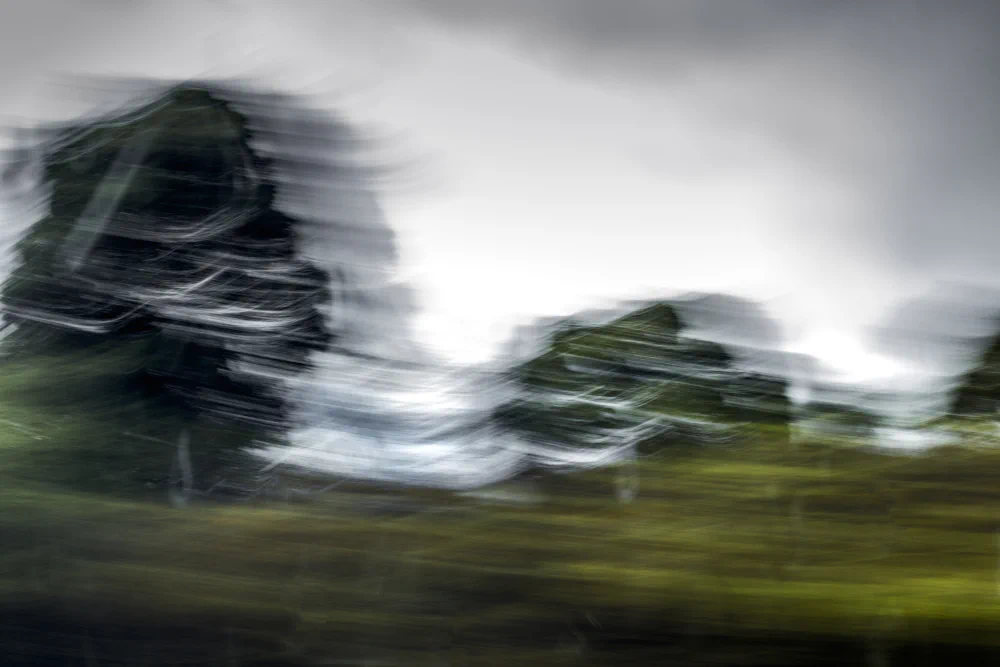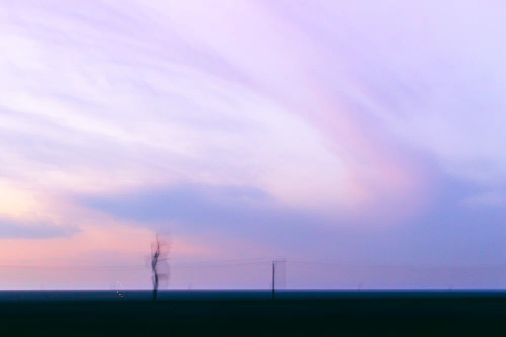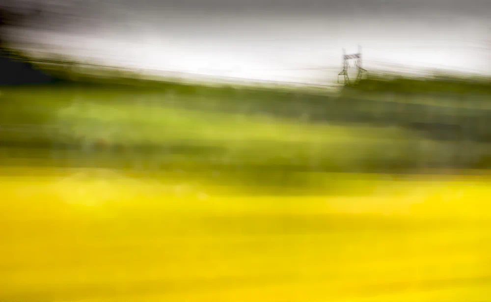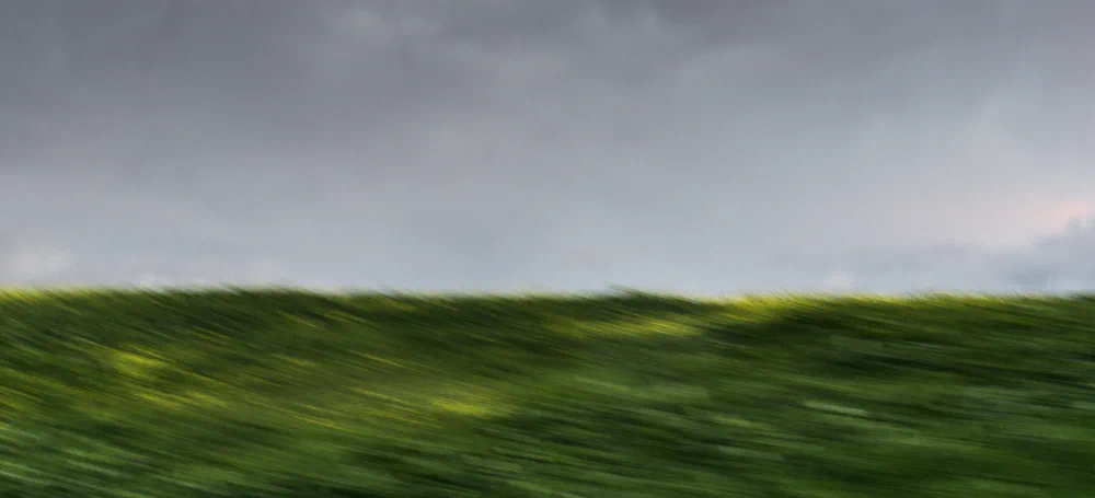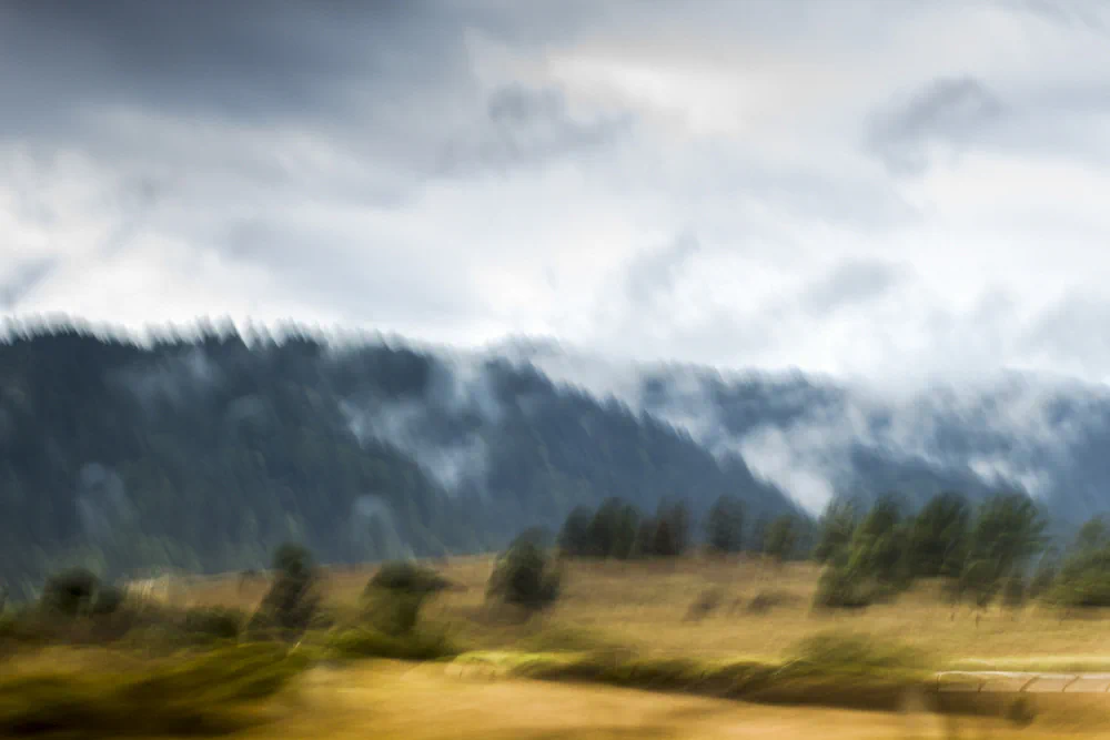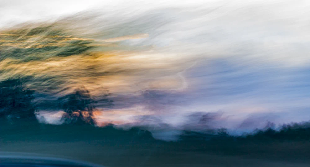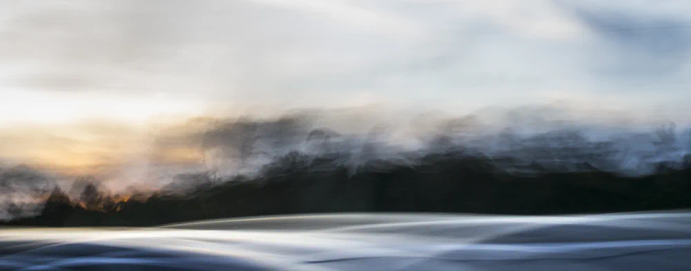 65 MPH is an attempt to return to that way of seeing. By relinquishing sharp focus and traditional compositional control, the artist allows the camera to perform an act of remembering rather than recording. ICM becomes a physical gesture that parallels the body’s experience of travel and the mind’s experience of recollection. The resulting images hover between representation and abstraction. Hints of horizon lines, farmland, and sky emerge, but never fully settle into place. This instability is intentional, reflecting the way memory resists clarity and permanence.
