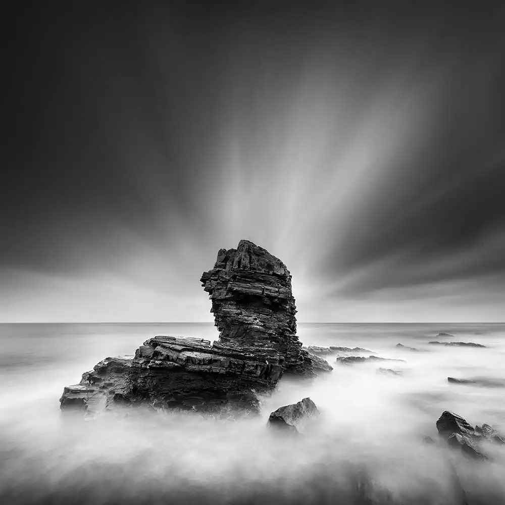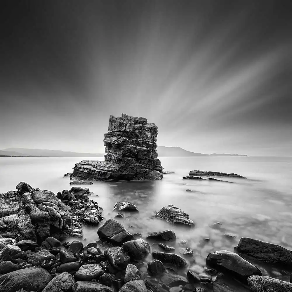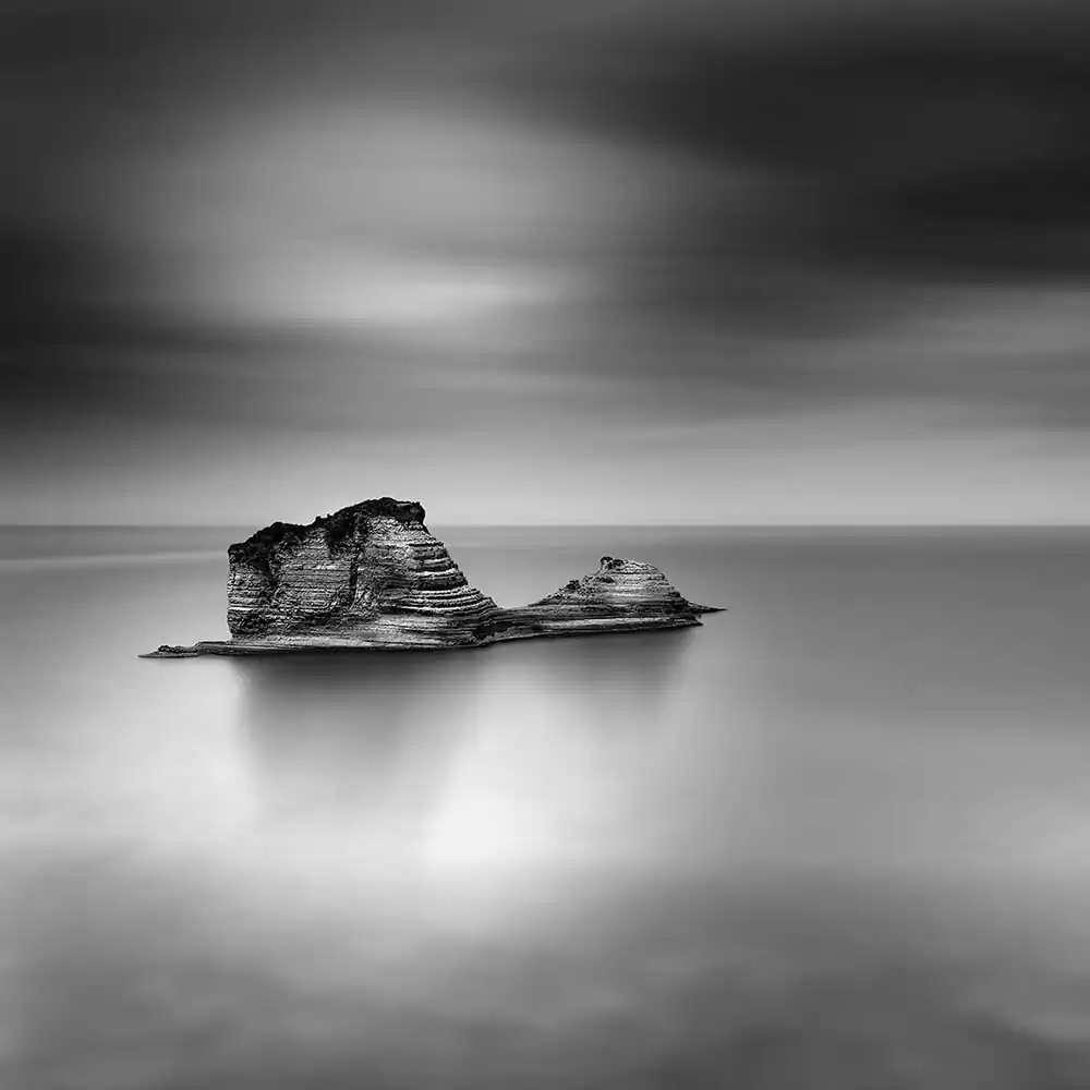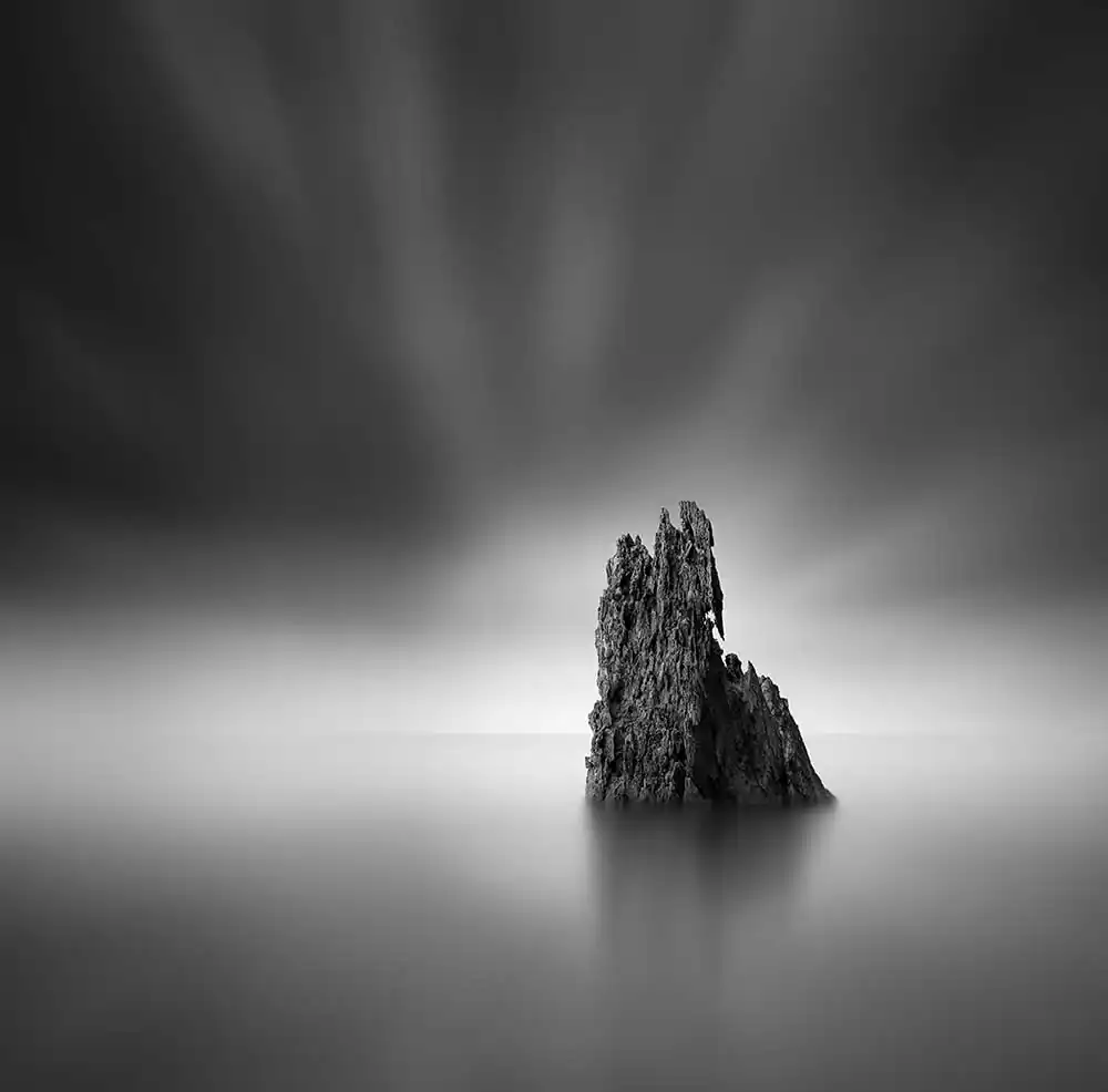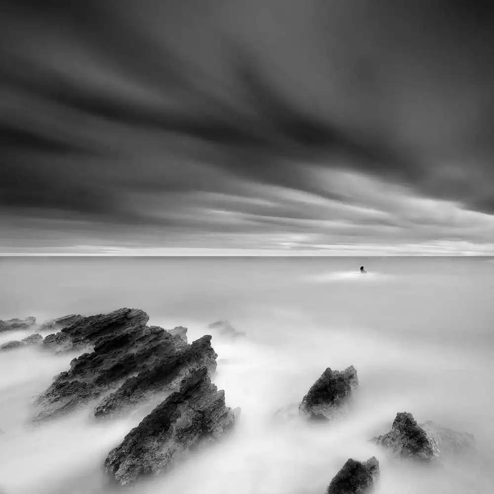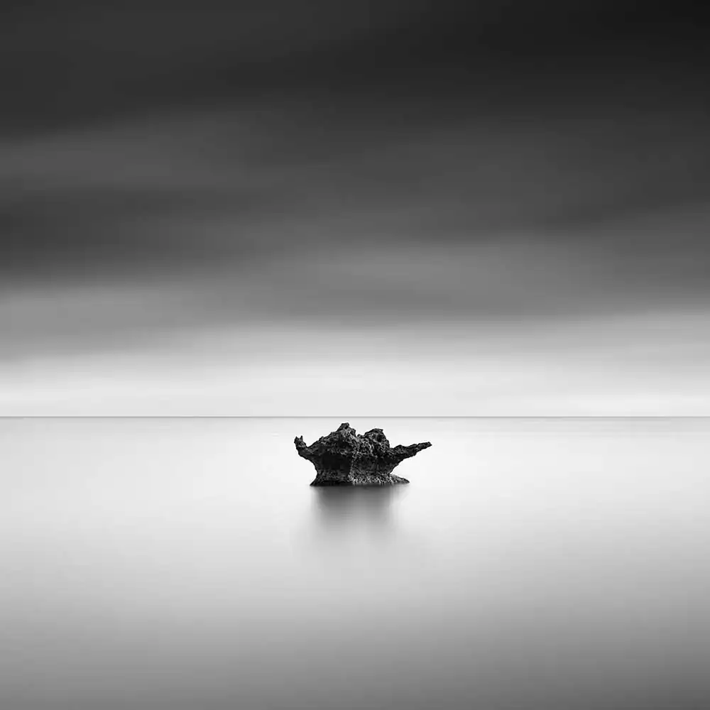 Water, an element he deeply loves, can be found in most of his works, but never as their central theme. Rather, he uses the water and the sky as a canvas on which he places his subjects. They are the means through which he tries to convey emotions and to balance the image.George draws inspiration from the simple feelings that they evoke to him—vastness, quietness, tranquility, symmetry, and balance. For the past few years he has been working primarily on his project ‘waterscapes’, which is characterized by a square frame, a minimalistic and sometimes surrealistic approach, high contrast, order, and a peaceful, yet often sorrowful and lonesome atmosphere. He uses long exposure to move the images further away from reality, introducing the sense of passing time and eliminating the details from the background, thus highlighting his subjects. Additionally, long exposure allows him to introduce the dimension of time in a two dimensional medium and to create a dreamy atmosphere. Photographing with slow shutter speed, over a period of time, George captures the changing world: rivers flow, clouds pass, the waves sway to and fro. The film can accumulate time, light, and events in a way elusive to the eye. The real becomes surreal.
