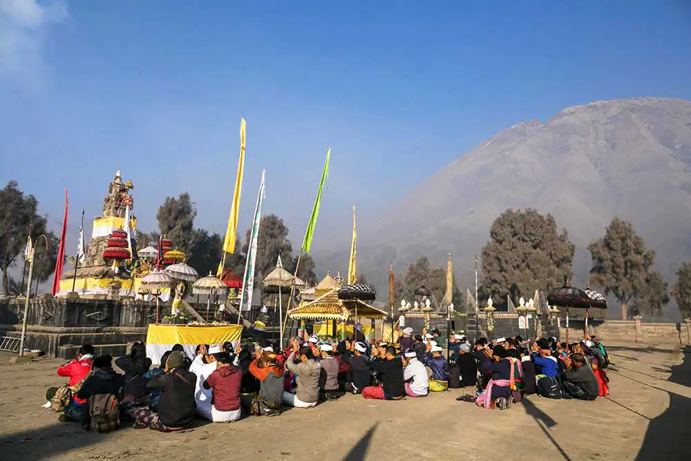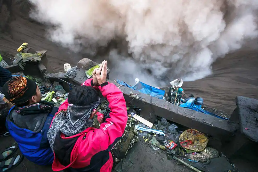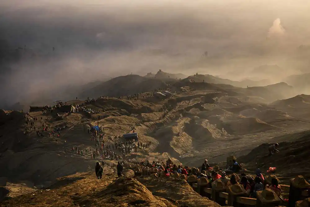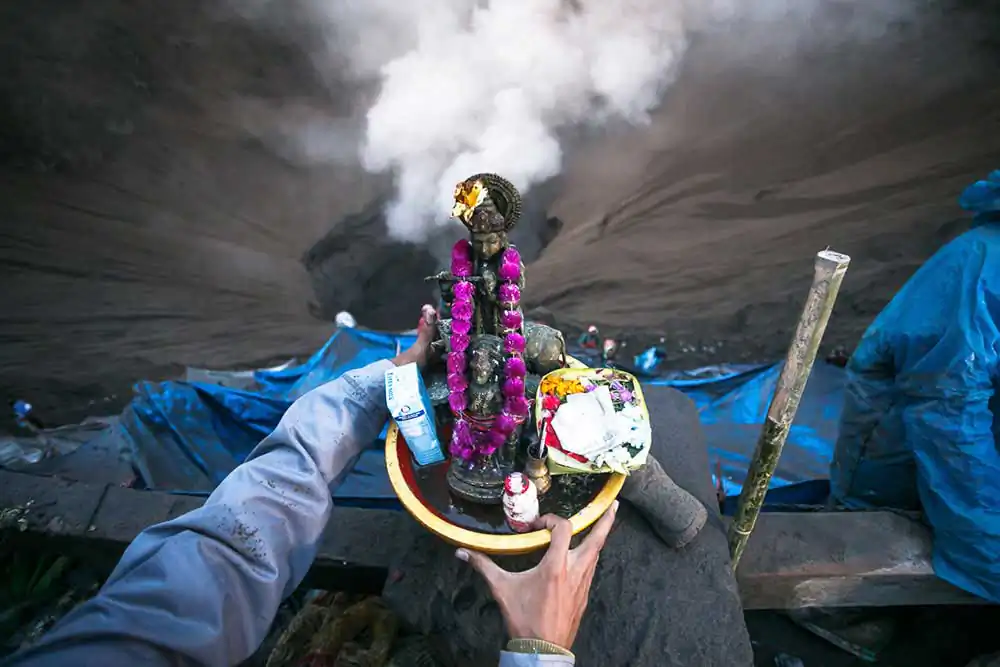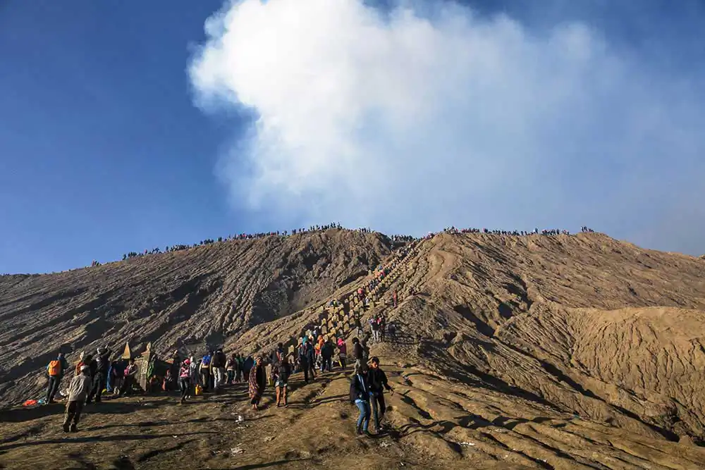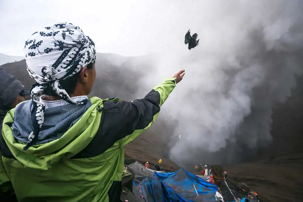 Dewi Rara Anteng and Raden Jaka Seger didn’t have the heart to give Raden Hadi Kusuma up. They broke their promise, and it made the God angry. One day, the sky above the Tengger region turned dark and Mount Bromo exploded. Raden Hadi Kusuma disappeared into the fire and was sucked into the crater of Mount Bromo. When the tragedy happened, a voice similar to that of Raden Hadi Kusuma’s resonated, saying that he had been sacrificed for the safety of all Tengger people. The voice also reminded the people to always worship Sang Hyang Widhi and that they have to sacrifice farm animals and harvests on the 14thday of the month of Kasada.That was the beginning of Yadnya Kasada ritual of Tengger people in Mount Bromo. A ritual that is still performed until today.