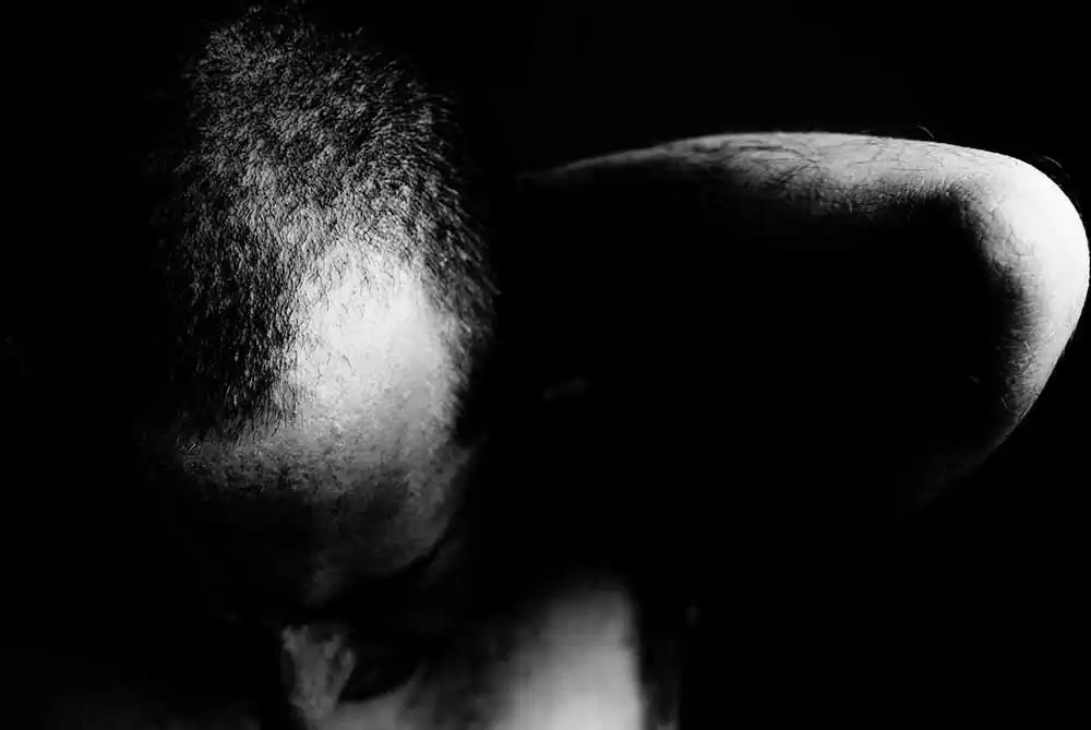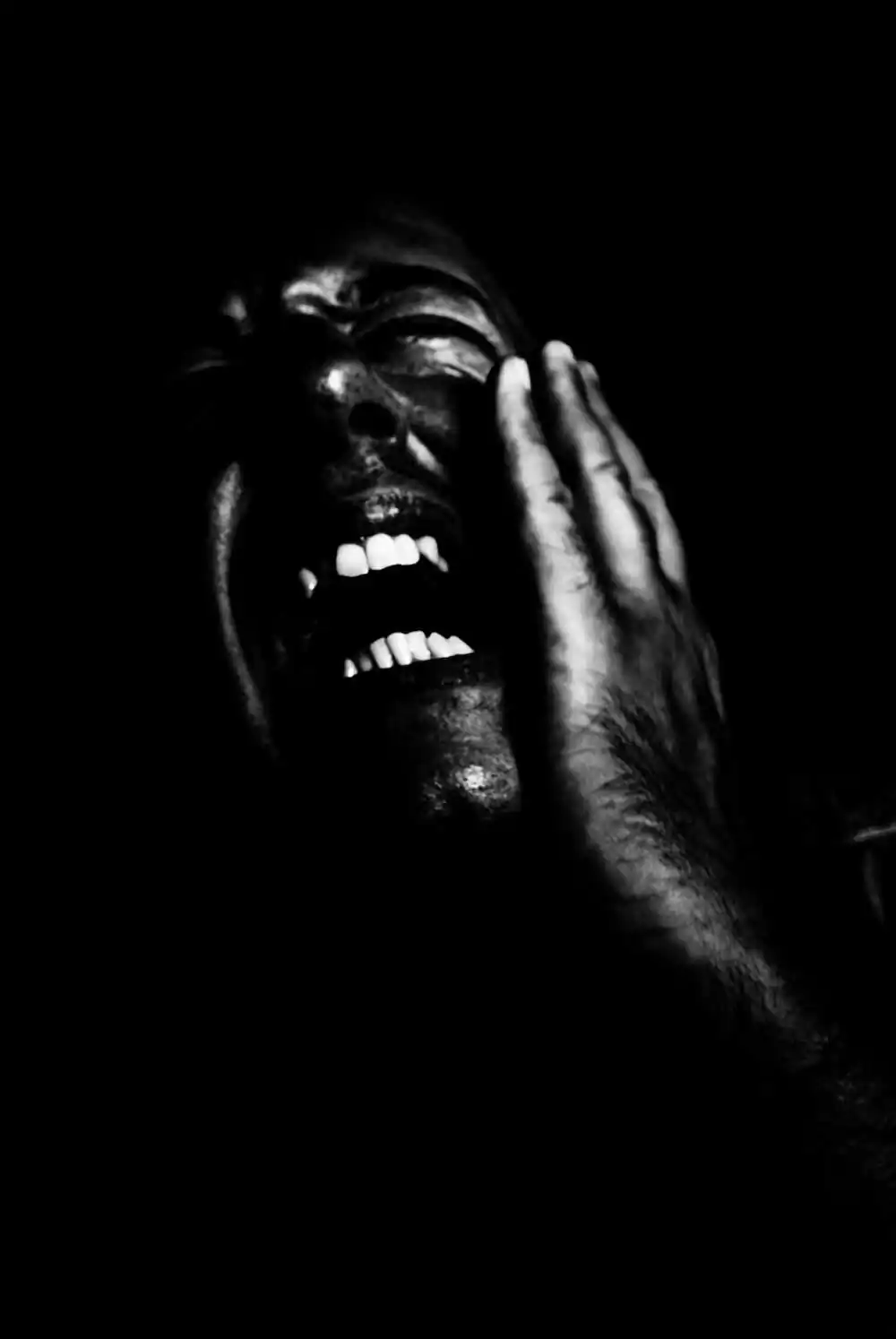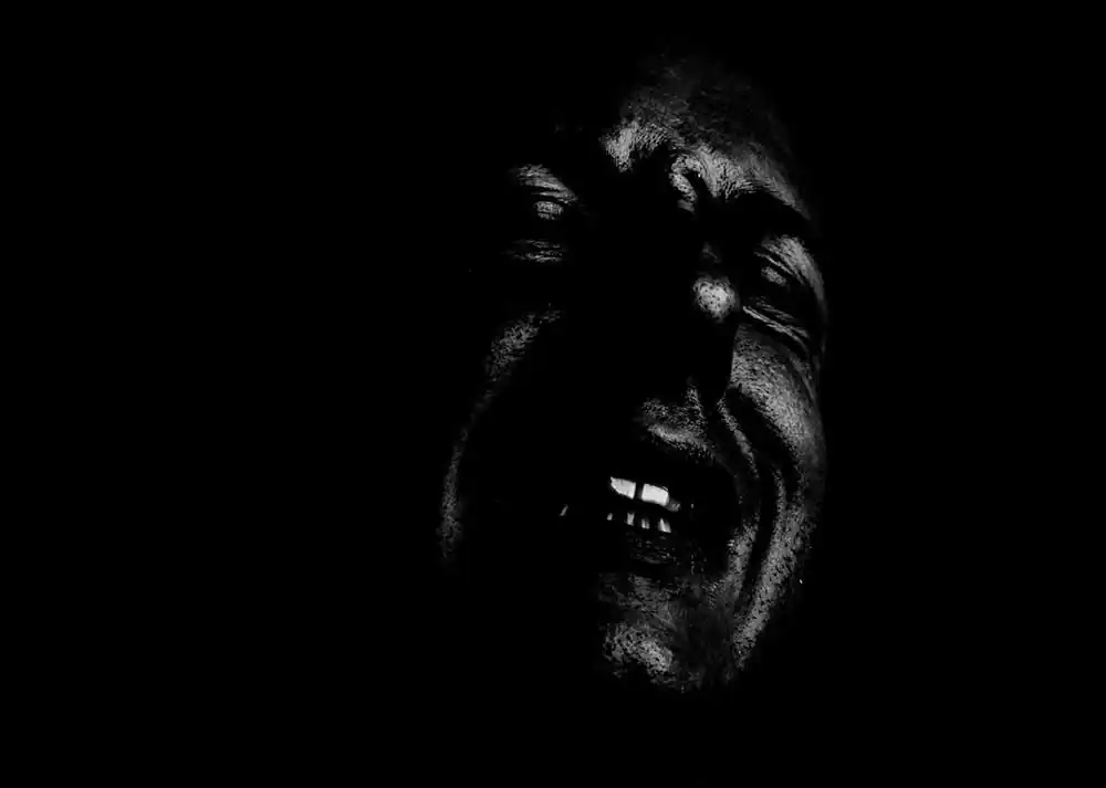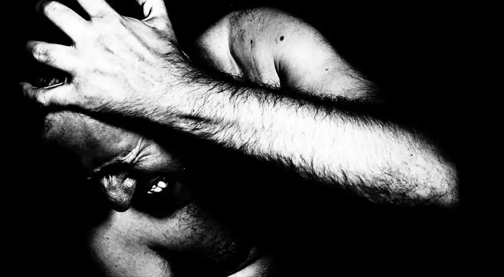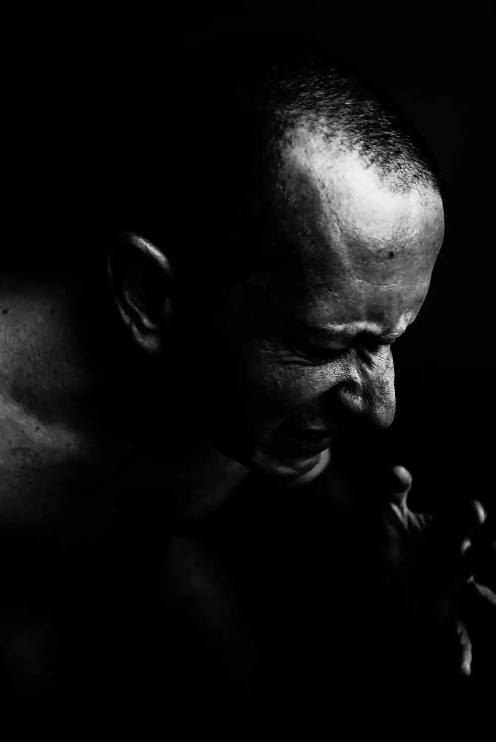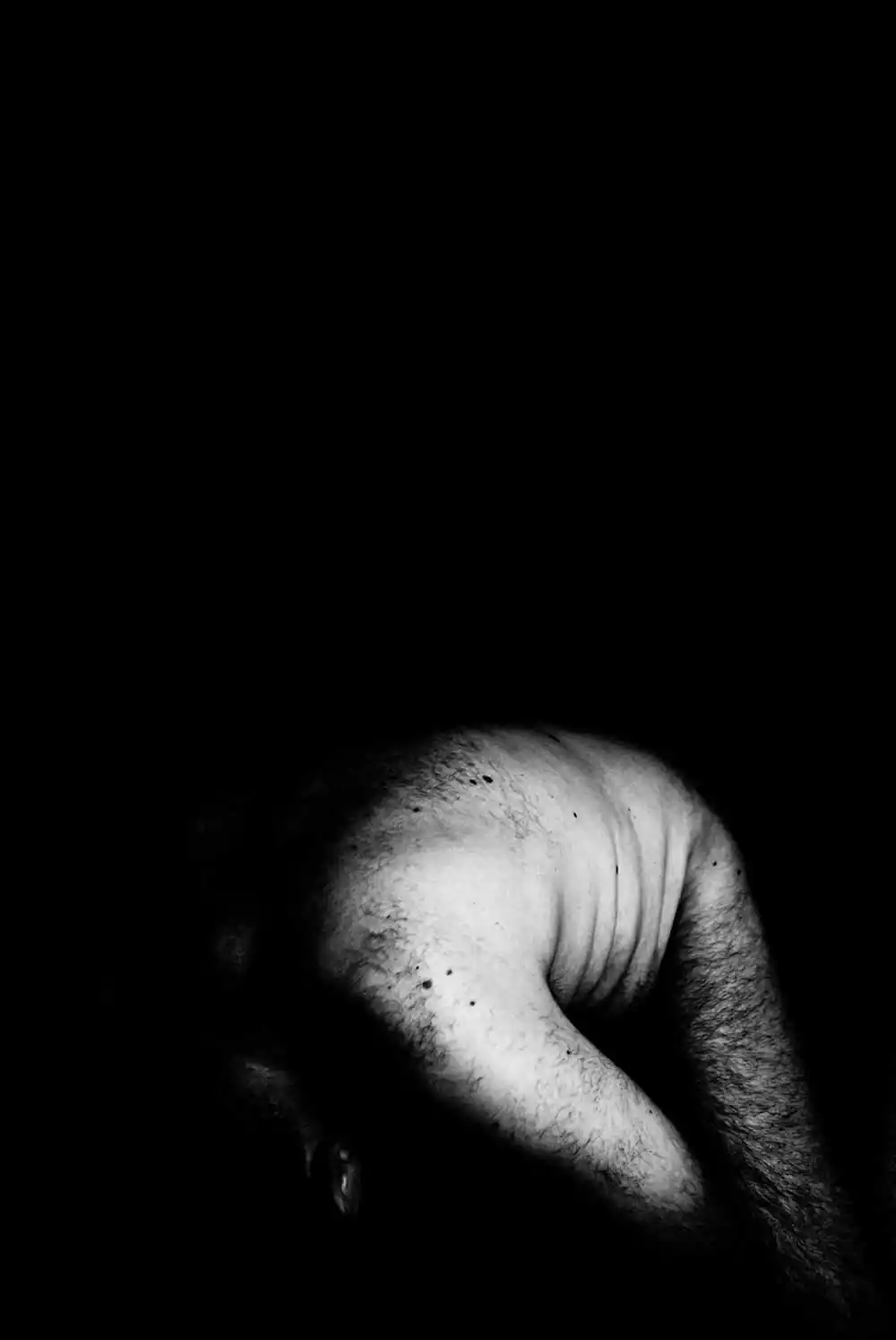 Contorted with rage and emotional pain in an indefinite space in the darkness, helpless in a primal state of nudity, a man struggles with himself.