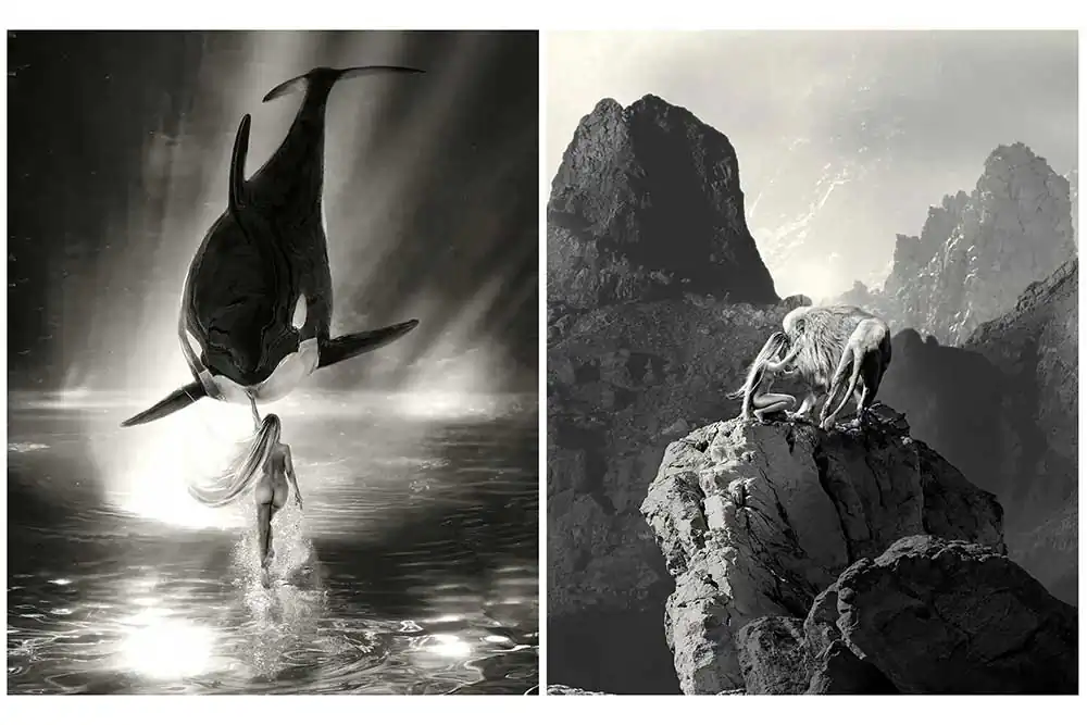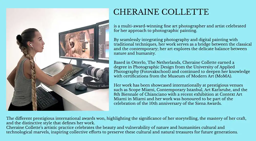 I asked Cheraine if she has introduced AI into her creative flow. She replied that she simply made some attempts with the AI-based functions of CC Photoshop to remove or change a small part in the composition, but was not at all satisfied with the quality of the results obtained, especially in the definition, so she put it aside. I then asked her if she is against the use of generative AI as a creative tool. Cheraine says that by her character she does not reject something if she does not know it and realizes that she is not an expert in this field. At the moment, AI does not bring value to her workflow. She is very happy with what she does and with her technique and therefore sees no need to explore something just because everyone says it is a powerful creative tool.