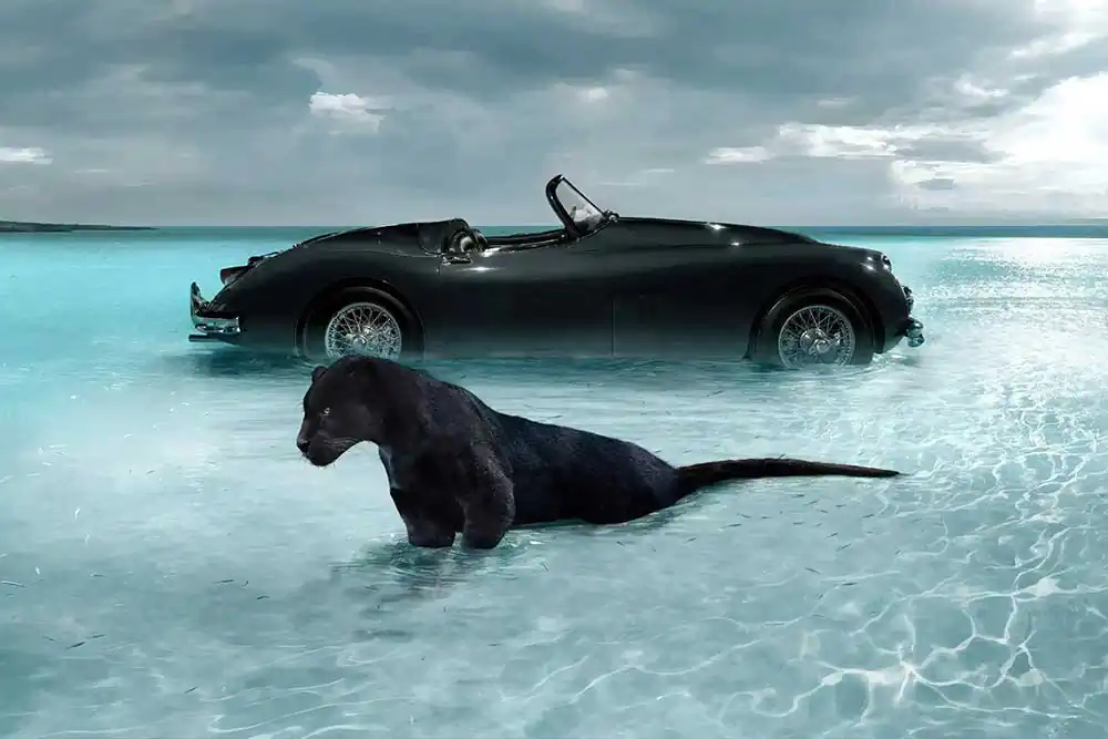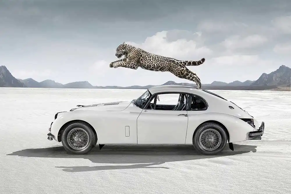 The series with the vintage cars also comes from her idea. I thought it was a commissioned work because I didn’t believe that a person who loves animals so much that she watches them for a long time in silence to photograph them, could ever be attracted by so consumerist good like cars! I was wrong! Cheraine explained to me why. Vintage cars are the fruit of the imagination of designers and engineers who come together to create something unique; these cars are handmade, they are the product of craftsmanship like the one she does when she creates her images. Furthermore, man has progressed because he has been inspired by Nature, the velocity of cars inspired by the speed, power and elegance of felines and horses.