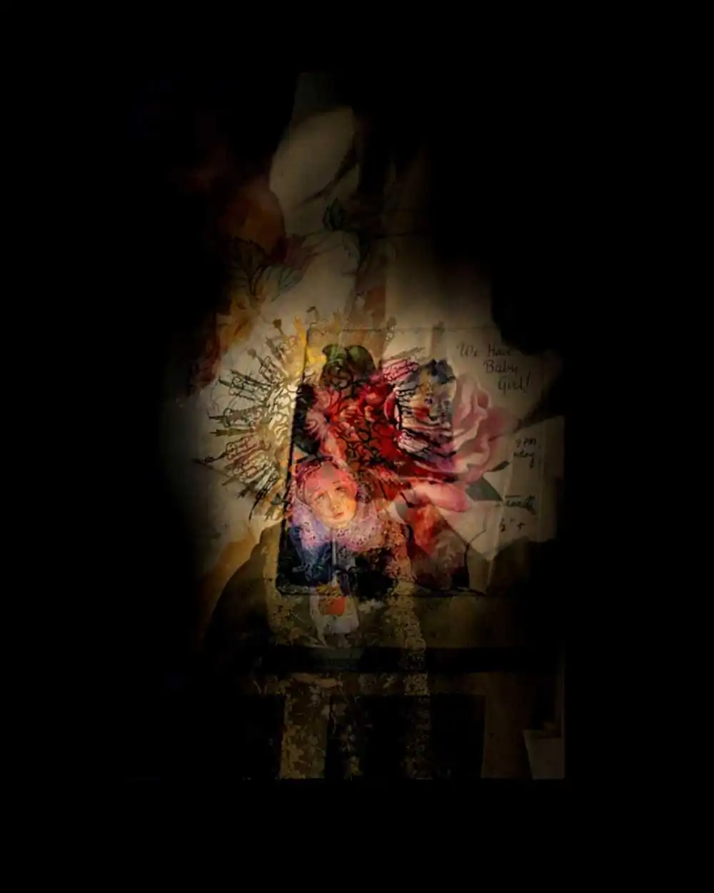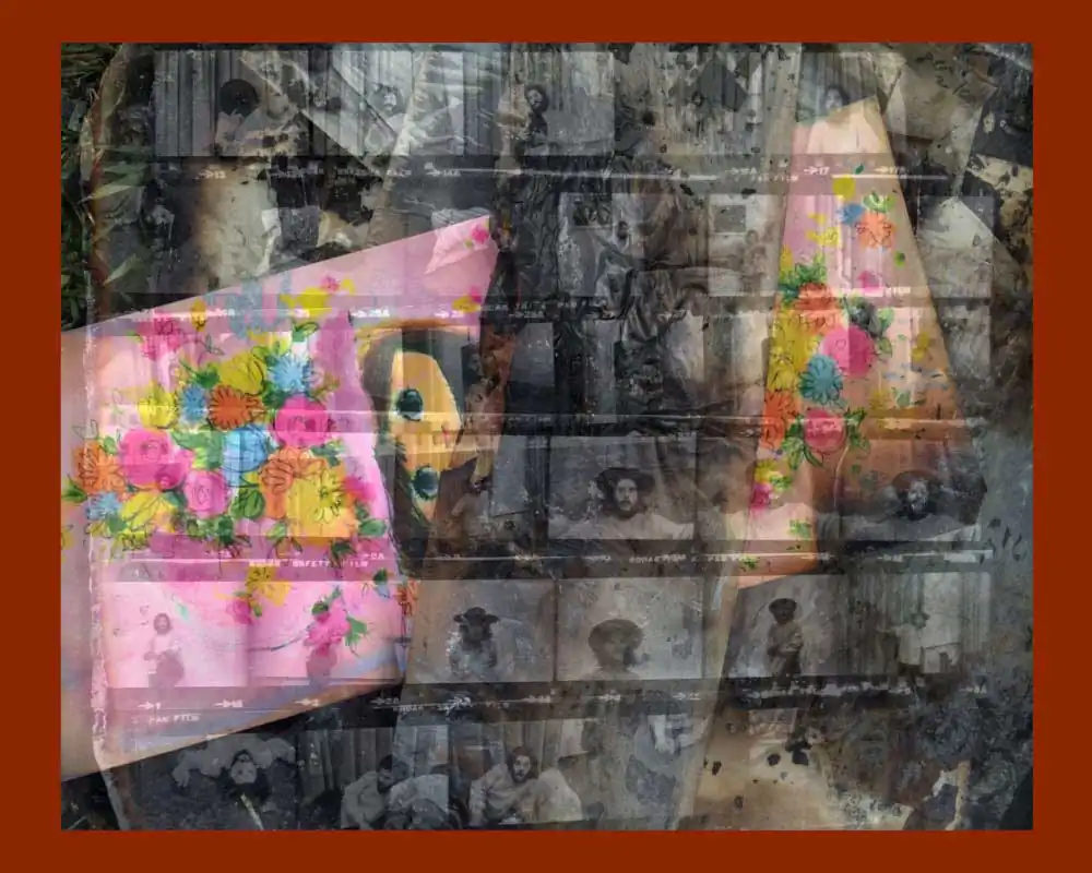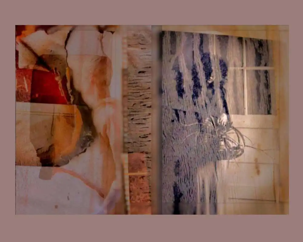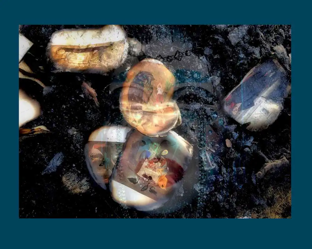 I was still in shock as I had just finished preparing my slides, negatives, diaries to be mailed to my Syracuse University Bird Library archive. It was devastating to know it had mostly burned. I quickly became a researcher. Instead looking for ancient finds, I was frantically digging my own life story out of smoldering ashes – I had to. The storage space became my art studio, as I learned archival techniques to dry and blot with paper towels everything in hopes to save the fragile paper and celluloid relics. The fire and powerful water hoses rearranged my things into clumped pieces that no longer had their linear direction. Memory was layered in abstract and uncanny ways. Since my friend and colleague Christine regularly composed images in her digital processing, we discussed how she might guide me to bring some of the history together in a way that pleased me, and created visuals in an elegiac way, rather than the chaos. Over our time together, Christine shared her spirituality with me, being also a Yoga teacher, and ways of meditation and relaxation.  Christine was the first friend I called after the fire knowing she had empathy, and could identify with my trauma and smooth out the first strike of shock.