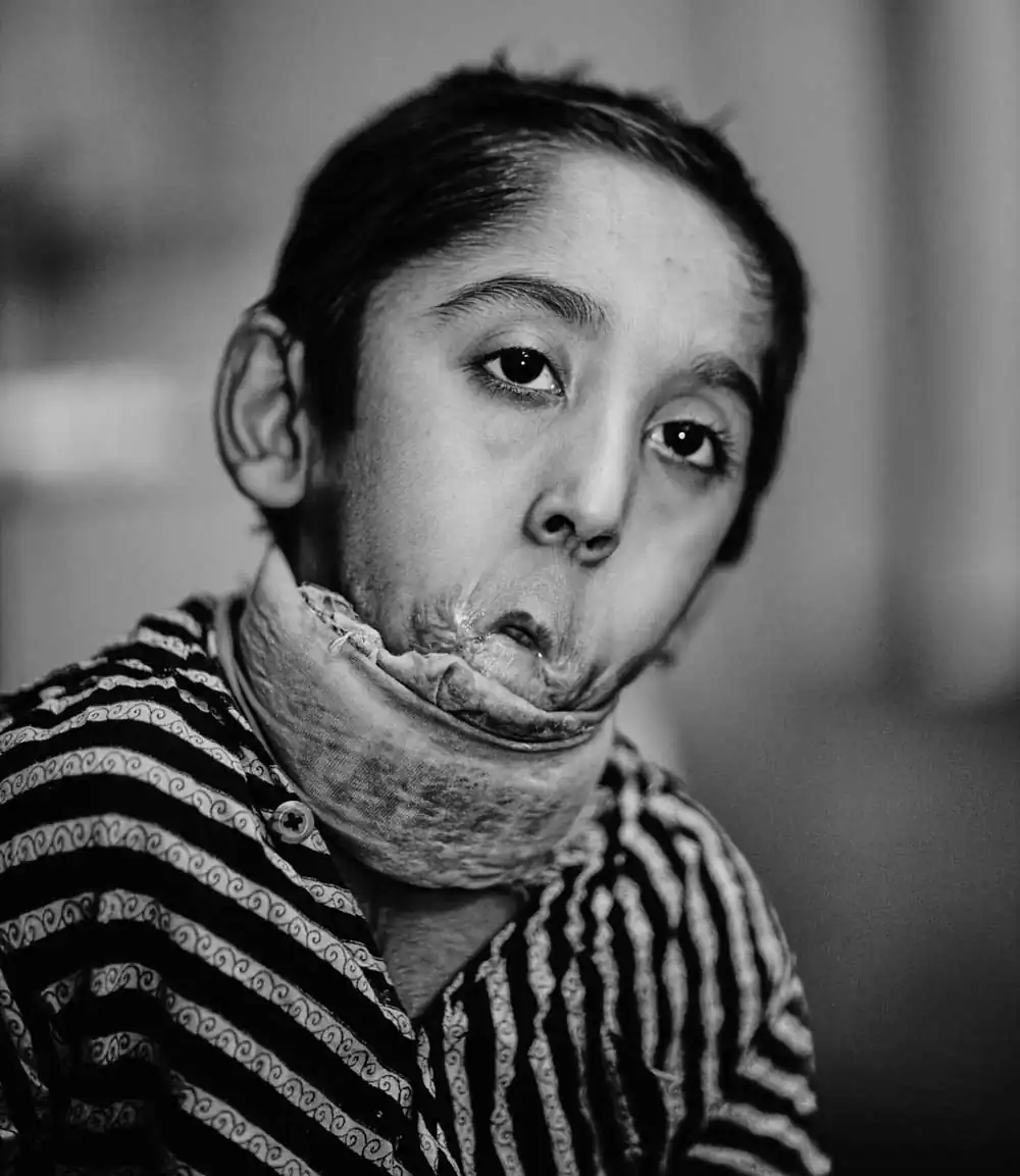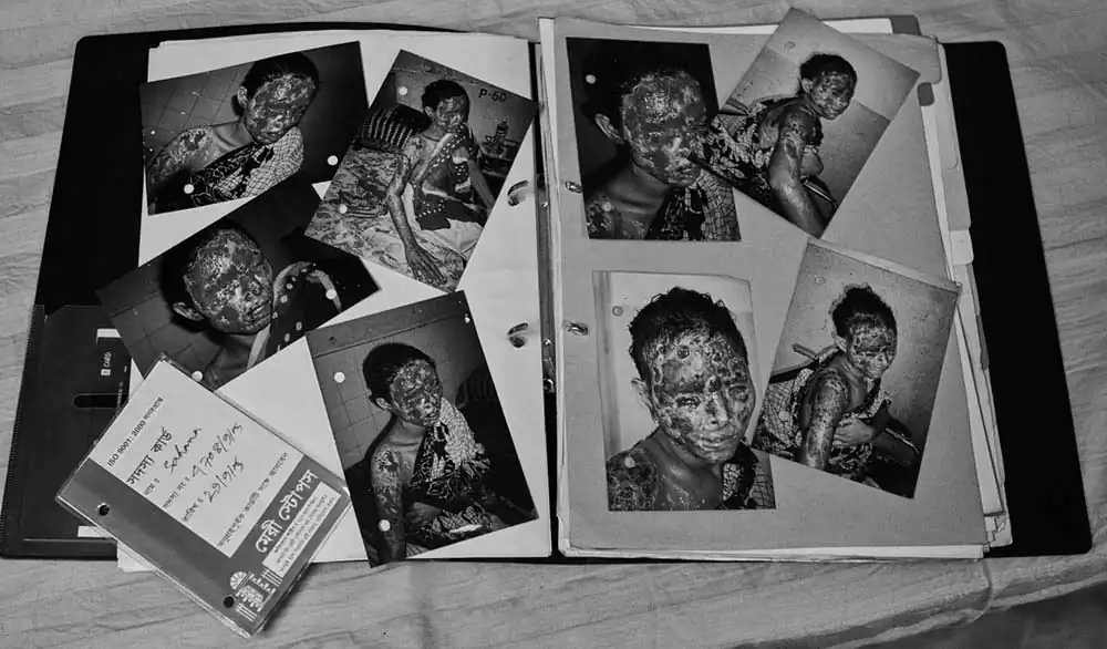 Sonia is 24 years old. She is from Faridpur, which is situated Northwest of the capital Dhaka in Bangladesh. When Sonia was 13 years old and went to class 7, one of her cousins wanted to marry her. He was at that time a student in class 10 and 18 years old. Sonia did not want to marry her cousin, and she refused his love attempts. For a while Sonia did what she could to resist and keep him at distance. One night, the cousin came to her house and threw acid on her while she was asleep. Sonia do not want to talk about what happened. She has two sisters and a brother, and her father died some years ago. Her brother is unemployed and is doing nothing. Sonia now looks after her mother, and also supports her two sisters and brother. Sonia is herself working with acid victims and is proud, because she has recently been promoted to a better job. Today is she is filling-in paper for a mother and her three years old son, who some days ago was also attacked with acid by an uncle. Sonia earns 9000 taka, equivalent to 150 dollars, per month and spends half of her salary for her family. After work she is trying to study and finish her bachelor in arts at a private university in Dhaka. Sonia’s surname is Bristi, which means rain. She hopes that rain will heal her scars. Sonia filed a case with the police, and the cousin who committed the crime was sentenced to 32 years in jail.After the acid attack, Shahnaz filed a case with the police against her husband’s younger brother. After eight years nothing had happened. Her husband’s younger brother now lives in Narajangunj south of Dhaka. Shahnaz’s husband does no longer want to see her, and she lives with her mother and her two daughters. Her two daughters are 14 and 10 years old and go to class 9 and 6, respectively. Shahnaz says that it is her two daughters that keep her alive.His name is Durjoy. In his native language, Bangla, “Durjoy” means invincible. Durjoy had strong sulfurique acid poured down his mouth and throat as a baby at the age of six weeks by his paternal aunt. His tongue, teeth, mouth and throat melted instantly. Burnt skin hung loose on his neck. It was a matter of heritance. As the only male heir to a poor Hindu family, his aunt saw Durjoy as a threat to her inheritance, and so she tried to kill him. The incidence happened in 2005, and Durjoy was admitted to the Dhaka Medical College Hospital. He was alive but starving to death. His anterior neck had been destroyed and the mouth merged into the sternum in a mass of dense scar. He was found by the Acid Survivors Foundation in Dhaka, and came in contact with the British doctor, Ron Hiles, who for many years had been doing fantastic heroic work for acid survivors in Bangladesh. The first operation was performed in Bangladesh involved removing the dense anterior neck scar and closing the defect with skin grafts. Enteral feeding was needed to improve Durjoy’s nutritional status. During 2006, he was operated several times in Bangladesh, and he was putting on weight and beginning to walk but his future remained perilous. Charity funds were raised, and Durjoy and his parents travelled to Hong Kong at the end of 2006, where Durjoy again underwent a series of operations. The Bangladeshi doctor Kawser Ahmed accompanied the family and was also involved in the lifesaving operations in Hong Kong. When Durjoy arrived in Hong Kong he had difficulty in breathing with risk of aspiration necessitating a tracheostomy, inability to take liquid or solid food requiring permanent enteral feeding and inability to talk or vocalise due to intraoral scarring and tethering of his tongue. Durjoy returned to Bangladesh in March of 2007 and on the day of his discharge, he was active, interacting, putting on weight and doing well and learning to play a bit with a football. Durjoy was very well looked after in Dhaka, but inevitably as he grew his caloric needs outweighed the possible input through his small oral aperture. In addition his speech was non-existent due to the tethering of his tongue. On 1 November 2009, Durjoy returned to Hong Kong. His mother, father and a physiotherapist from Dhaka, Sultana, accompanied him. Durjoy underwent further scar revisions in the neck, insertion of a ‘permanent’ gastrostomy tube and further intraoral grafts. Durjoy left Hong Kong in January 2010 with the feeding tube in place. Durjoy is now living in Dhaka where skilled and courageous people look well after him. Durjoy is truly invincible. He is a miracle of the human spirit.