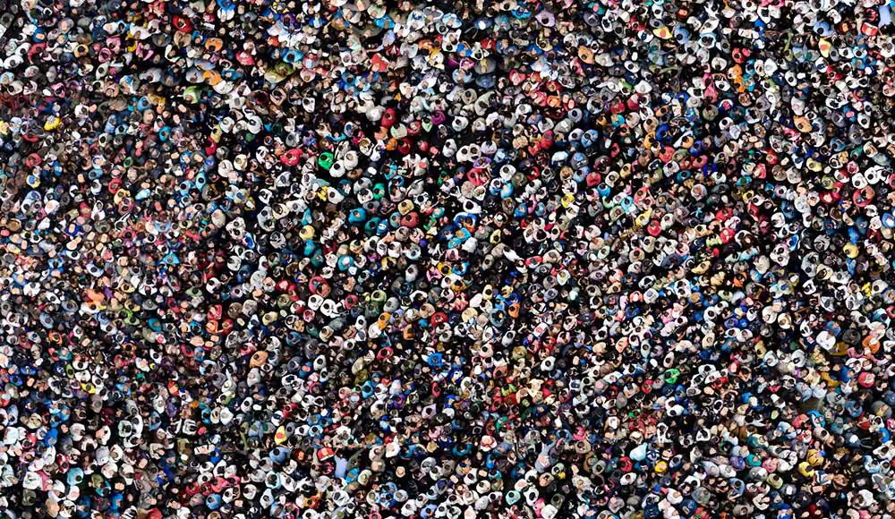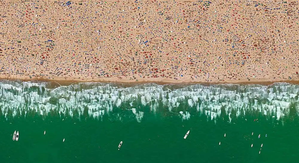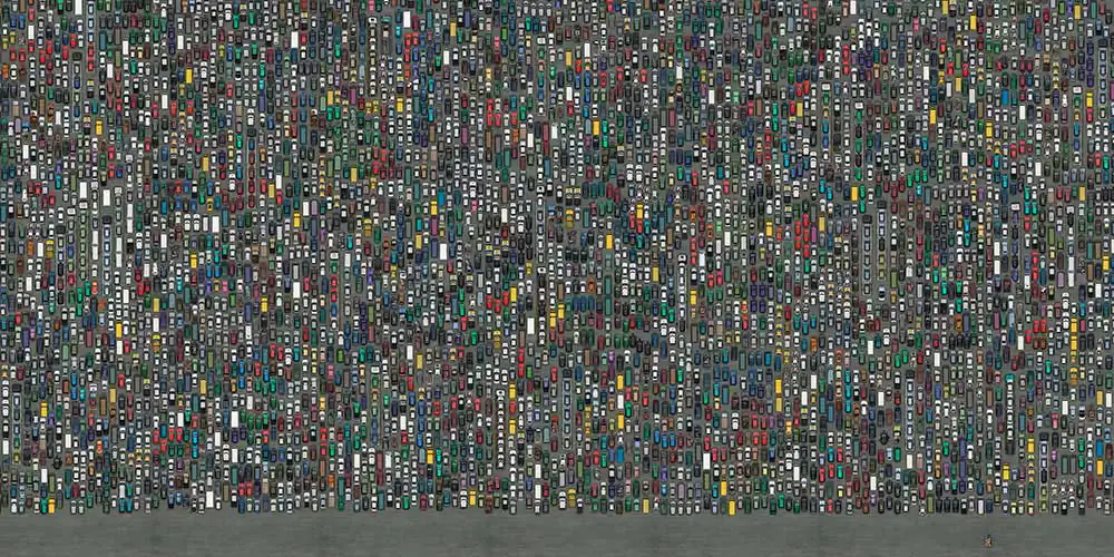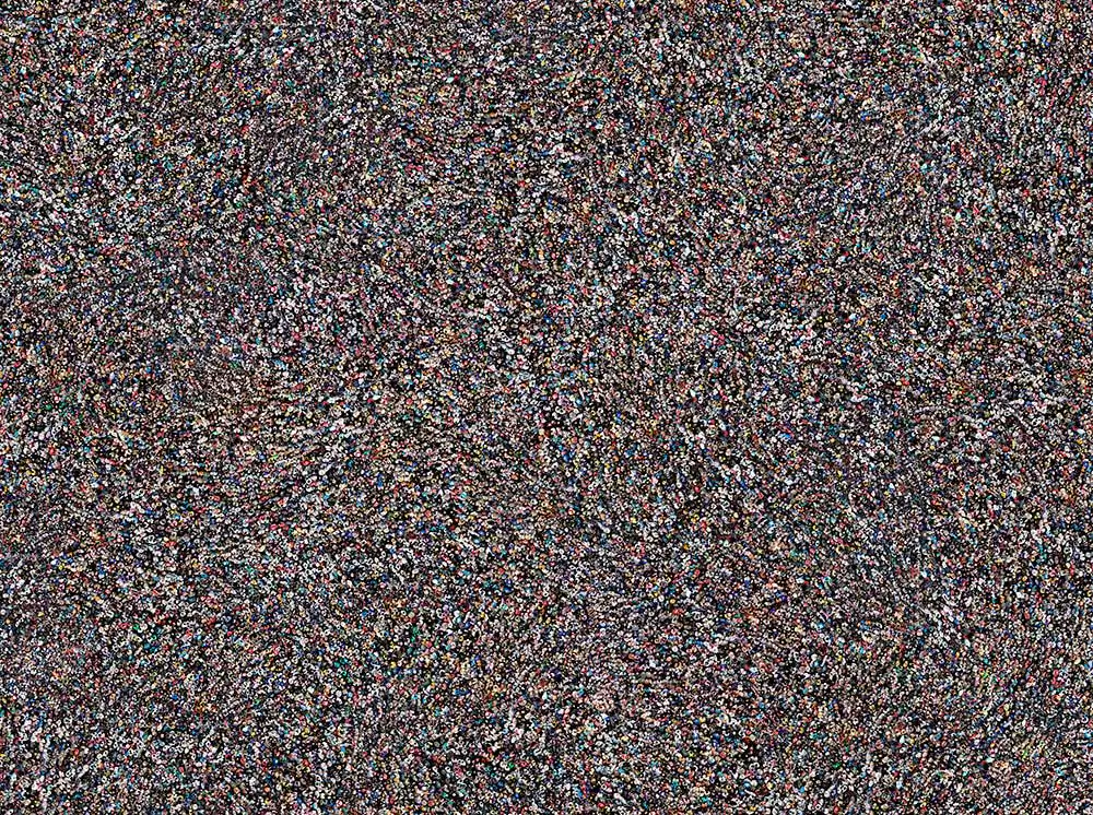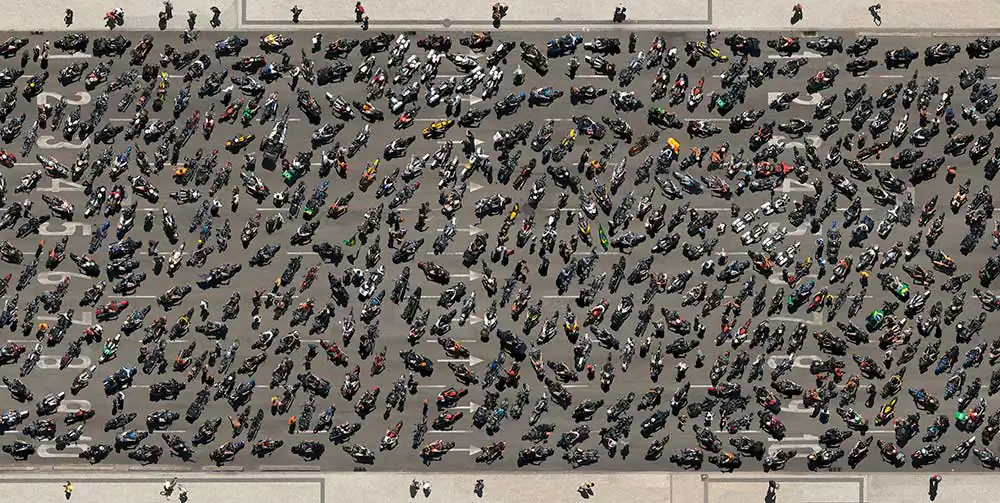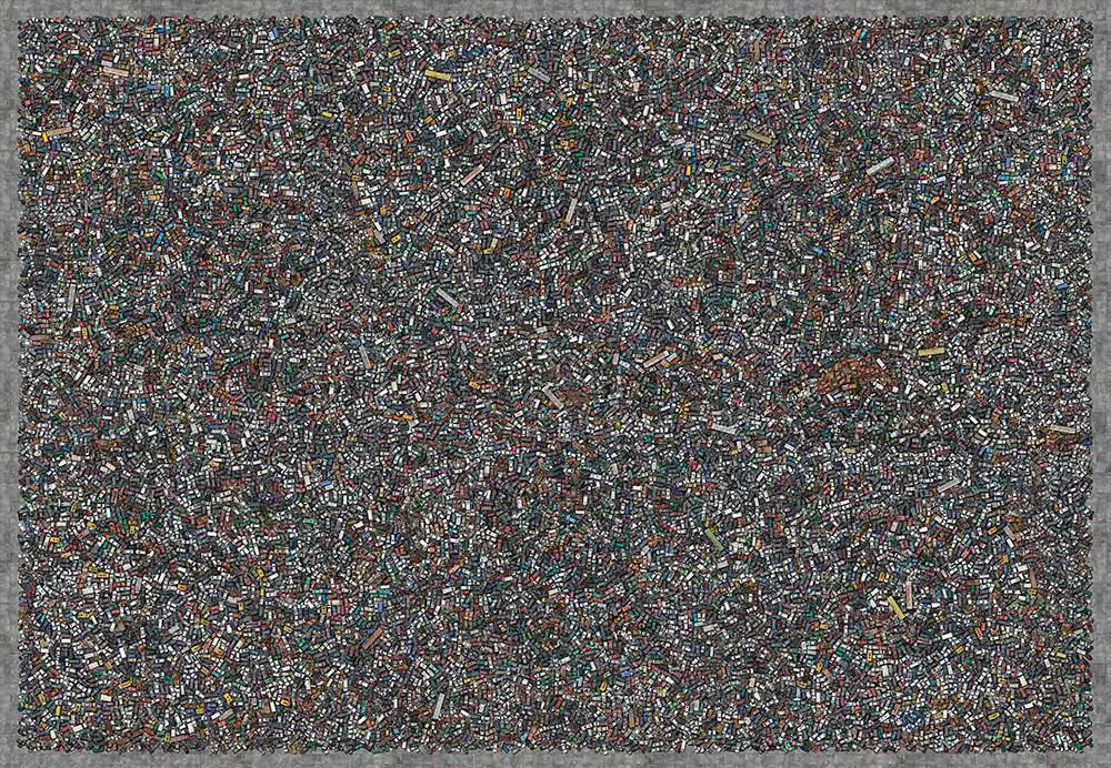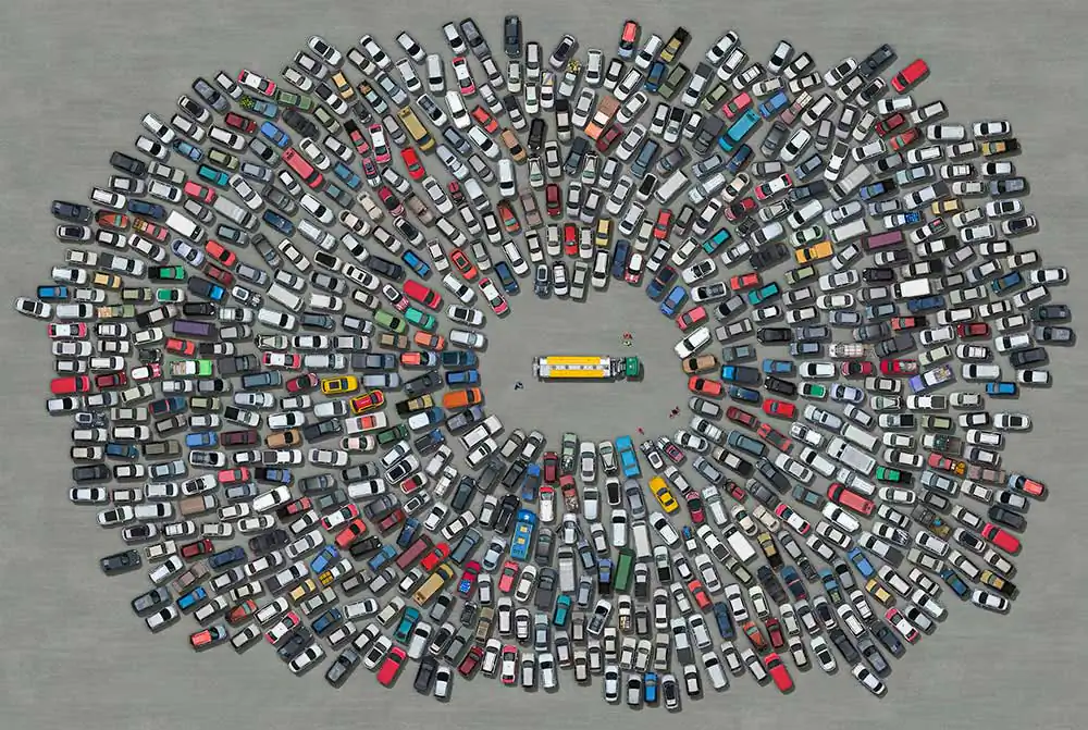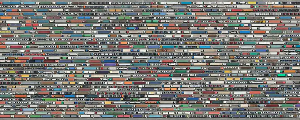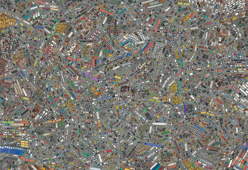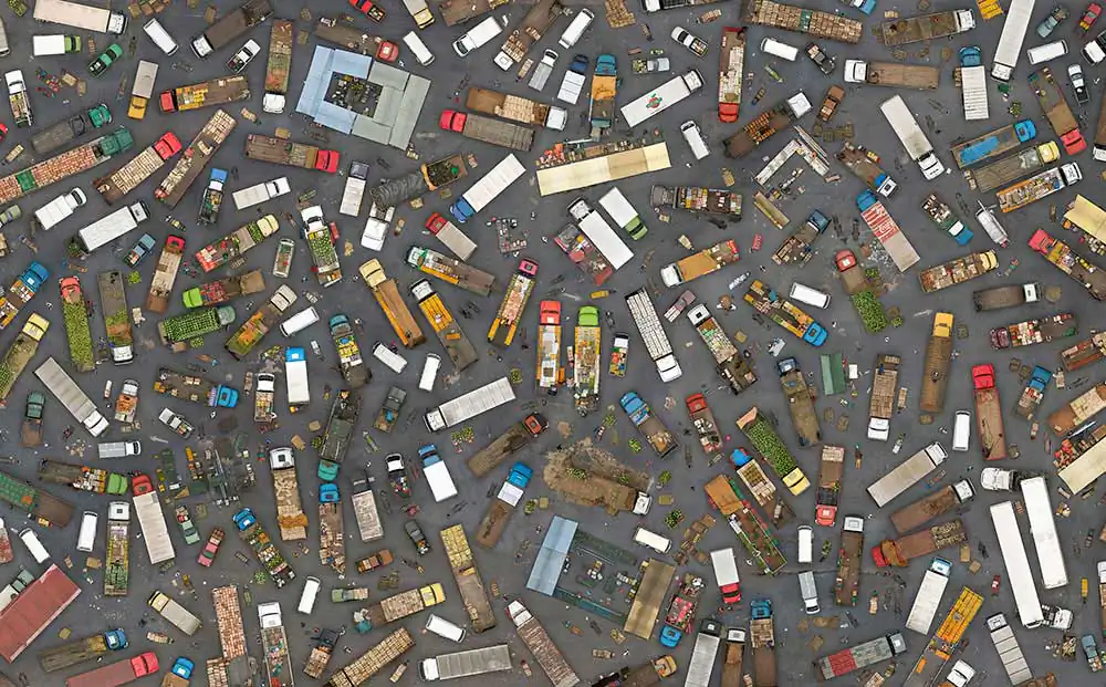 The series “Collectives” reveals a contemporary look of life stories from a globalized world seen through mosaics of constructed images. The observer is faced with large panels of aerial photos if seen from afar appear to be textures or geometric forms that if inspected closely, surprise the viewer with a richness of details that compose a daily urban lifestyle in consumption patterns.
