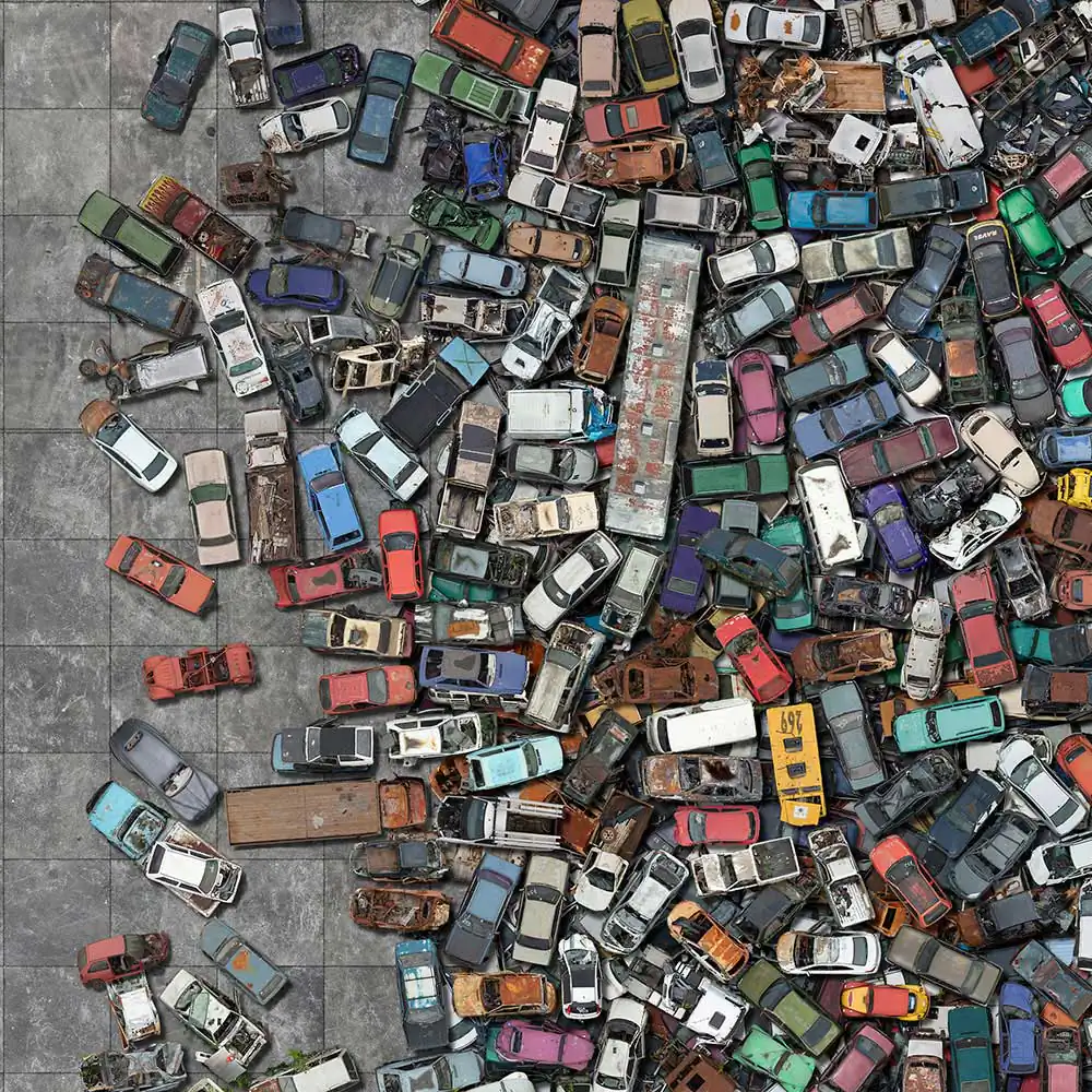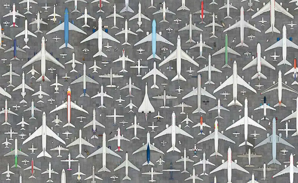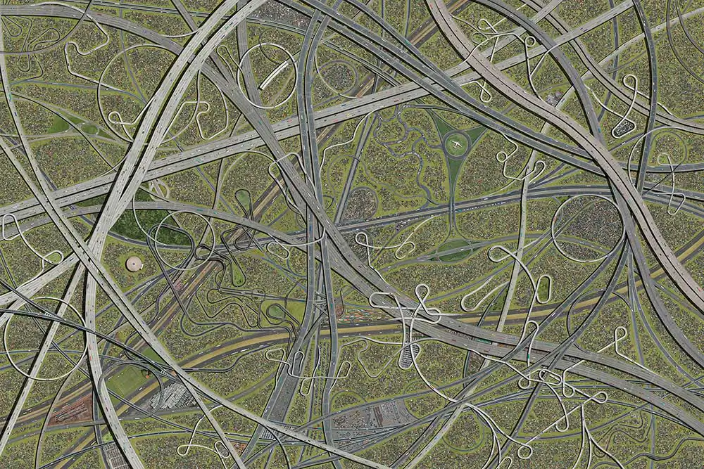 The work on view reveals the enormous quantity of products and lands that humans beings use for living on our planet. All the images, made of hundreds of different pictures that together create imaginary landscapes, depicts the reality featuring huge areas that humanity needs each time more to aim all steps of the consumption chain. VERDE exhibit the big demand for food showing large areas used for plantations and CEASA presents the complex operation to distribute the food. Our society produces immeasurable quantity of disposals and ARIZONA shows us an unbelievable boneyard composed of old aircrafts. The work COLETIVO  represents a nightmare scene of what it’s happening in all big cities in the world where the car has a growing presence.