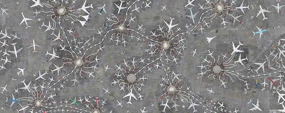AEROPORTO is a surreal airport that is a portrait of globalization, mobility and the quickness of our way of life. Composed of more than a thousand photos clicked at several airports in Brazil and in the United States, the work presents itself as an immense communicative system of the relationship between humanity and its new way of interacting with time and space, reinforced with the striking resemblance to the shape of neurons.