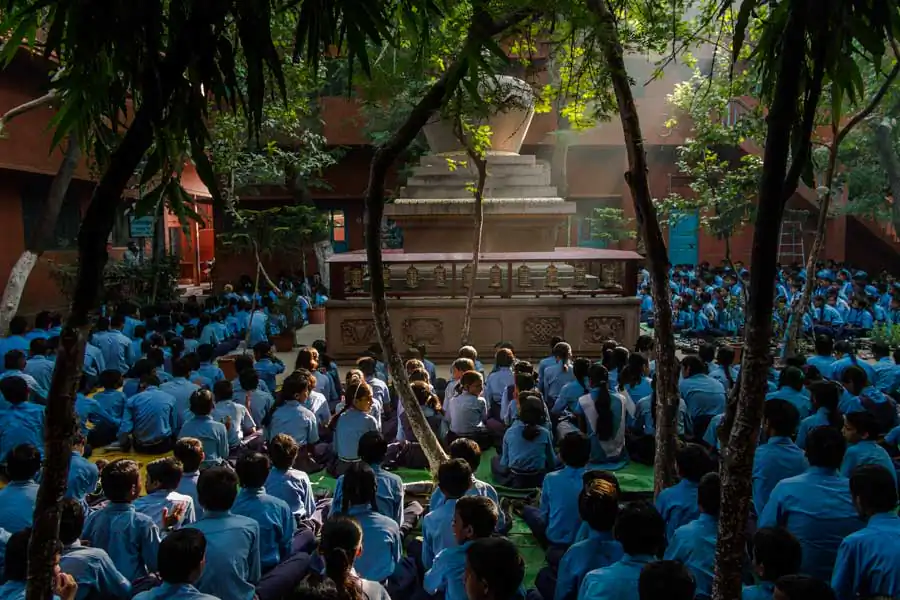 Every morning students gather in a general assembly in the central courtyard of the school for collective prayers and songs. The school of Sarnath in India is the first intercultural and interreligious school of Alice Project, founded in 1994 on the site of the Buddha’s first sermon after his enlightenment. There are other two Alice schools in India: at Bodh Gaya in Bihar and at Bodhisatta Deban village in Arunachal Pradesh.