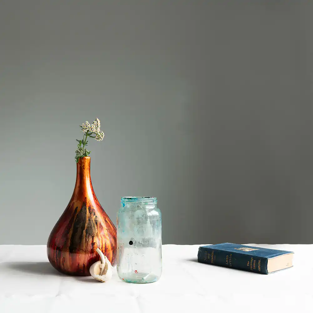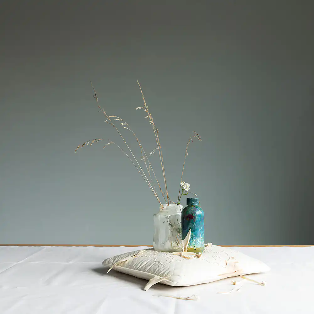 All We Find, All We Leave Behind focuses on the layering of history in a place, both in its original life as a school with shelves bulging with old books and, more recently, as a temporary home to the many artists who inhabited the space before me to make their own work. The studio resonated with the traces of all those people I would never meet dusty leafed-through books, paint-stained pots, seashells and pebbles gathered from the nearby coast which told a story of past and present. I too left behind my own objects for the next artist to find.