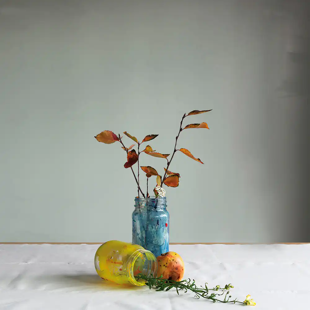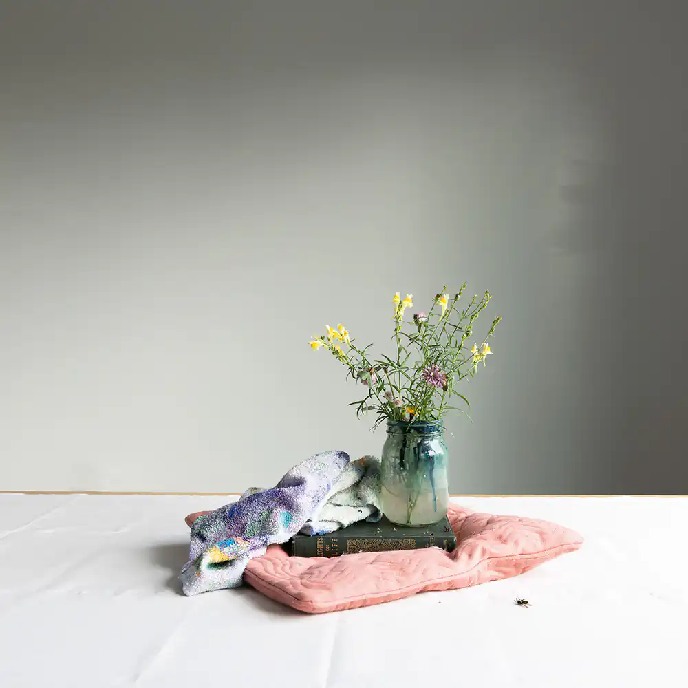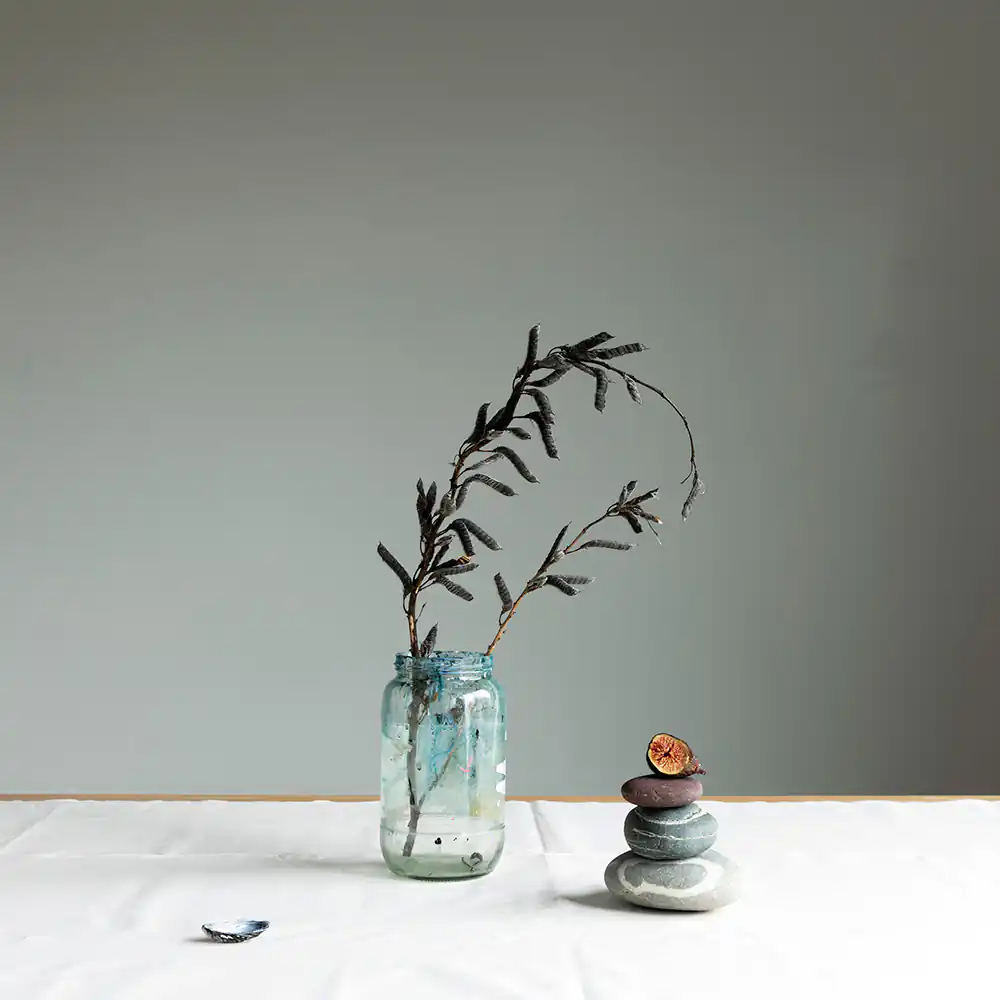 I created still-life compositions with objects I found in the studio, food items, and whatever foliage I could forage each day in the rough wasteland directly outside the building. The still-life genre holds a fascination for me; I have always reflected on the stories that objects carry. Each day of the residency, I enjoyed making simple compositions referencing the symbolism of early vanitas paintings, a reminder to the viewer of the fragility and transience of life. Placing found objects in dialogue with each other and photographing them under the vagaries of the ever-changing natural light in this remote coastal area, I assembled a series of quiet tableaux.