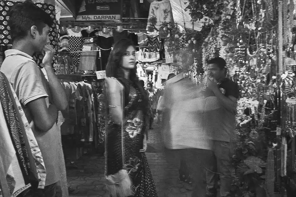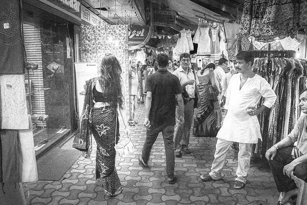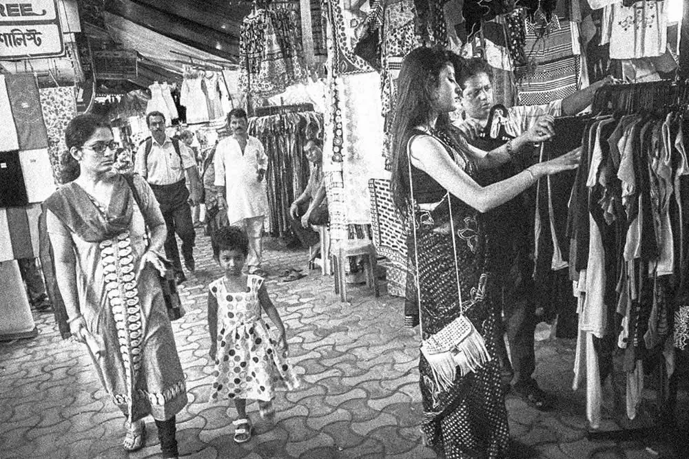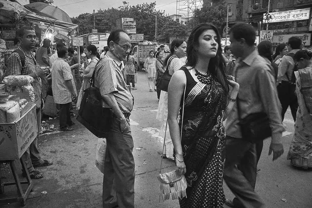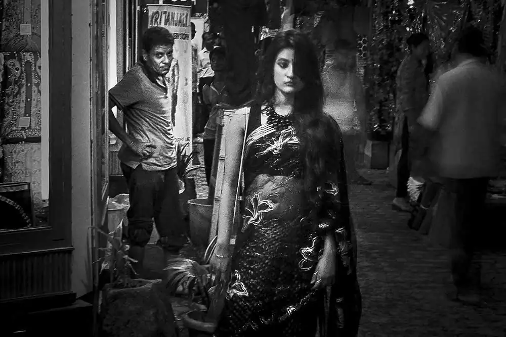 Gariahat,  is the  shopping hub of people in South Kolkata. From malls to street items it fits to be a common hub for people of all socio-economic backgrounds and thus was chosen.  The attire selected was a saree as it signifies an Indian woman as most women in India wear saree. None of the “onlookers” were posed or instructed in any way.