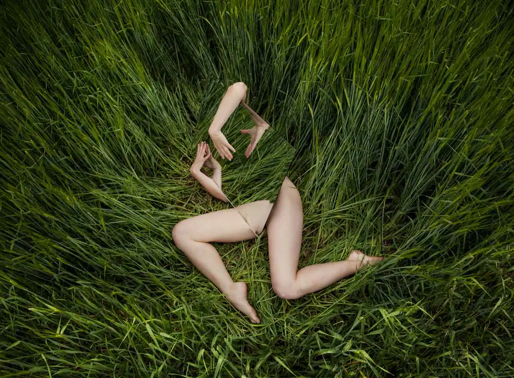 Oh, there were many challenges… The photograph was shot in a grassy field outdoors, so the lighting was constantly changing. It was important that the lighting was similar to a giant softbox, which meant waiting for a bright, but overcast day. The whole series, including this image, are photographed with a remote self-timer. Being that both of my hands were holding the mirror, I ended up putting the remote in my mouth and clicking the shutter, by biting down on the button, which took a bit of practice. Lastly, there was nothing between my skin and the clean sharp edge of the mirror, that resulted in some “battle wounds” for each image – but I will have to admit, it was well worth it!