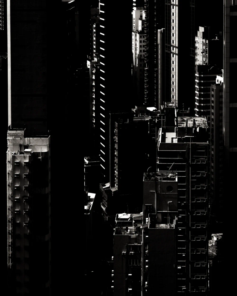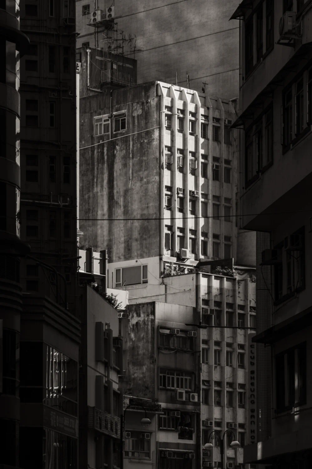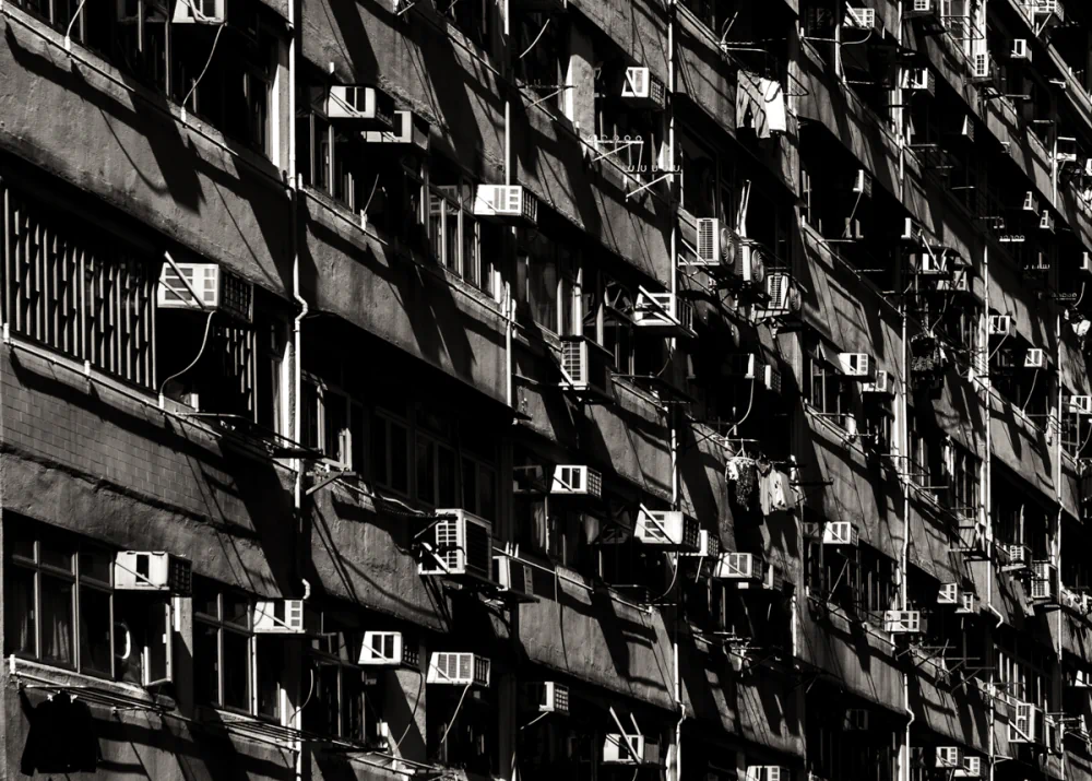 The telephoto lens transforms massive structures into abstract compositions. A facade filled with air-conditioning units becomes a rhythmic, mechanical skin, a metallic tapestry that reflects the density of life contained within. This visual compression creates a sense of pressure, highlighting the resilience required to inhabit such an environment.