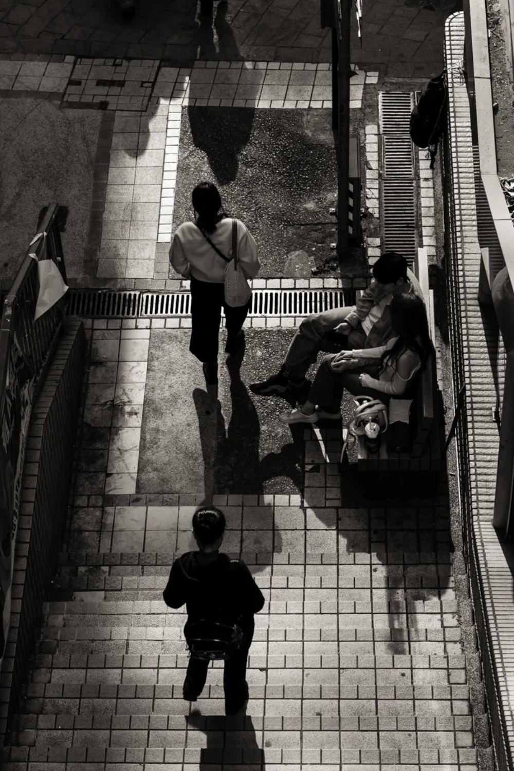 These moments occur primarily at street intersections, where openings in the dense urban structure briefly allow light to enter. For a few minutes, a crosswalk or a newsstand is illuminated by harsh, reflective light from mirrored facades, creating a celestial spotlight while the rest of the environment remains in deep shadow. Capturing these transient moments became a central theme of the series, where the “Urban Noir” atmosphere fully emerges.
