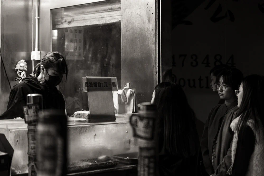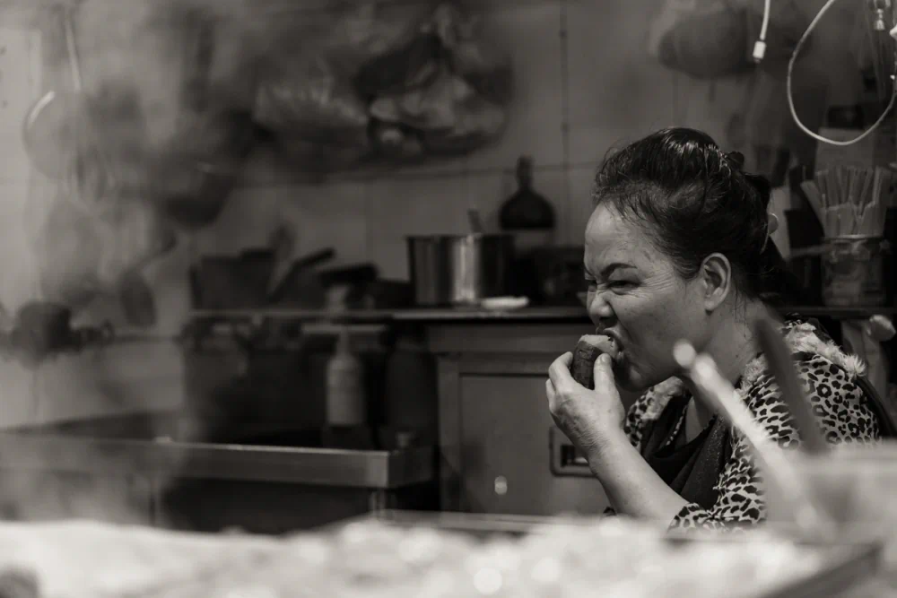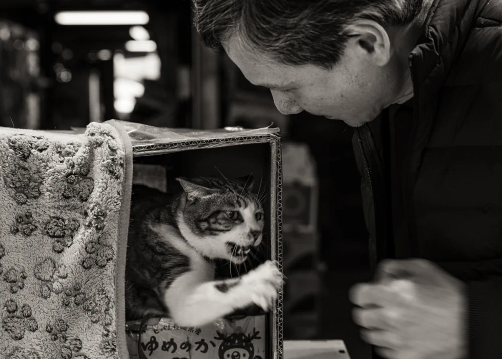 The compression effect makes the background seem to press against the subjects, generating a sense of intimacy that borders on claustrophobia. He seeks to capture subtle, everyday moments: a worker enveloped in the steam of a street-side kitchen, or a quiet interaction between a shopkeeper and a cat resting in a cardboard box. These fragments reveal the human essence of the city.