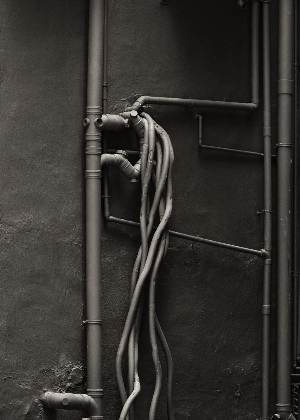 The City beyond Color. The decision to process the series in high-contrast monochrome was essential to emphasize the city’s structural essence. By removing the iconic neon reds and electric blues, he was able to focus on the raw textures that define Hong Kong: the slick reflection of a taxi on sun-drenched asphalt, the rusted, almost organic veins of external piping.