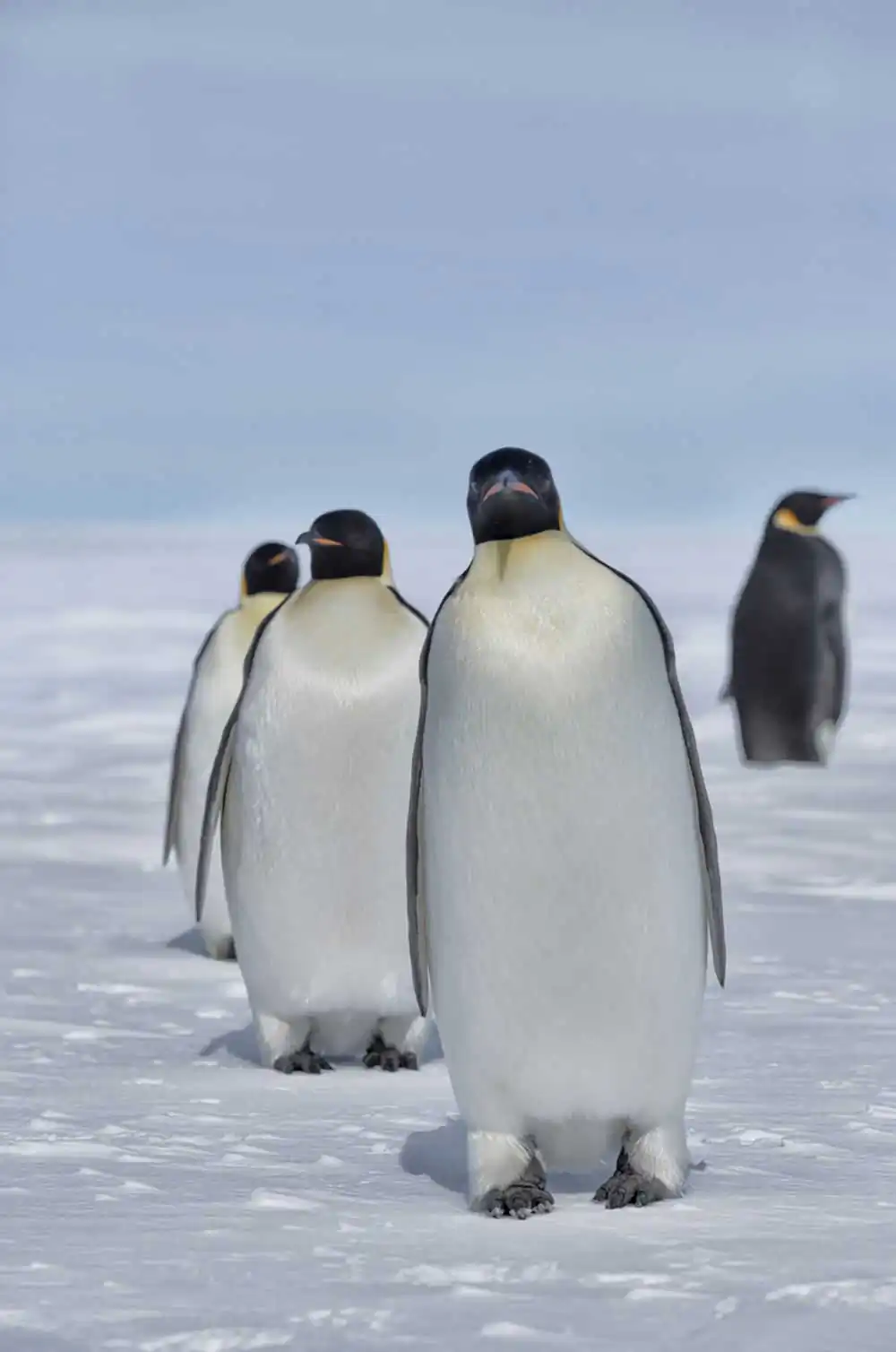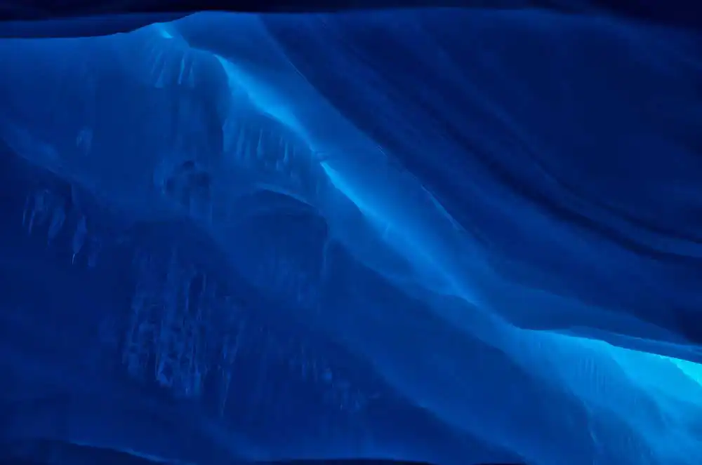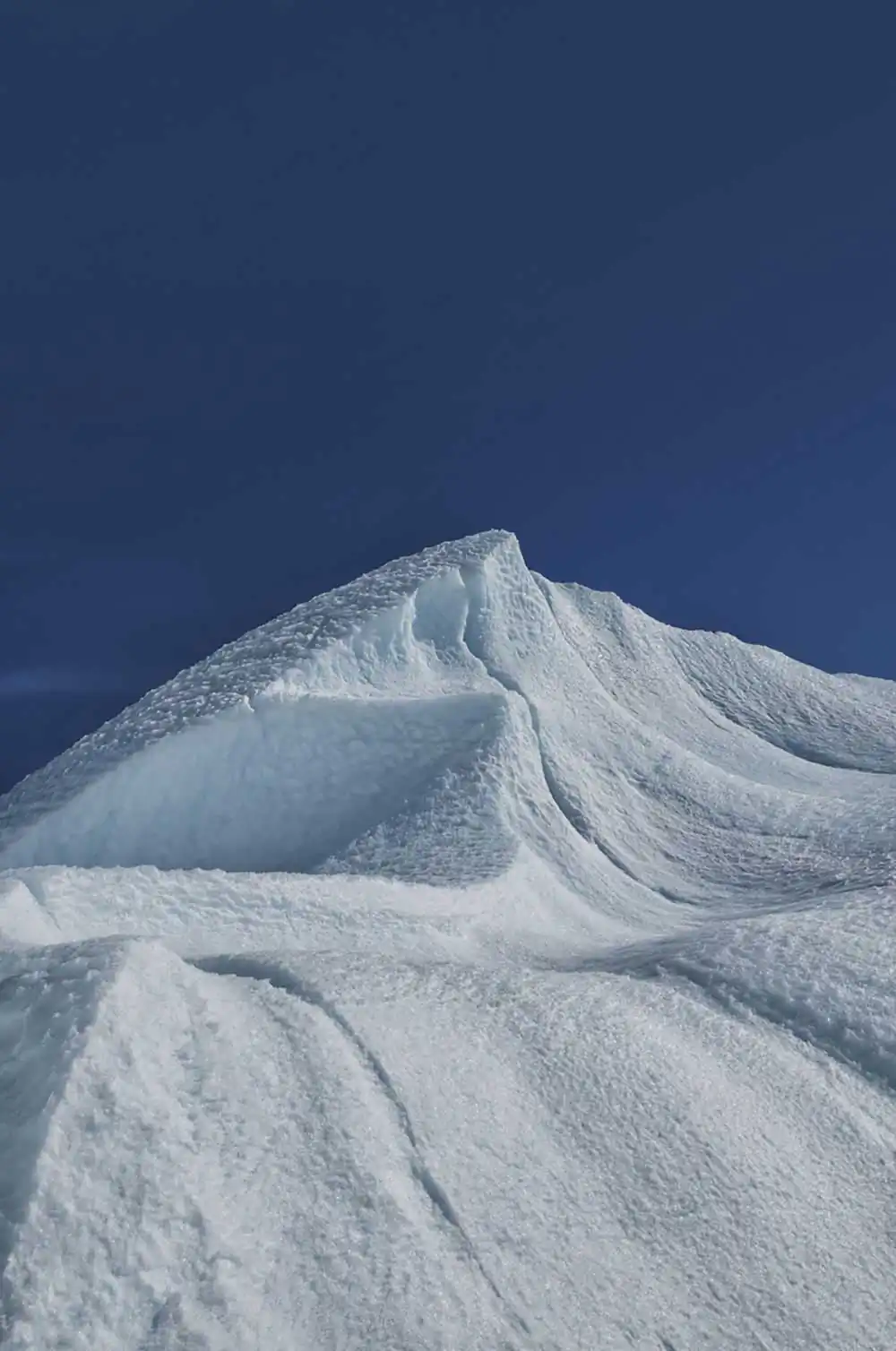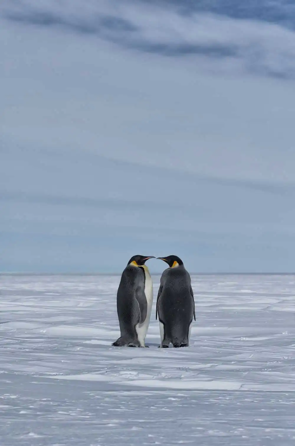 After arriving at the Wolf’s Fang Runway, the expedition settled in the Whichaway camp. A catalogue of the various tents at the camp demonstrates how different tent forms serve different purposes and how even in the farthest spots humans accomodate to their daily needs. Further, the environmental marvels of the region are documented – for example, the Blue Cave that exists for only a short period of time during the year catches our eye immediately. Its striking shade emerges because the ice layer around the cave is too thick for the light at the red end of the spectrum. The crowd-pleasing Emperor penguin colony in Atka Bay is also a great destination – due to the relatively low number of tourists the birds aren’t scared of humans, which allowed Daria Troitskaia to catch them striking poses. And last but not least, the South pole with the Amundsen-Scott South Pole station and the Dark Sector Laboratory housing approximately 150 people during the summer made it into the collection. Even the South Pole is a construct of human thought: the geographical pole moves approximately 10 meters every year, whereas the Ceremonial Pole is the symbolic space that travellers can visit.