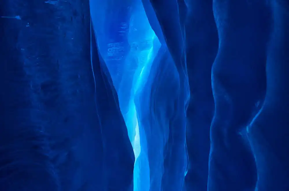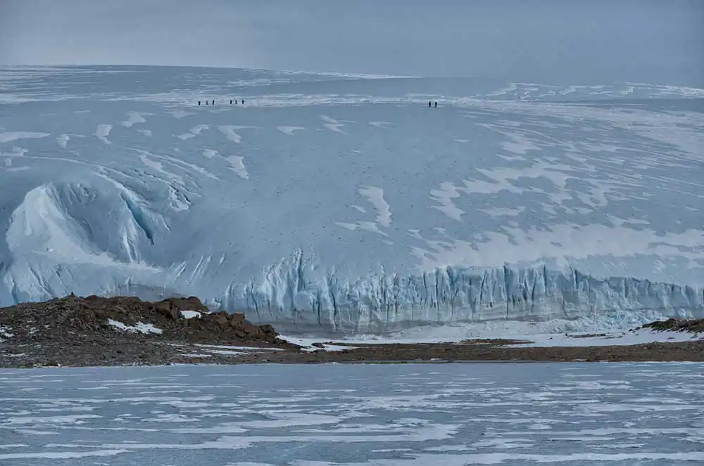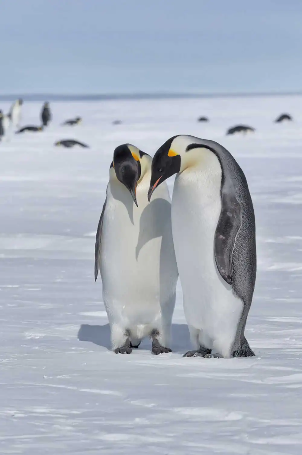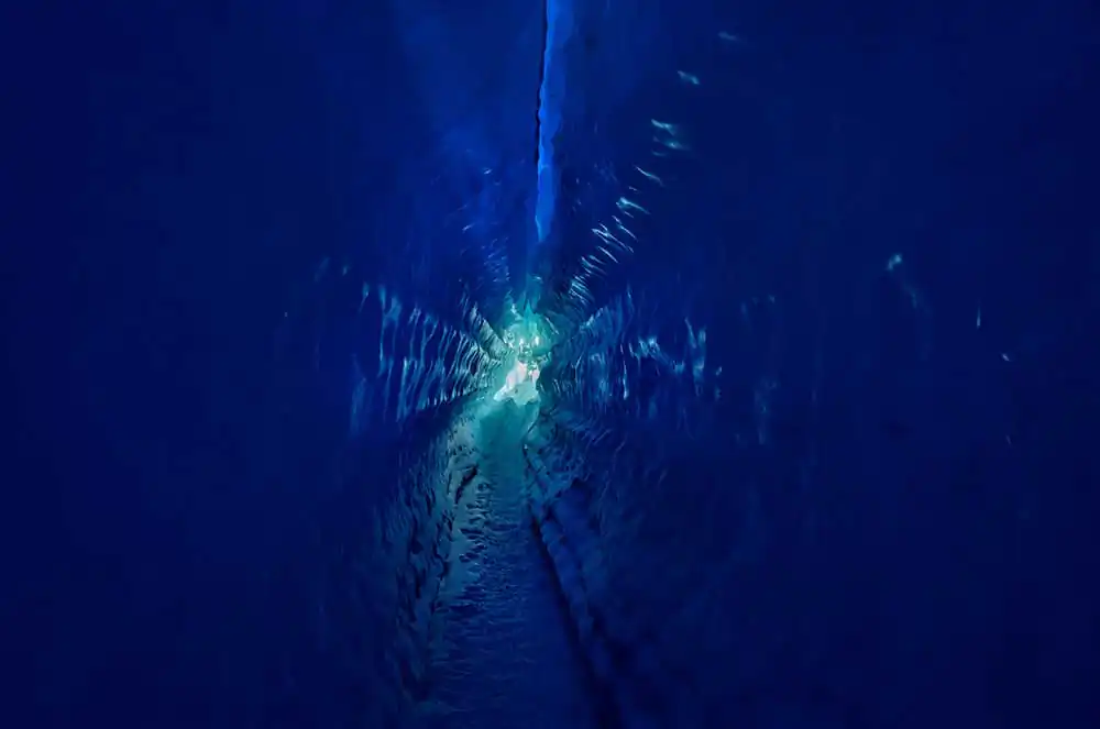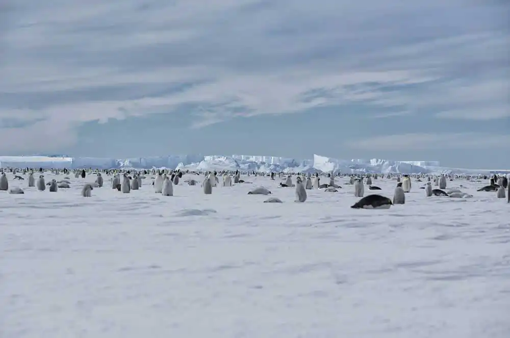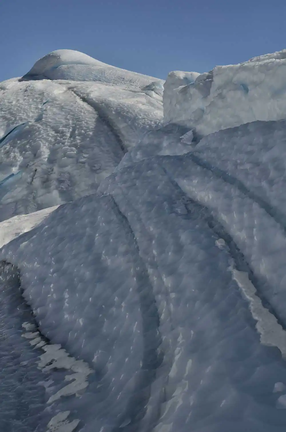 After arriving at the Wolf’s Fang Runway, the expedition settled in the Whichaway camp. A catalogue of the various tents at the camp demonstrates how different tent forms serve different purposes and how even in the farthest spots humans accomodate to their daily needs. Further, the environmental marvels of the region are documented – for example, the Blue Cave that exists for only a short period of time during the year catches our eye immediately. Its striking shade emerges because the ice layer around the cave is too thick for the light at the red end of the spectrum. The crowd-pleasing Emperor penguin colony in Atka Bay is also a great destination – due to the relatively low number of tourists the birds aren’t scared of humans, which allowed Daria Troitskaia to catch them striking poses. And last but not least, the South pole with the Amundsen-Scott South Pole station and the Dark Sector Laboratory housing approximately 150 people during the summer made it into the collection. Even the South Pole is a construct of human thought: the geographical pole moves approximately 10 meters every year, whereas the Ceremonial Pole is the symbolic space that travellers can visit.