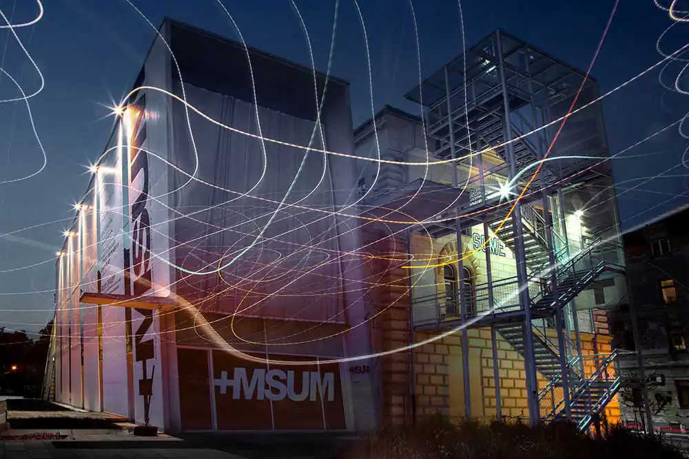 Building of MSUM (Museum of Contemporary art Metelkova) at night. It opened in 2011 as Slovenia’s first museum in the 21st century. It has a unique shape that interwines old and new architecture.