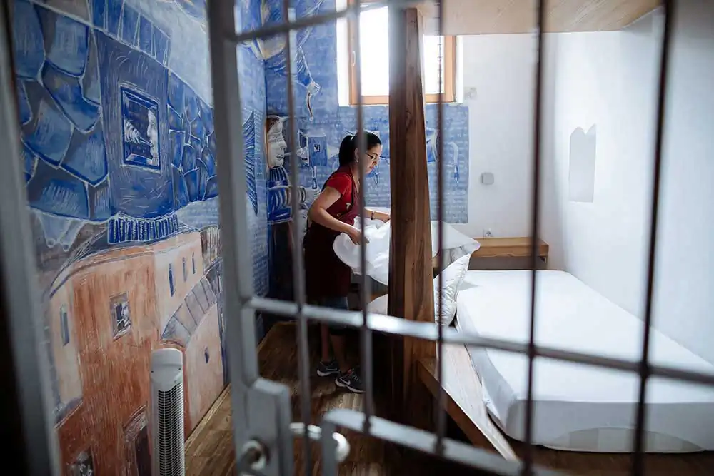Artistic carpenter Dejan Pfeifer upgrades knowledges of the old masters, embedding materials like rocks into the wood.Part of military barracks was also a prison now turned into one of the most interesting hostels in the world where you can sleep in what used to be prison cells. Each cell is furnished and decorated by different artists who gave the cells new life and turned a dark historical prison building into a space for a unique travelling experience. Yanet is a part of the housekeeping staff working in Hostel Celica. She moved to Slovenia from Cuba after she met her husband who is Slovene. Slovenia is her second home and working in the hostel greatly helped her to learn the complex sloveninan language.The Southern part is full of large even surfaces and is a shelter to one of many subcultures of Metelkova – Skaters.