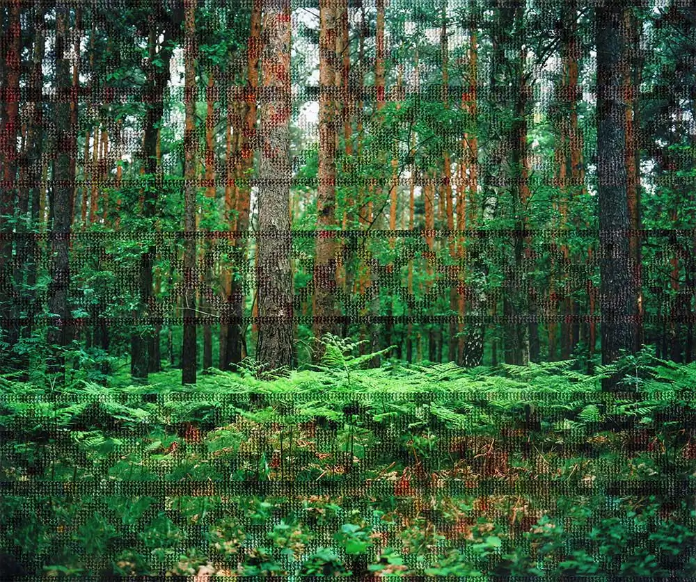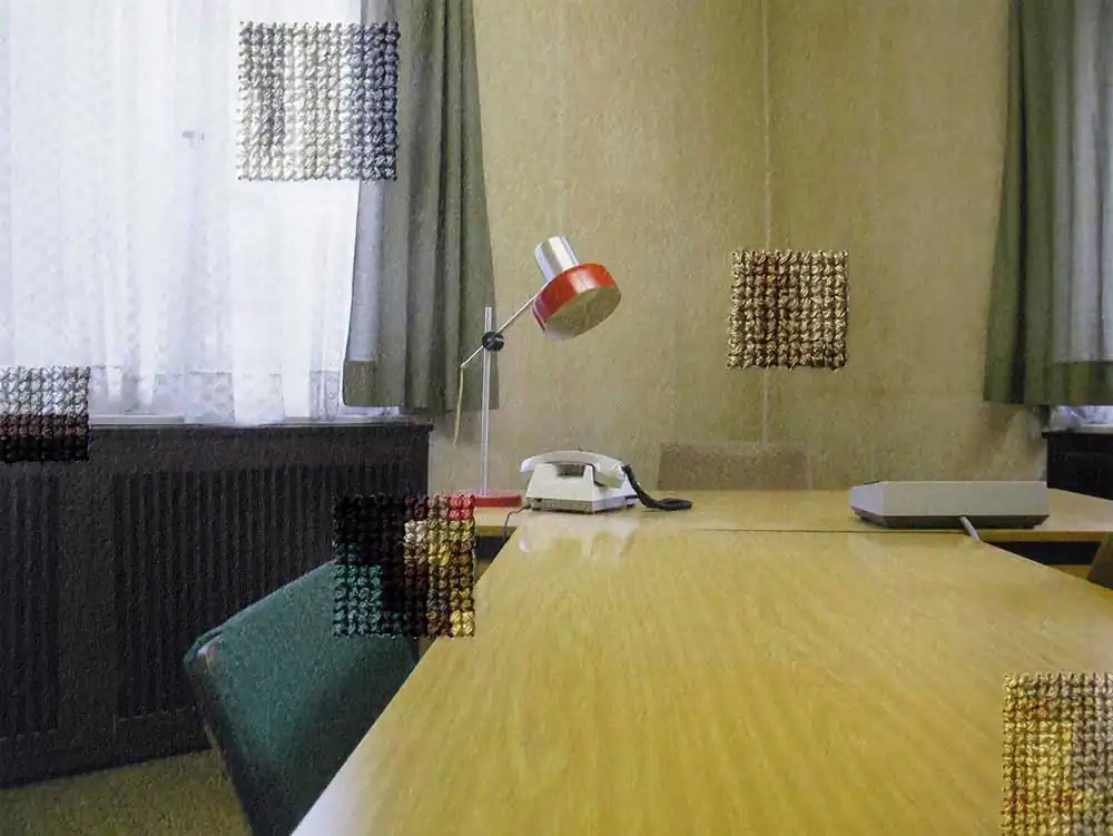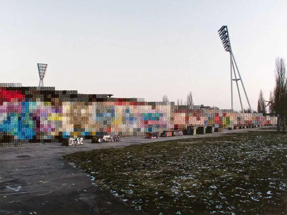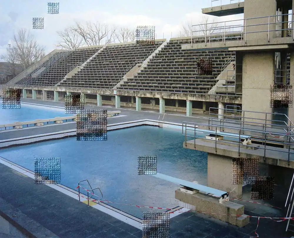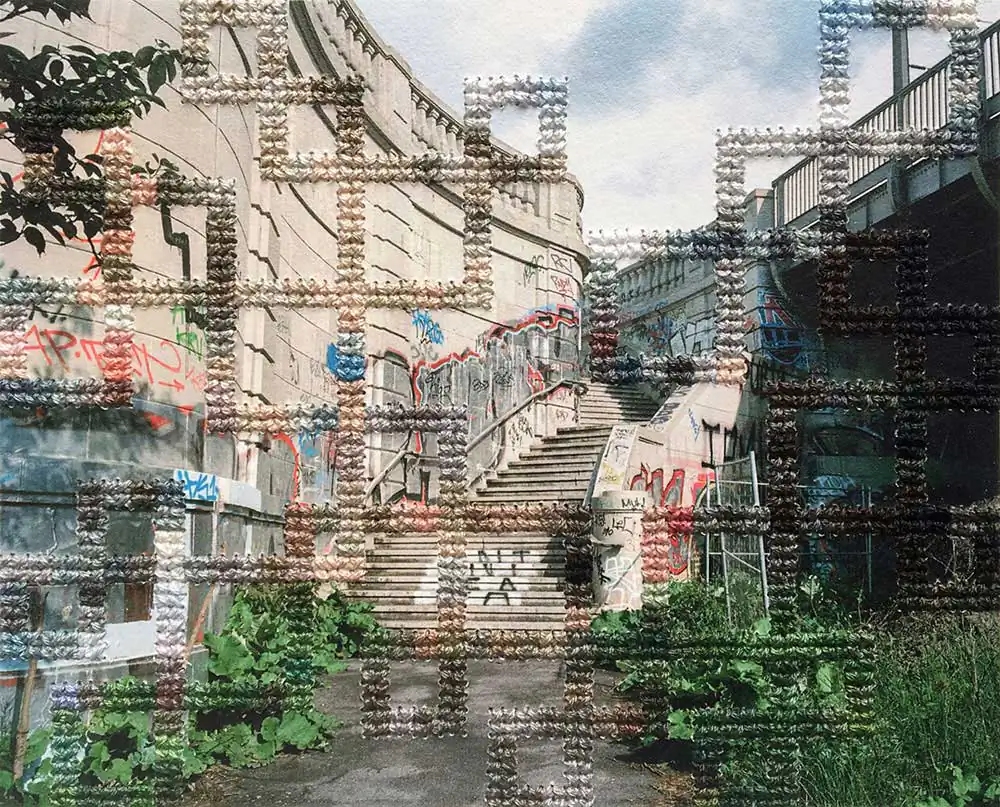 Sections of the photographs have been obscured by cross- stitch embroidery, sewn directly into the photograph. This stitching is a signature mark of the artist across her artworks. The embroidery is made to resemble pixels and borrows the visual language of digital imaging in an analog, tactile process. In many images, the embroidered sections represent the exact scale and location of the former Wall offering a pixelated view of what