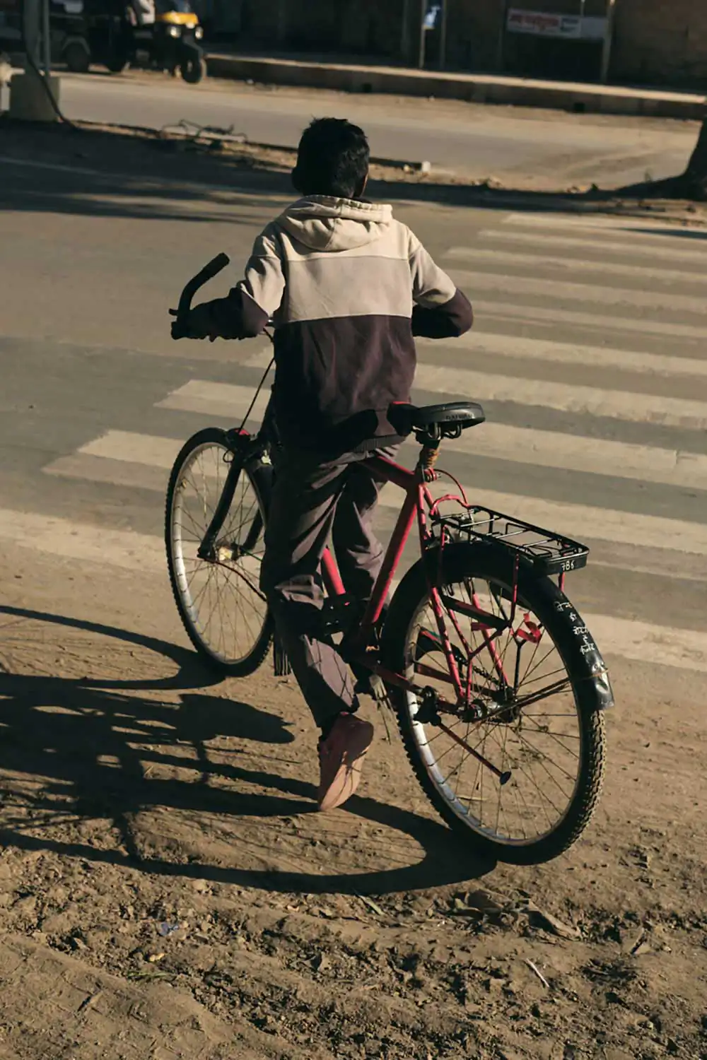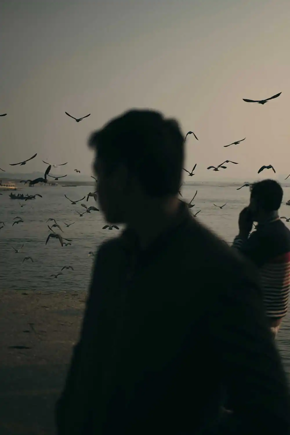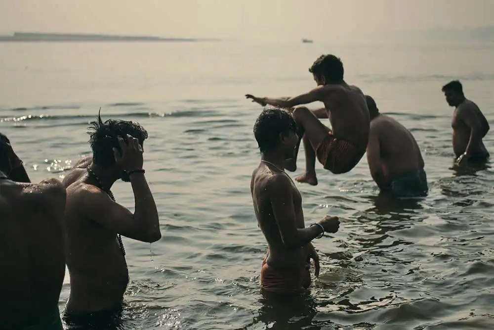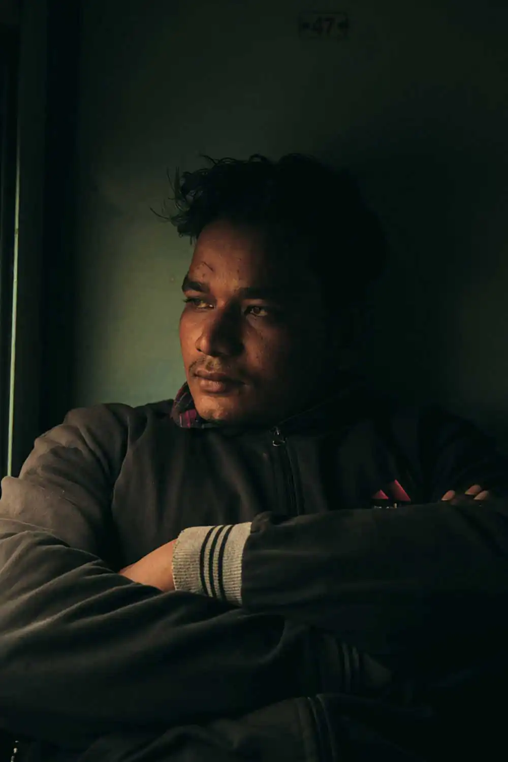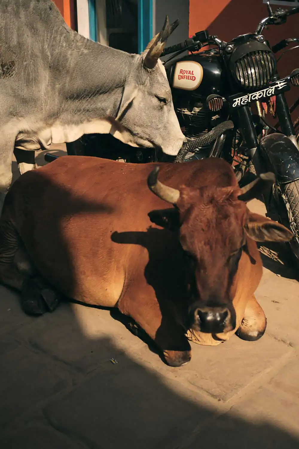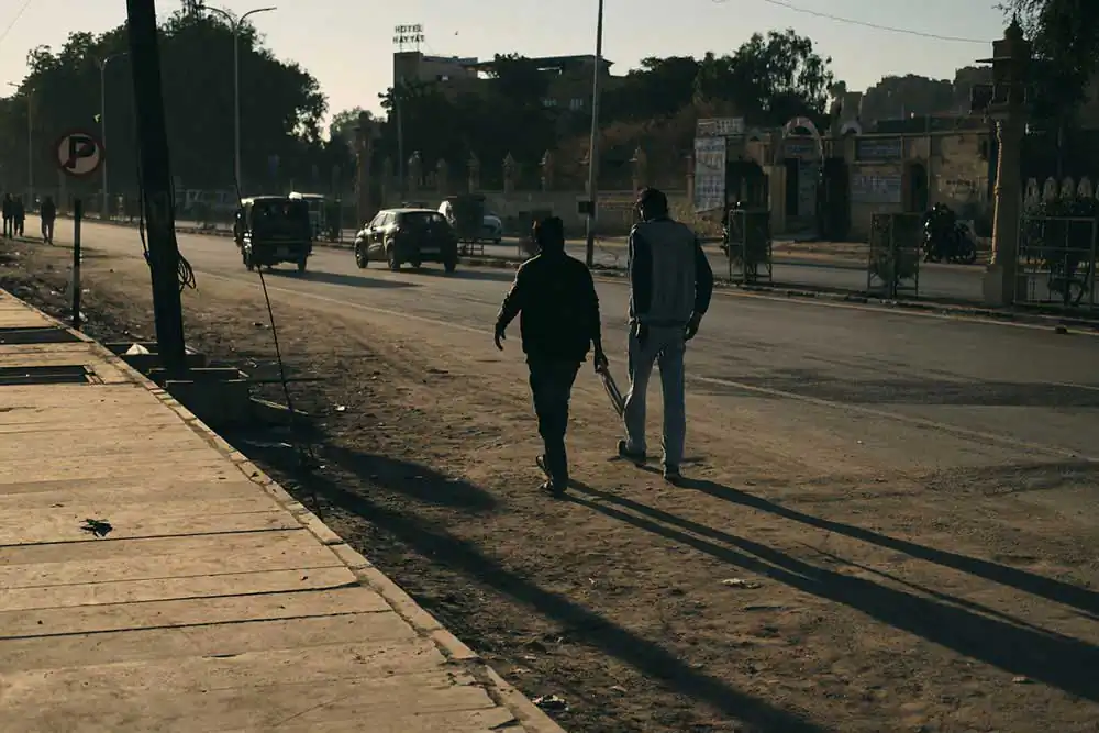 He takes his body along the carriage, dragged by his arms. We give him a cigarette, but we can’t light it, as the matches don’t work. It’s night time now and it’s getting cold. We leave Pushkar in the morning in a car that won’t start, driving through bumpy roads, vehicles dance in choreographed chaos, with cows roaming the streets. The carriage doors are open, so I lean out, careful not to fall. My heart is pumping, I can hear it, as the light comes down on the railway tracks.