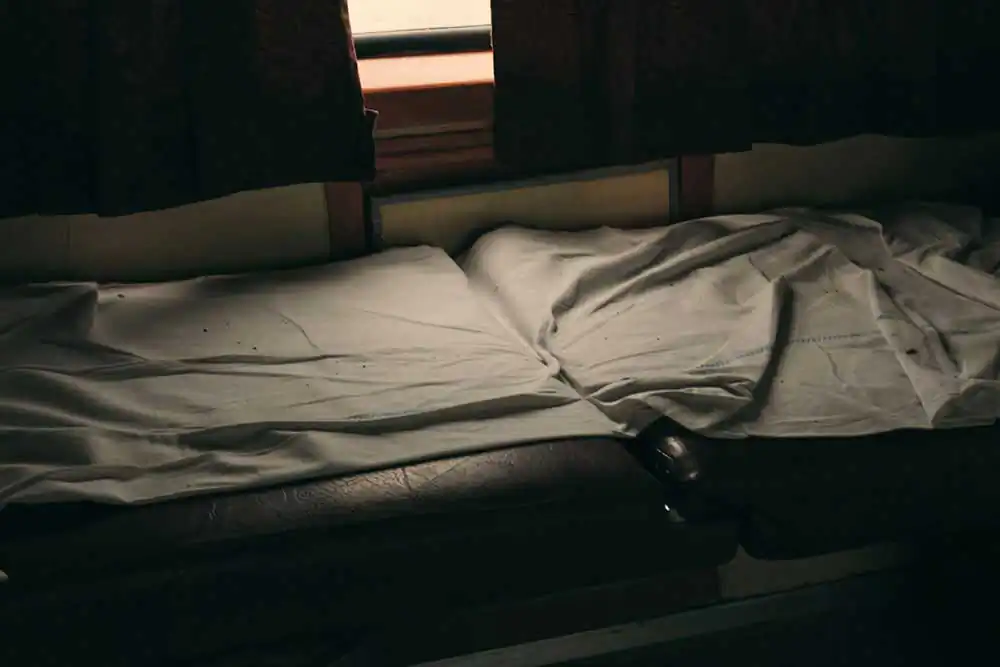 The light begins to fade as it travels through the windows, and into the blue sleeper carriages. Milky yellow clouds hover over the landscape as we fall asleep under white blankets. People come and go. More chai tea and something to eat wrapped in newspaper. Reading a book with the cover torn off.