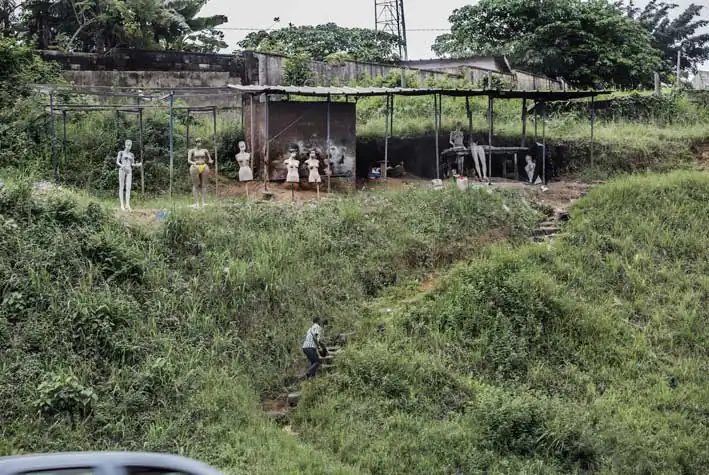 The more I look , the more I ‘ see ‘ them … as human presences. Some irritate me, others amuse me , sadden me and move me. As time goes by, my subconscious gets used to this little obsession .. I cross the same streets, the same areas of Abidjan, I familiarize myself with some of these mannequins, and I begin to see them as people frozen in time and space. I also note that most mannequins are manufactured locally, and I spot several places of handcrafted mannequins, by the road. I want to understand why. Why are locally made mannequins in white ? in an african country as Ivory Coast? Why are these human presences with sad facial expressions? Some faces seem about to break into tears.