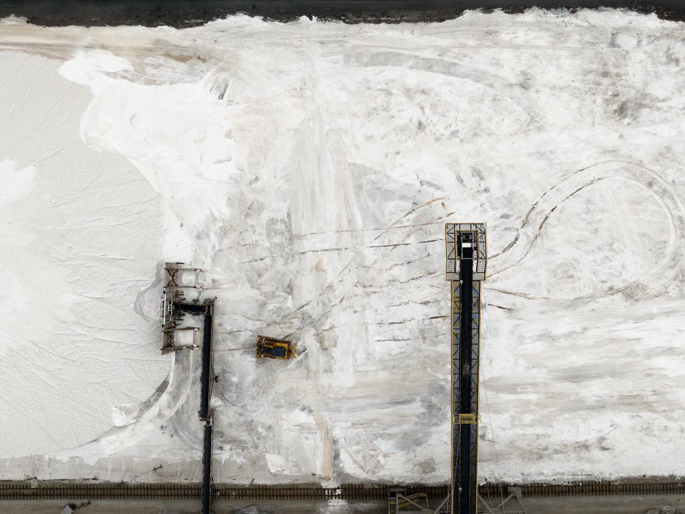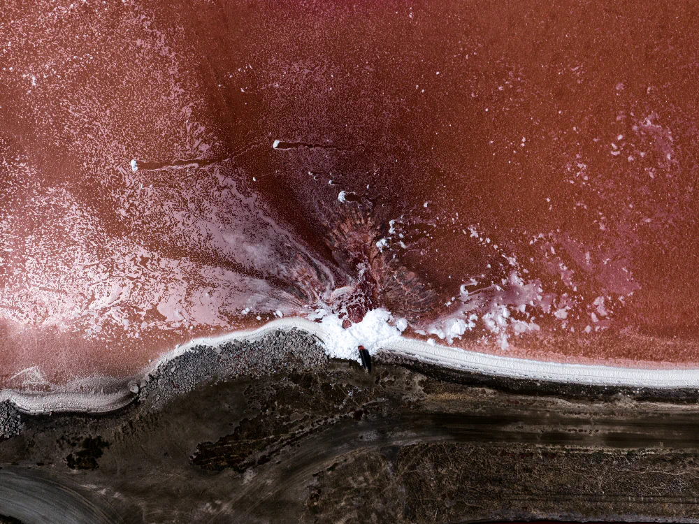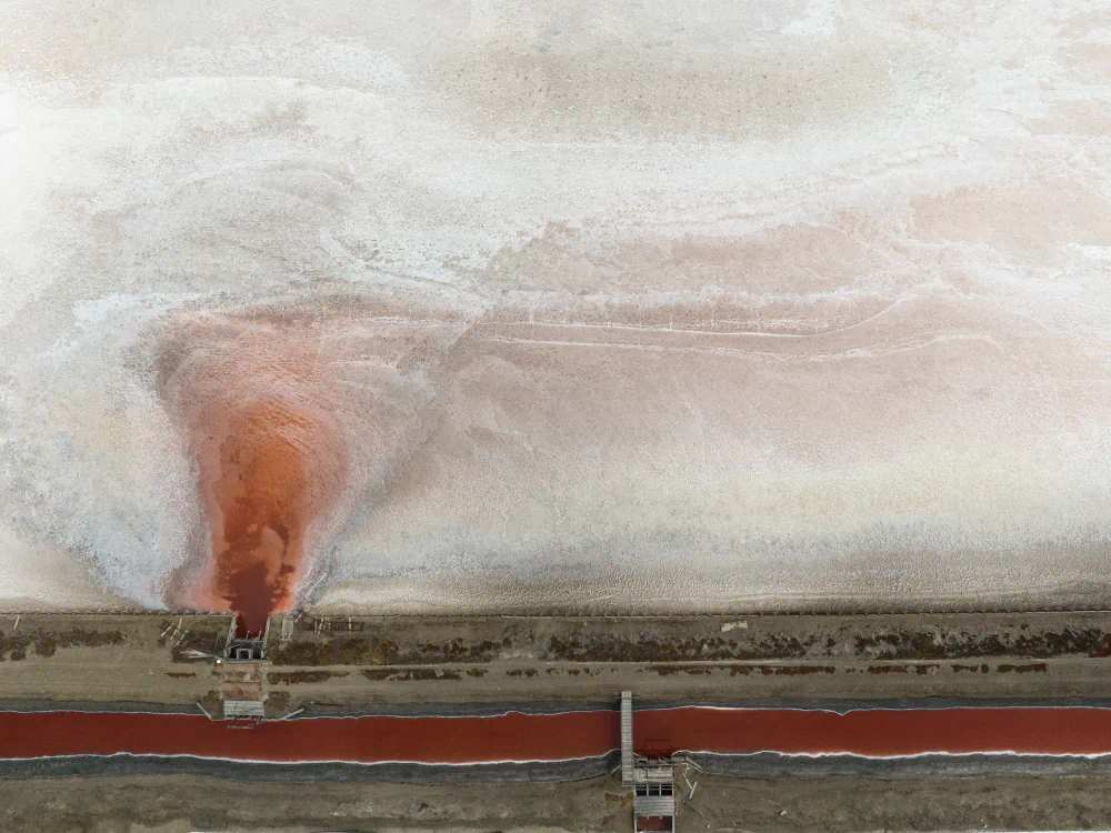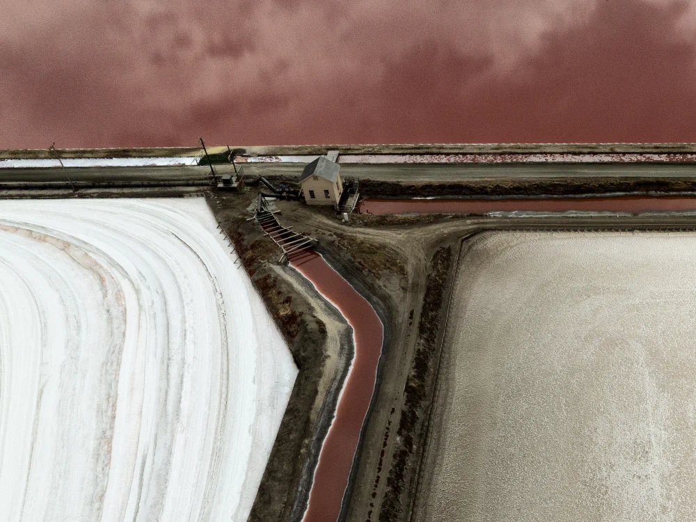 To extract hundreds of thousands of tons of salt each year for kitchens, dining tables, and icy roads, the Bay’s blue green water is channeled through a series of evaporation ponds, becoming redder as increasing saline levels allow only the most resilient microorganisms to survive. Among the ponds now lie signs of a fading, feeble salt industry: teetering wooden sluice gates that still channel increasingly saline water; rusting rail structures once used to move salt train cars from west to east; and heavy front loaders still pushing white saline mounds toward the horizon.