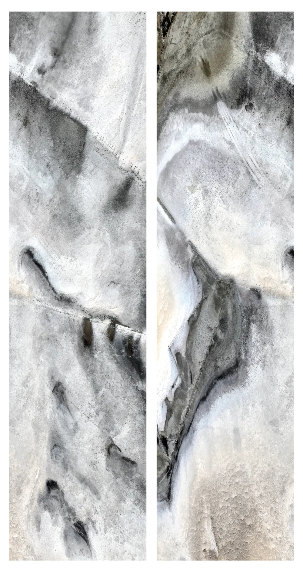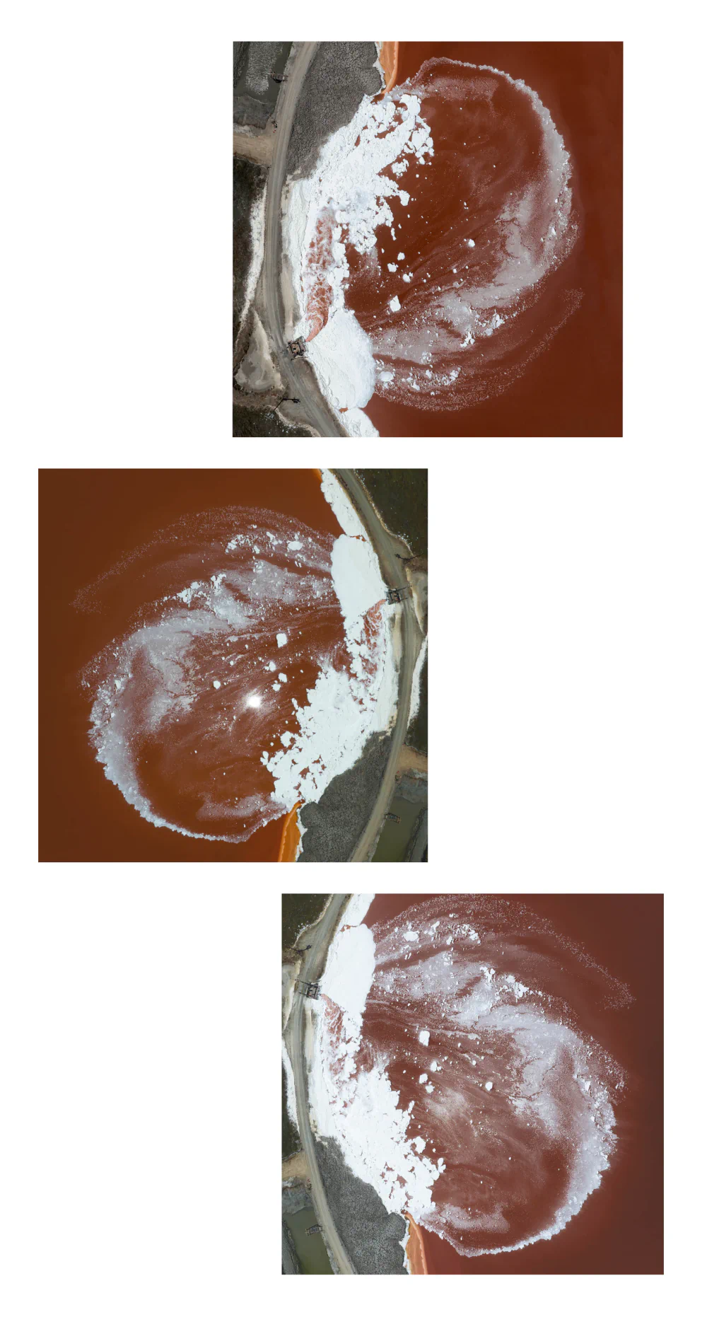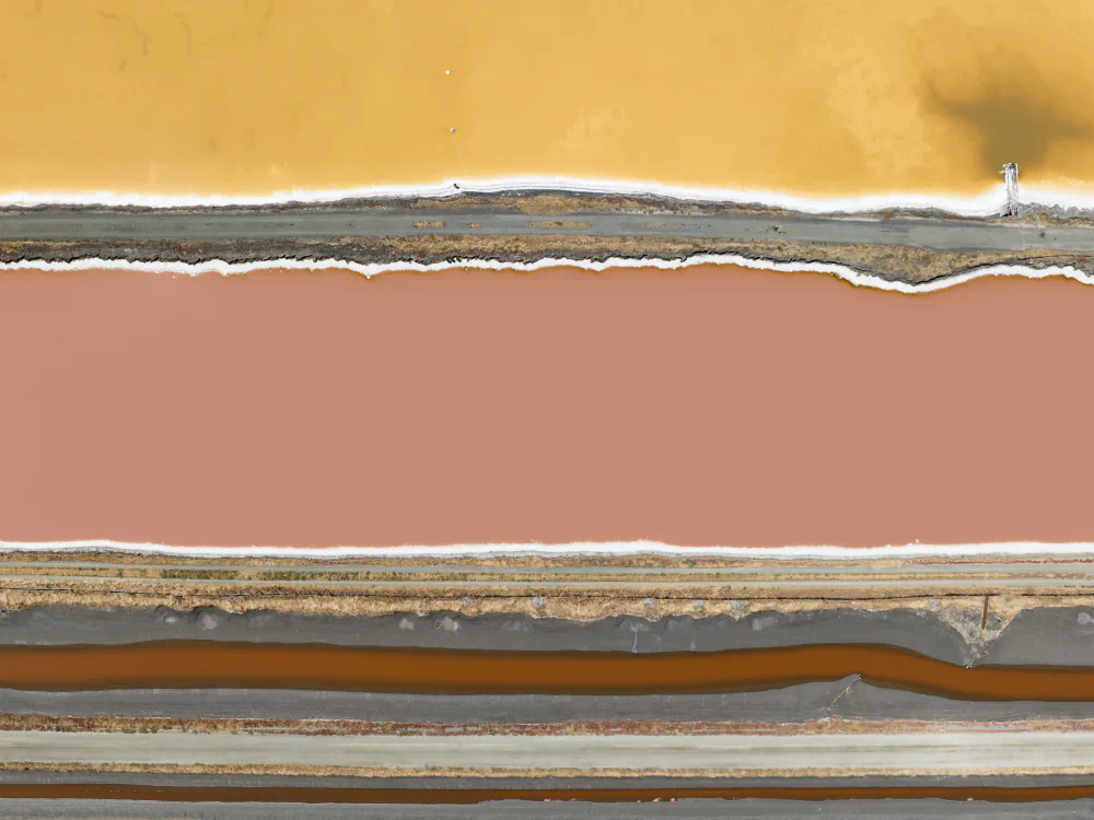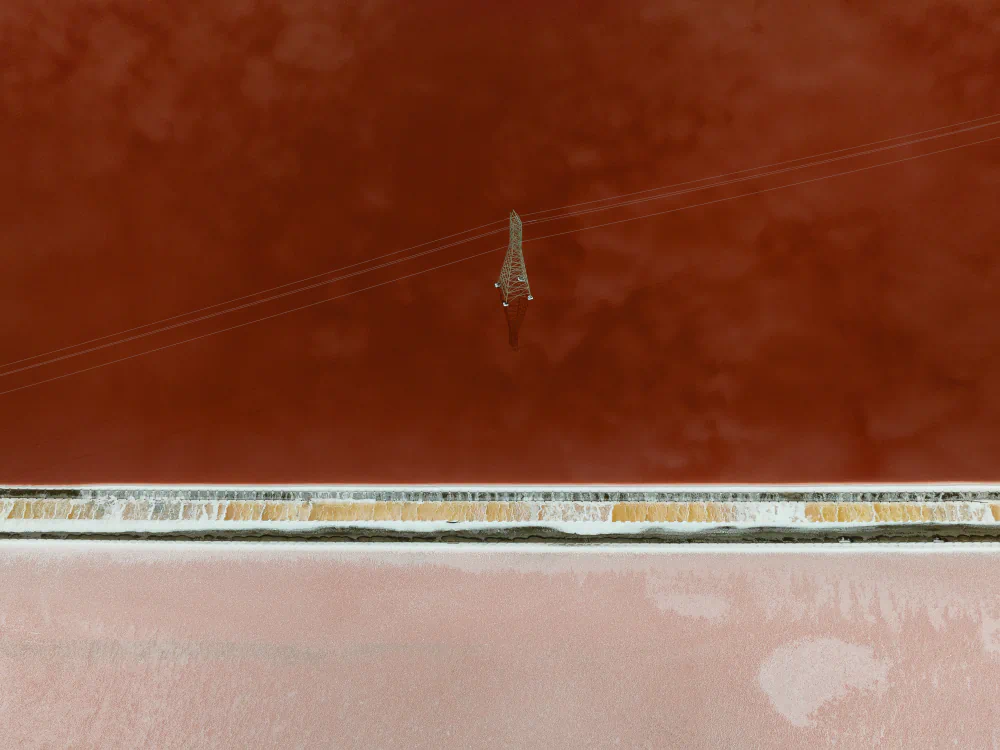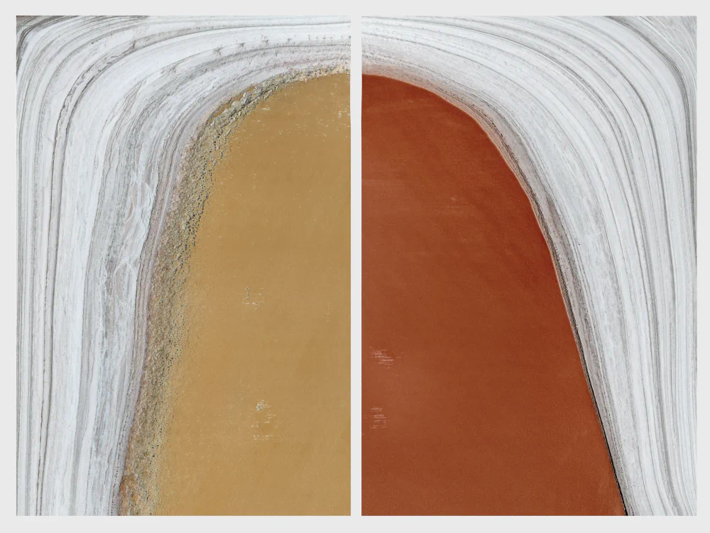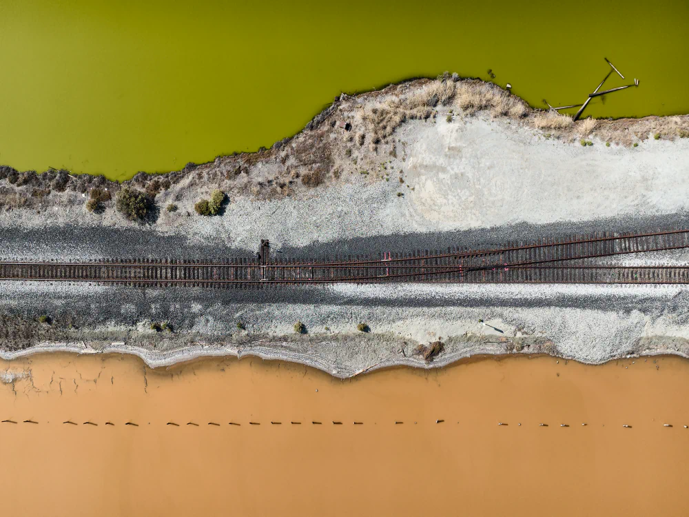 Bayscapes documents this surreal, almost alien landscape just as the tide turns. The community driven South Bay Salt Pond Restoration Project, one of the largest tidal wetland restoration projects, is actively transforming acres of salt evaporation ponds back into tidal marshlands, mudflats, and wetlands. In doing so, the intent is to boost biodiversity, provide flood protection against sea level rise, and restore native habitats. Indeed, images from recent years, when examined more carefully, capture not just yesterday’s industry but also flocks of small shorebirds hovering over the remnant foundations of a bridge, just one of the clues of ecological reclamation taking hold. As federal interest and support for environmental efforts remain under active threat, the artists intend that the raw, unaltered colorations and desolation in these images inspire continued, vigorous support for restoring what was lost and fostering a newly vibrant era for the San Francisco Bay, buttressing California’s pivot from industrial exploitation to environmental rejuvenation.