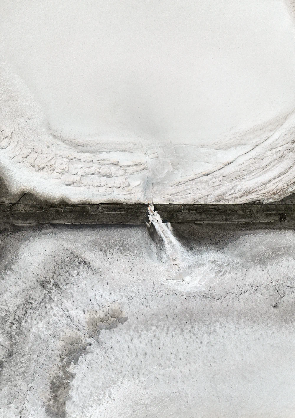 In their recent work, they often employ a camera mounted on drone technology. Hovering at roughly one hundred to three hundred feet, the drone serves as a mobile tripod, capturing scenes devoid of the grounding horizon line common to most landscape images. The mystery and translucency of these horizonless scenes are heightened by their embrace of the imperfection laden beauty of Japanese handcrafted papers and accentuated by their infusion of encaustic wax. Drawing on their backgrounds in psychology and technology, they emphasize the psychological tensions