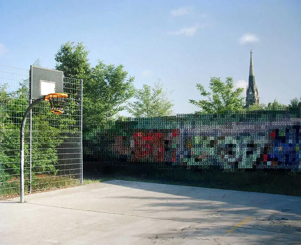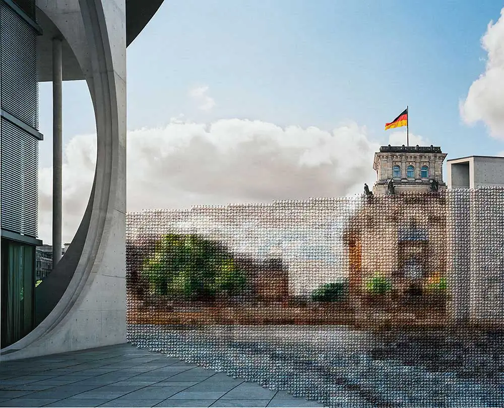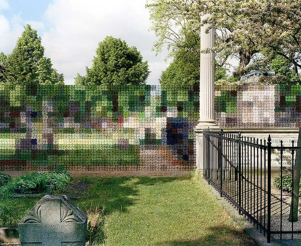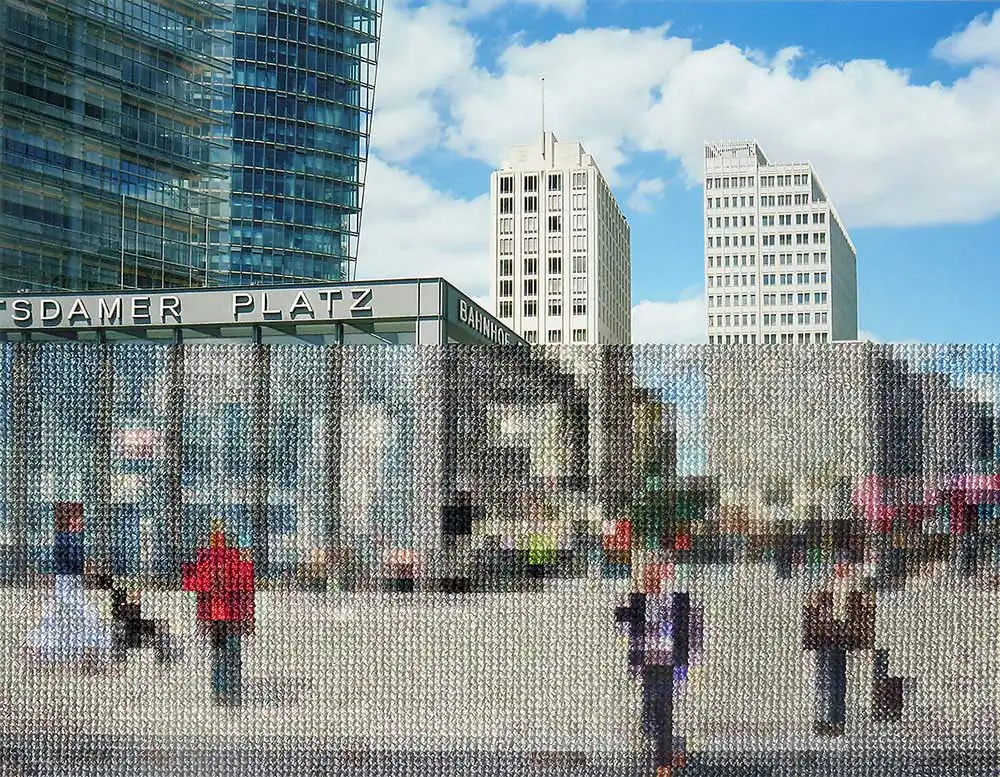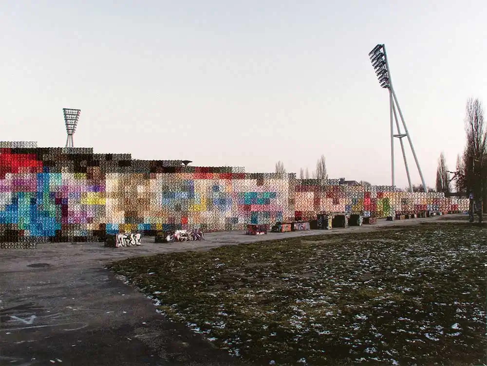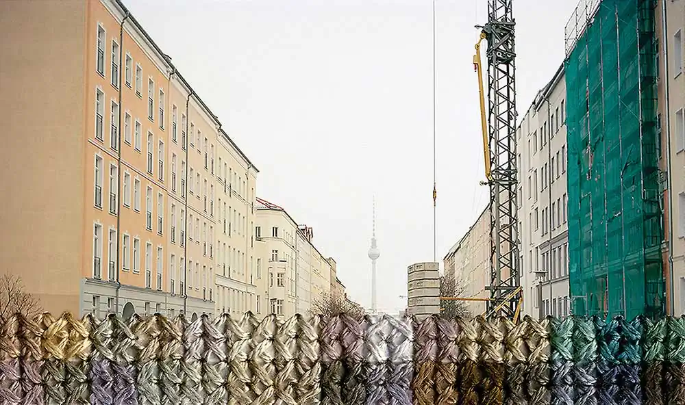 The images were taken in the city center as well as the outskirts of city where I followed the former path of the wall through suburbs and forests. I was particularly interested in photographing locations where no visible traces of the actual wall remain but where one can still see subtle clues of its previous existence. Often the embroidered sections of the image run along the horizon line forming an unnatural separation that blocks the viewer. This aspect of the sewing emphasizes the unnatural boundaries created by the wall itself. [Official Website]